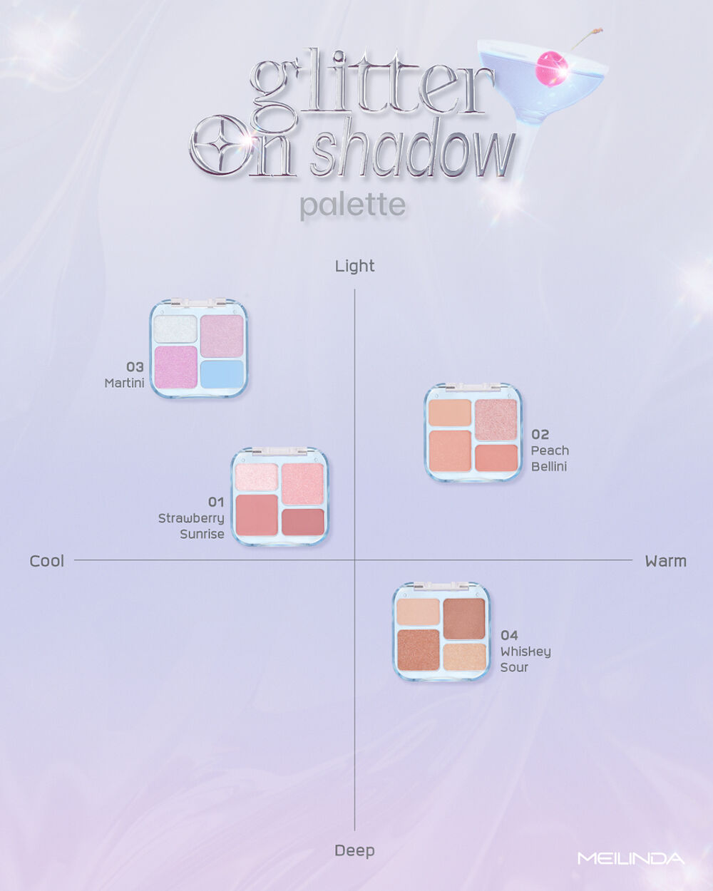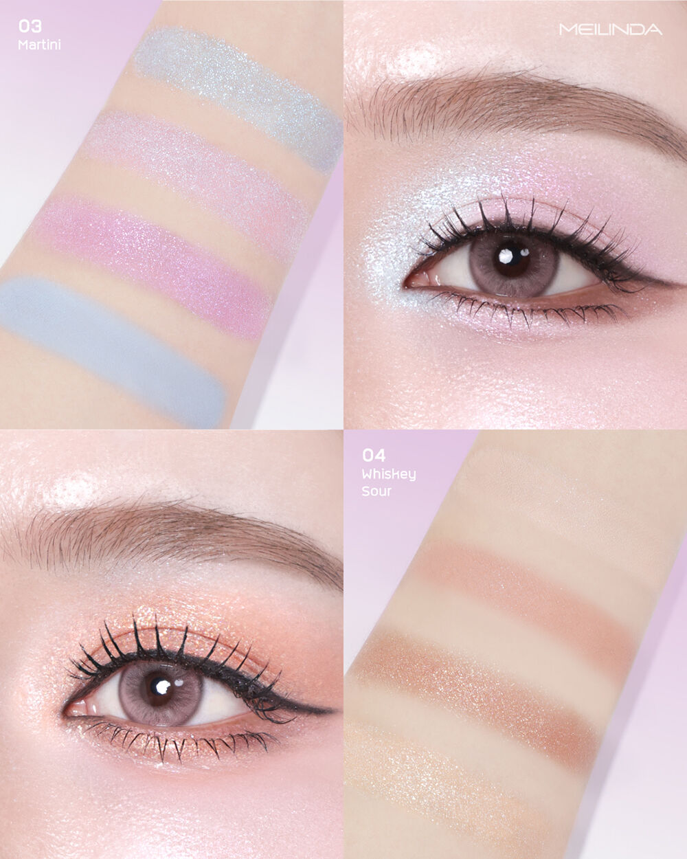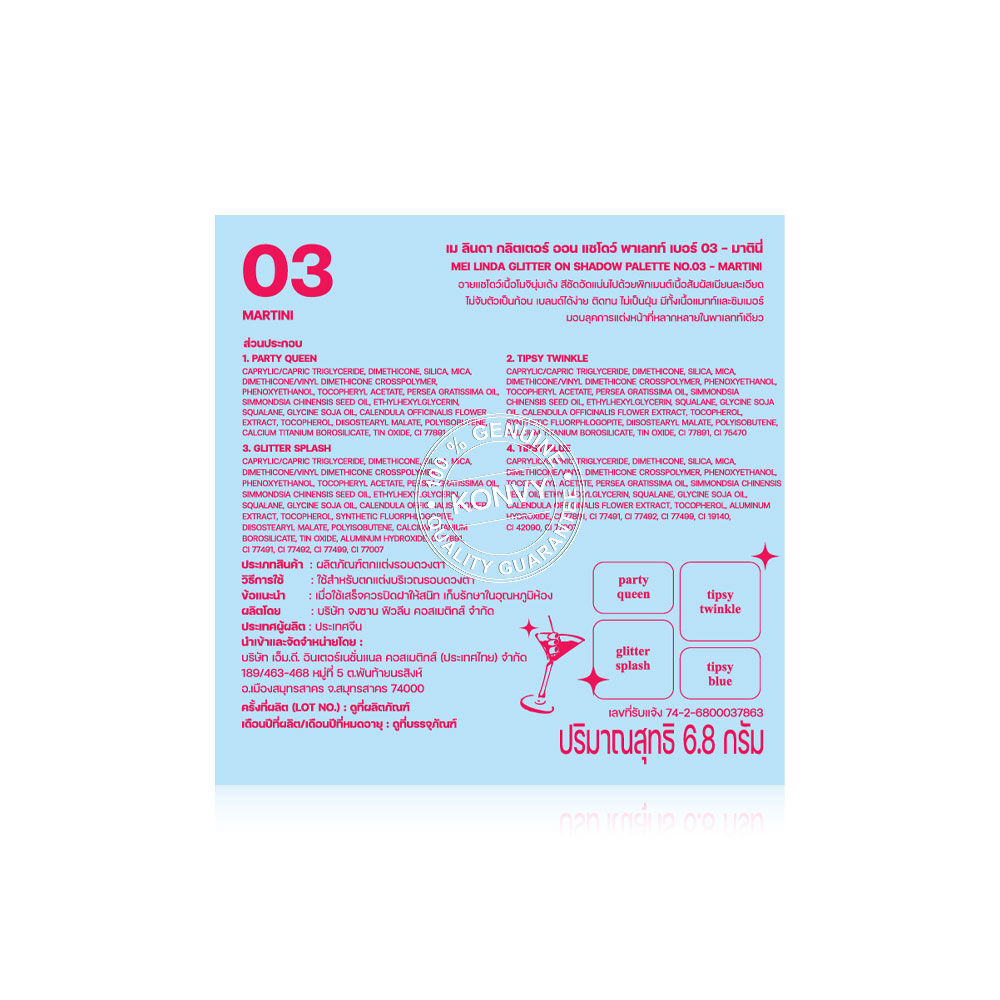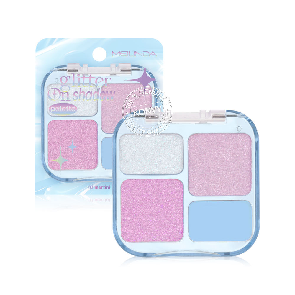 Mei Linda Glitter On Shadow Palette 6.8g #03 Martini พาเลทอายแชโดว์ 4 สี เนื้อสัมผัสเนียนละเอียด ไม่จับตัวเป็นก้อน พิกเมนต์สีชัด เกลี่ยง่าย ไม่เป็นฝุ่น ติดทนนาน มีทั้งเนื้อแมทและชิมเมอร์ ผสานส่วนผสมจาก Jojoba Oil, Avocado Oil และ Squalane ช่วยบำรุงผิวให้เนียนนุ่ม ชุ่มชื้น มอบฟินิชลุคที่หลากหลาย ครีเอทได้ในพาเลทเดียว