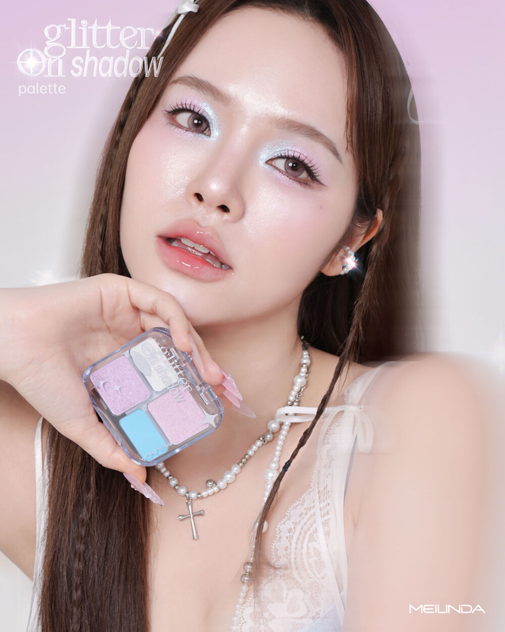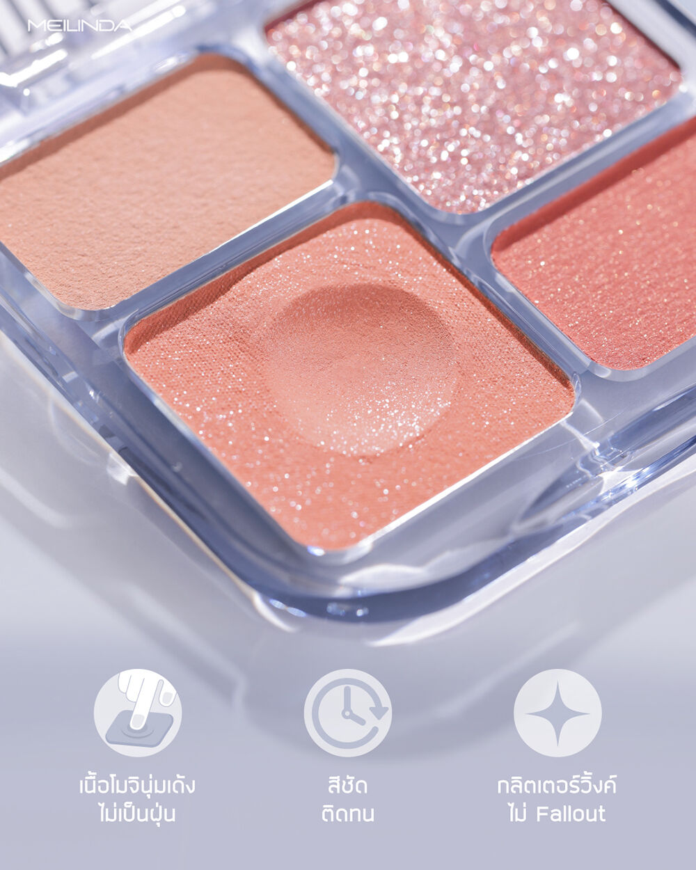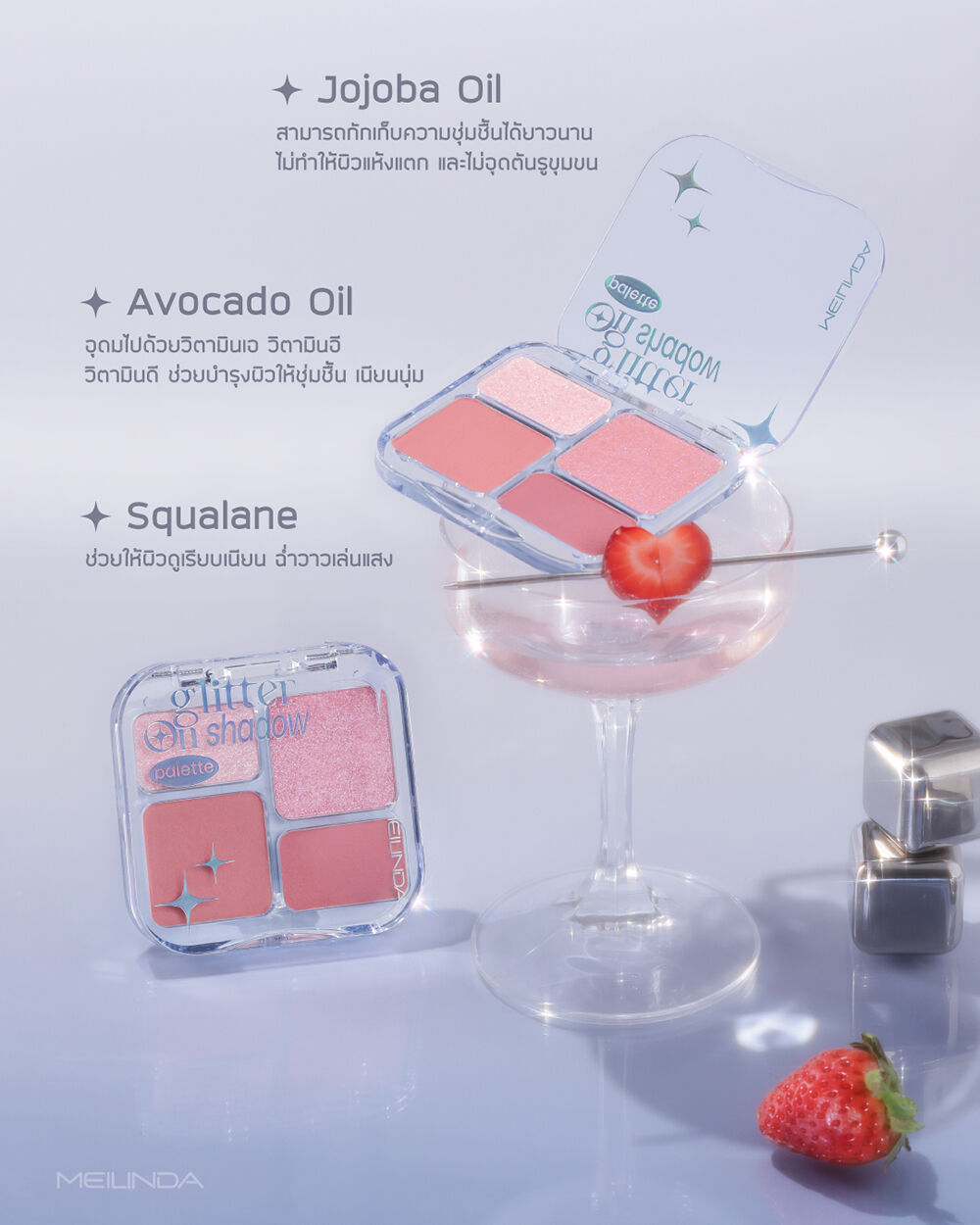 Mei Linda Glitter On Shadow Palette 6.8g #03 Martini พาเลทอายแชโดว์ 4 สี เนื้อสัมผัสเนียนละเอียด ไม่จับตัวเป็นก้อน พิกเมนต์สีชัด เกลี่ยง่าย ไม่เป็นฝุ่น ติดทนนาน มีทั้งเนื้อแมทและชิมเมอร์ ผสานส่วนผสมจาก Jojoba Oil, Avocado Oil และ Squalane ช่วยบำรุงผิวให้เนียนนุ่ม ชุ่มชื้น มอบฟินิชลุคที่หลากหลาย ครีเอทได้ในพาเลทเดียว
