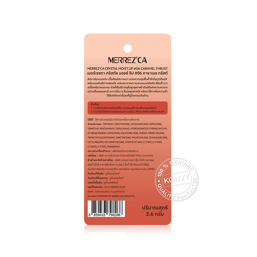Merrezca Crystal Moist Lip 3.6g #06 Caramel Thrust เปล่งประกายความฉ่ำโกลว์แบบ effortless ในทุกวัน ด้วยลิปบาล์มเนื้อบางเบาที่ให้ความรู้สึกเบาสบายเหมือนไม่ได้ทา พร้อมมอบความเงาวาวแบบใสสะท้อนแสงดั่งคริสตัล ให้ริมฝีปากดูอิ่มฟูแลดูสุขภาพดีอย่างเป็นธรรมชาติ ด้วยเทคโนโลยี Crystal Light Diffusion™ ที่ช่วยกระจายแสงให้ริมฝีปากดูมีมิติ พร้อมมอบสัมผัสเย็นนุ่มและเนื้อสัมผัสละลายแนบไปกับริมฝีปาก ช่วยให้ริมฝีปากนุ่มชุ่มชื้นได้โดยไม่เหนียวเหนอะหนะ ใช้เดี่ยวๆ ก็ดูใสสวย หรือทาทับลิปสติกเพื่อเพิ่มความฉ่ำวาวอย่างมือโปร