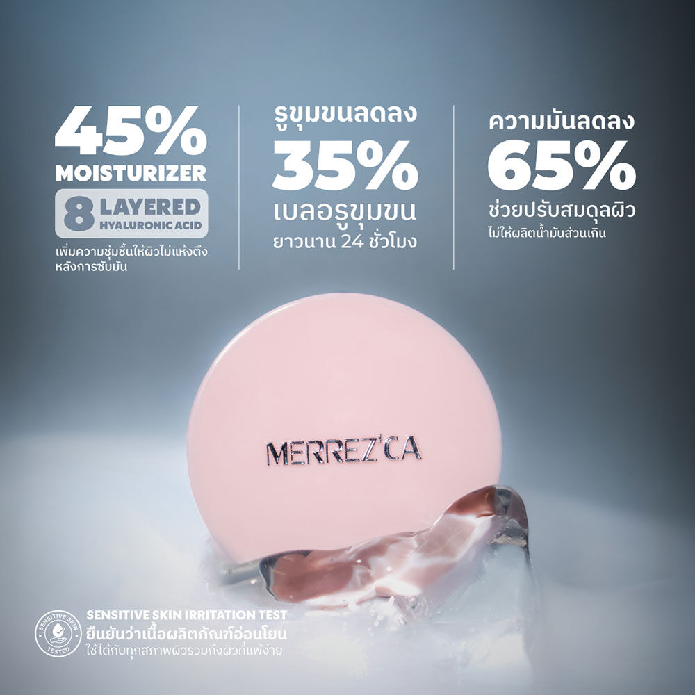 Merrezca Invisible Oil Control Cushion 2g คุชชั่นซับมันเนื้อเจลไร้สี สัมผัสใหม่ของไพรเมอร์ในรูปแบบคุชชั่น ที่รวมพลังการ Cooling + Blurring + Moisturizing ไว้ในขั้นตอนเดียว ออกแบบมาเพื่อตอบโจทย์ทุกปัญหาผิวของคนหน้ามัน รูขุมขนชัด และเมคอัพไม่ติดทน มอบฟินิชแบบแมทนุ่มลื่น (Silky-Matte) ที่ไม่แห้ง ไม่ตึง ไม่ก่อให้เกิดการอุดตัน