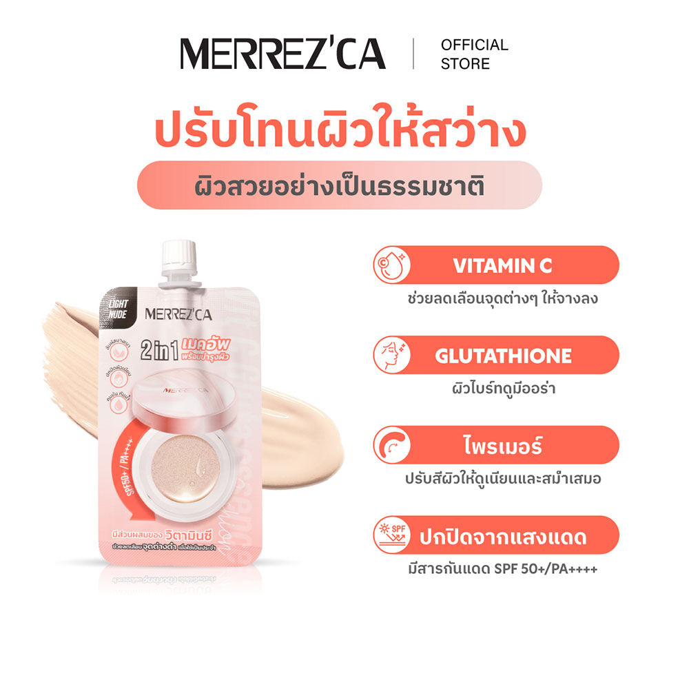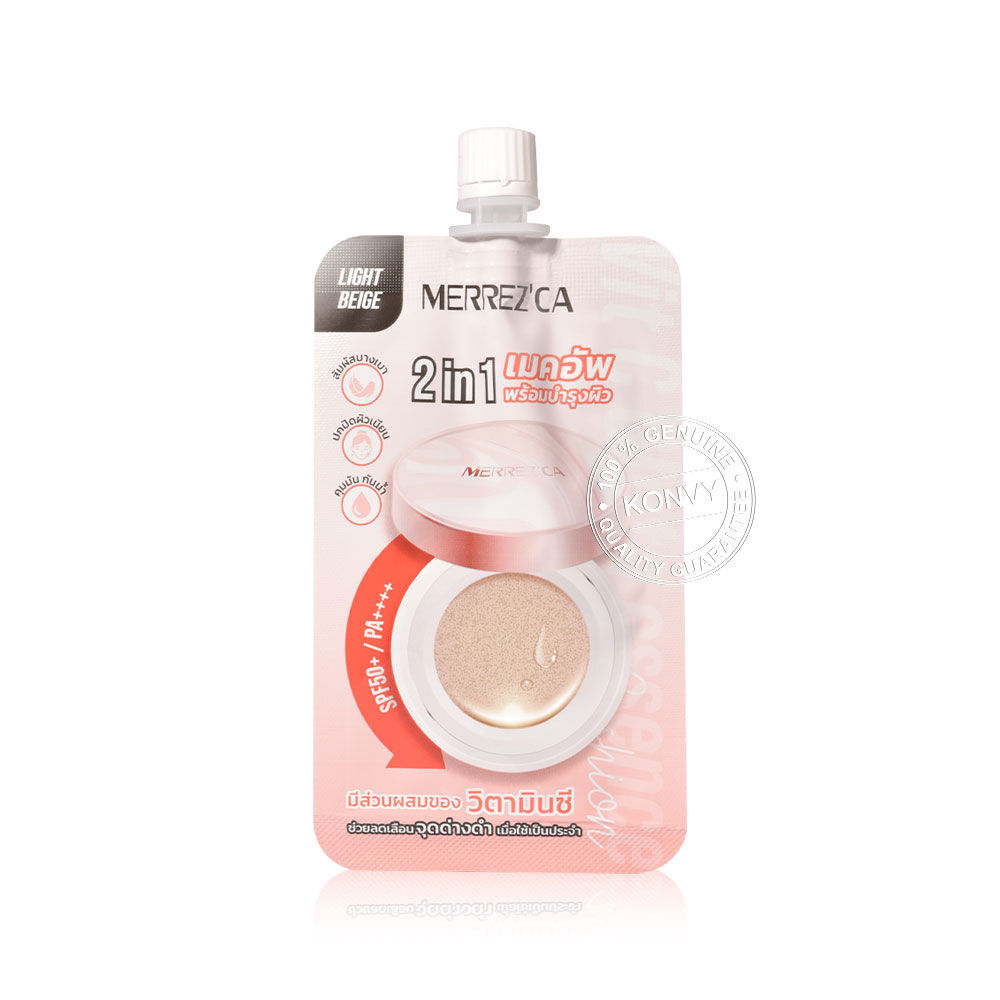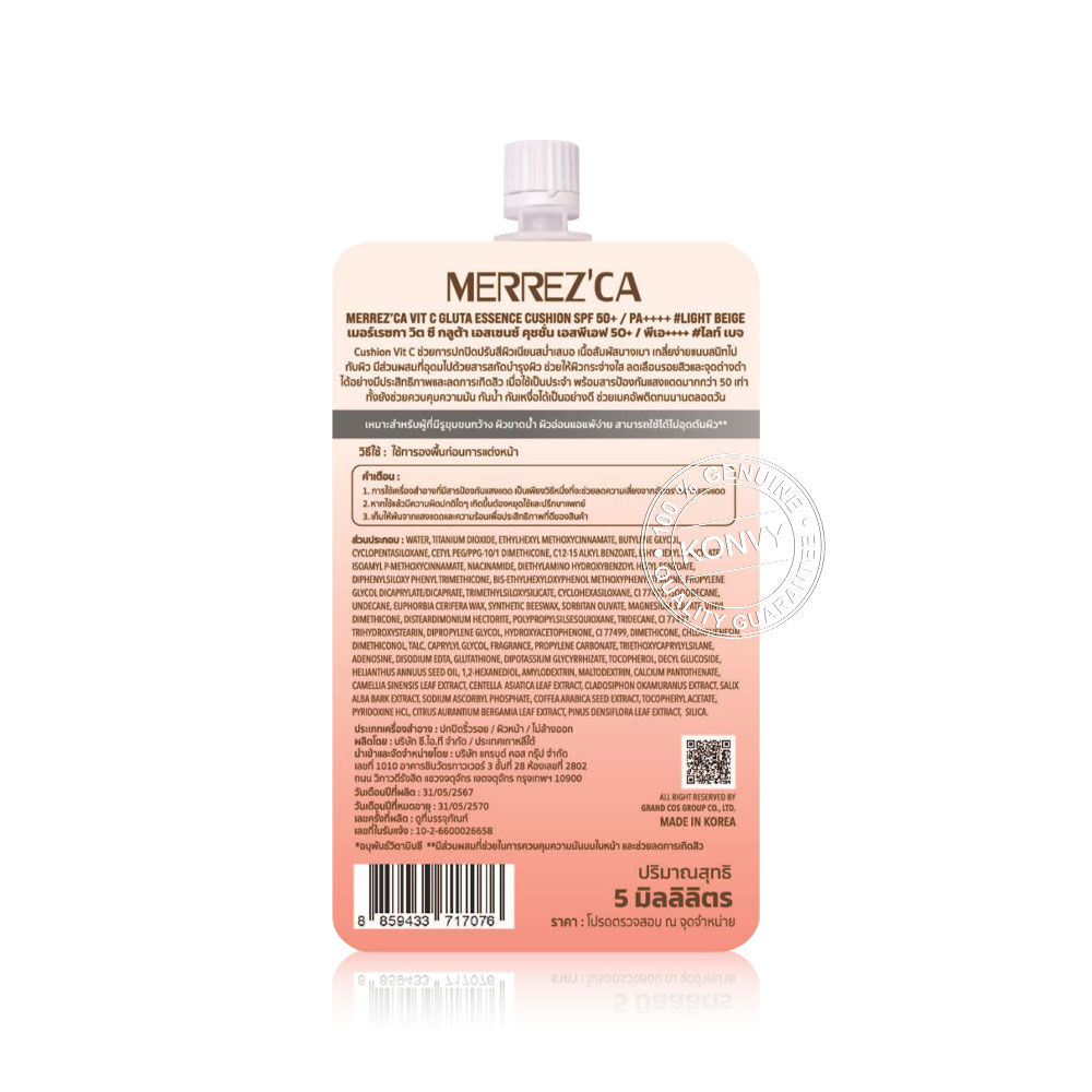 Merrezca Vit C Gluta Essence Cushion Sachet [5g x 6pcs] #22 Light Beige คุชชั่นวิตชีกลูต้าแบบซอง เนื้อบางเบา กันน้ำ กันเหงื่อ ไม่เป็นคราบ ติดทนนาน ด้วยนวัตกรรมใหม่ที่นำคุชชั่นผสานกับพลังเอสเซนส์บำรุงผิว ดูแลแบบ 2in1 ช่วยปกปิดผิวได้เรียบเนียน พร้อมผสาน Vitamin C และ Glutathione ช่วยปรับสีผิวให้สม่ำเสมอ แลดูกระจ่างใส มอบฟินิชผิวเนียนสวย ดูไบร์ทเป็นธรรมชาติ