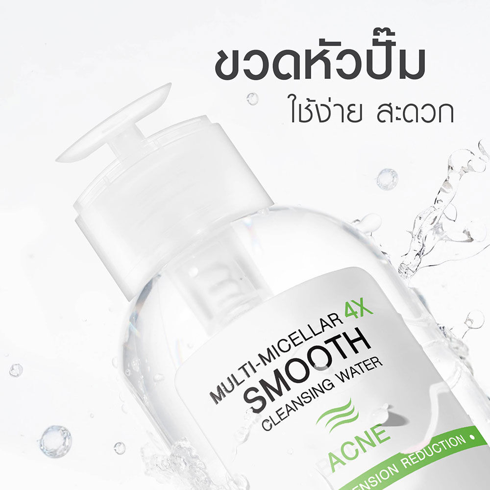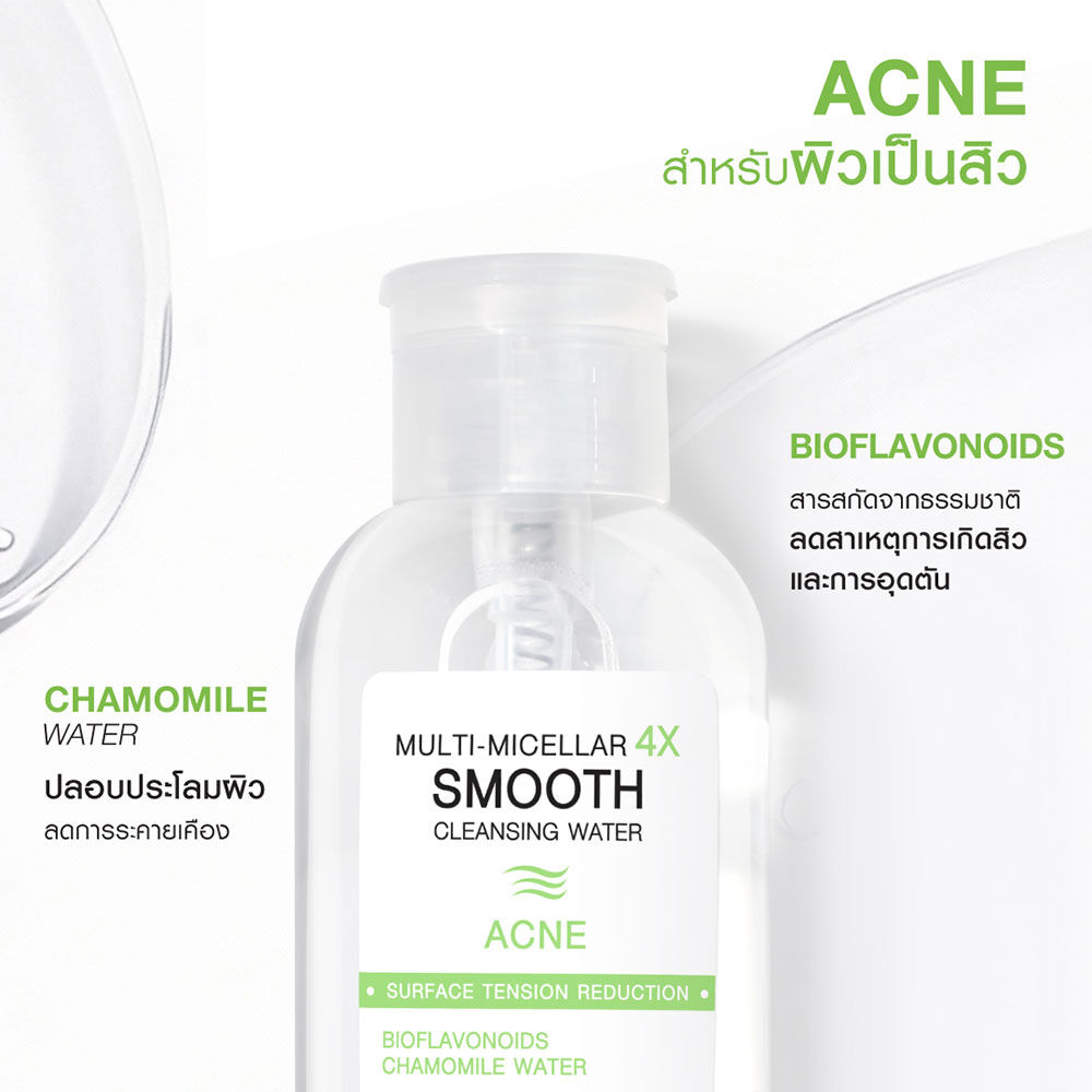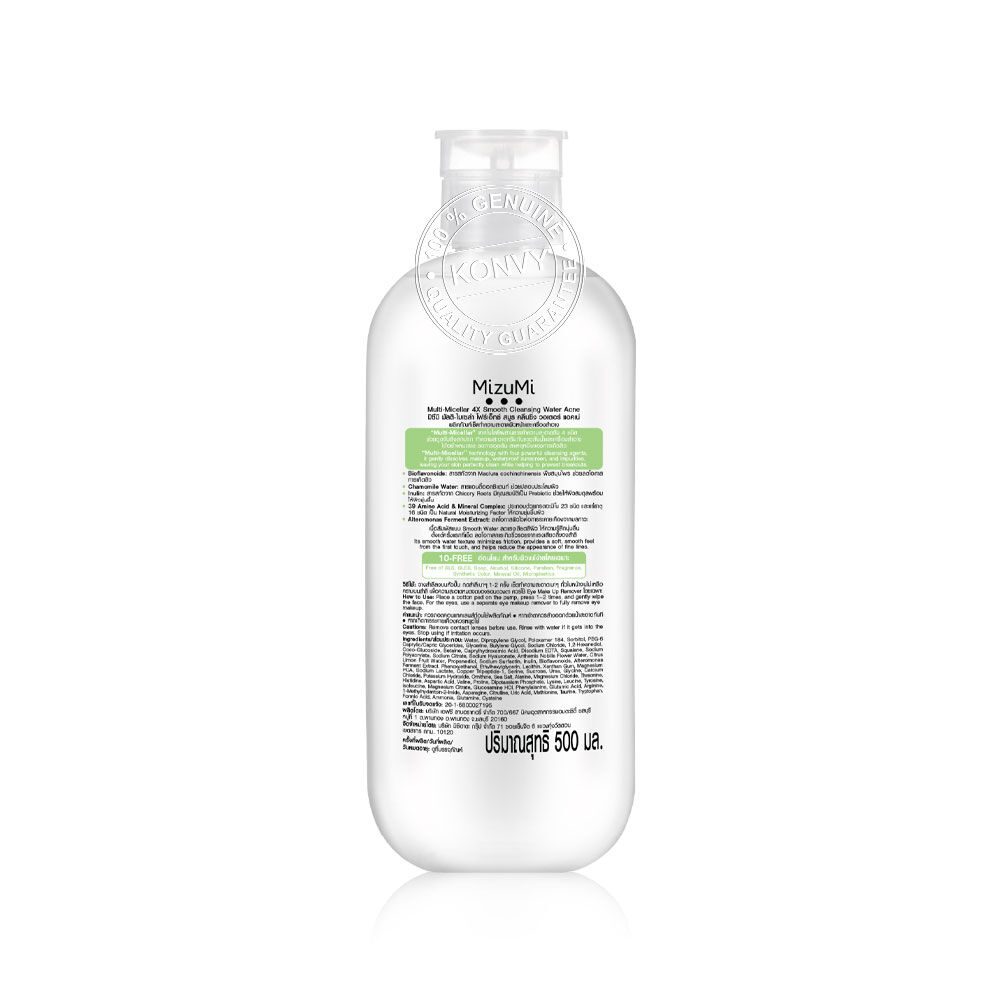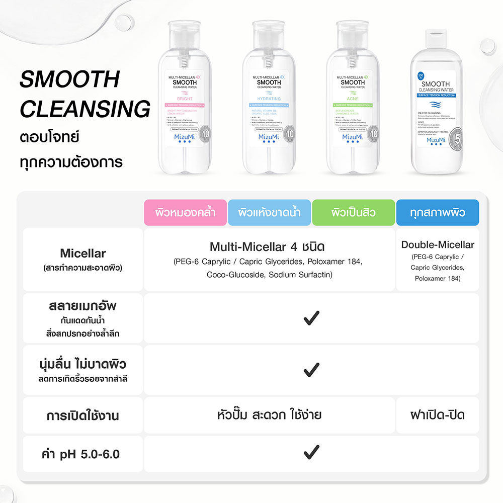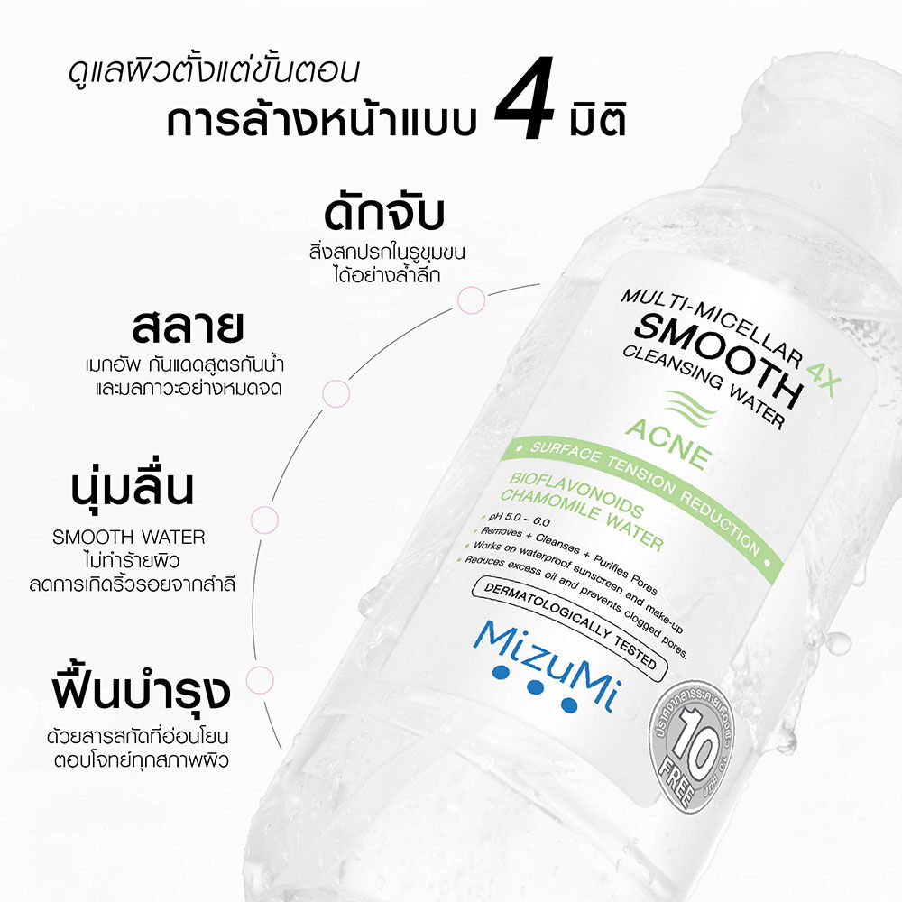 MizuMi Multi-Micellar 4X Smooth Cleansing Water Acne 500ml ผลิตภัณฑ์เช็ดทำความสะอาดผิวหน้าและเครื่องสำอาง Multi-Micellar เทคโนโลยีผสานสารทำความสะอาดถึง 4 ชนิด ช่วยดูดจับสิ่งสกปรก ทำความสะอาดครีมกันแดดกันน้ำและเครื่องลำอางได้อย่างหมดจด ลดการอุดตัน สาเหตุหนึ่งของการเกิดสิว เนื้อสัมผัสแบบ Smooth Water ลดแรงเสียดสีผิว ให้ความรู้สึกนุ่มลื่น ลดโอกาสการเกิดริ้วรอยจากแรงเสียดสีของสำลี
