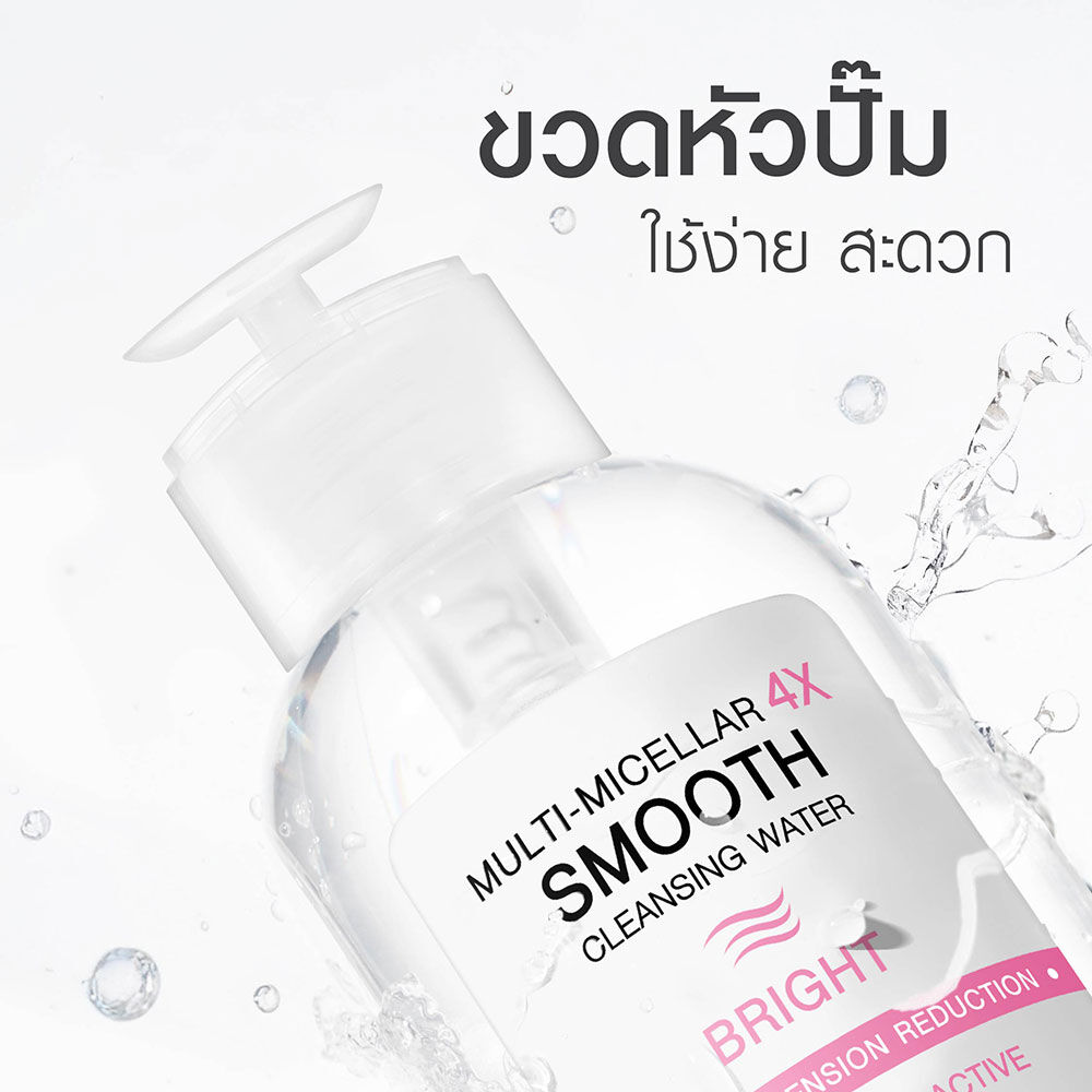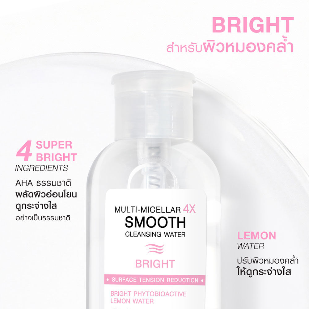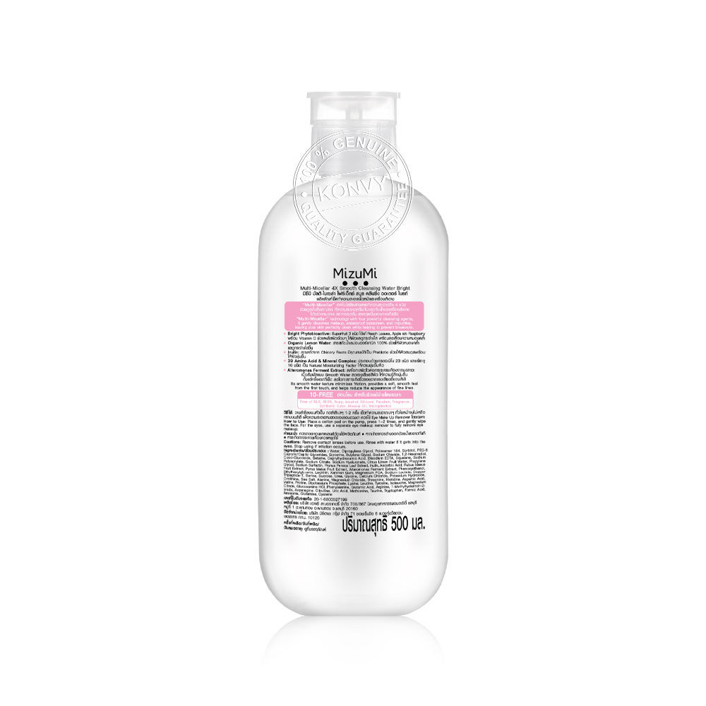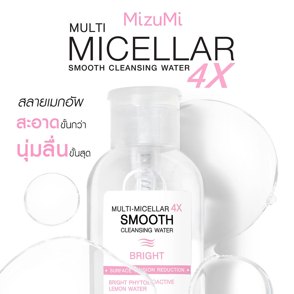 MizuMi Multi-Micellar 4X Smooth Cleansing Water Bright 500ml ผลิตภัณฑ์เช็ดทำความสะอาดผิวหน้าและเครื่องสำอาง Multi-Micellar เทคโนโลยีผสานสารทำความสะอาดถึง 4 ชนิด ช่วยดูดจับสิ่งสกปรก ทำความสะอาดครีมกันแดดกันน้ำและเครื่องลำอางได้อย่างหมดจด ลดการอุดตัน สาเหตุหนึ่งของการเกิดสิว เนื้อสัมผัสแบบ Smooth Water ลดแรงเสียดสีผิว ให้ความรู้สึกนุ่มลื่น ลดโอกาสการเกิดริ้วรอยจากแรงเสียดสีของสำลี