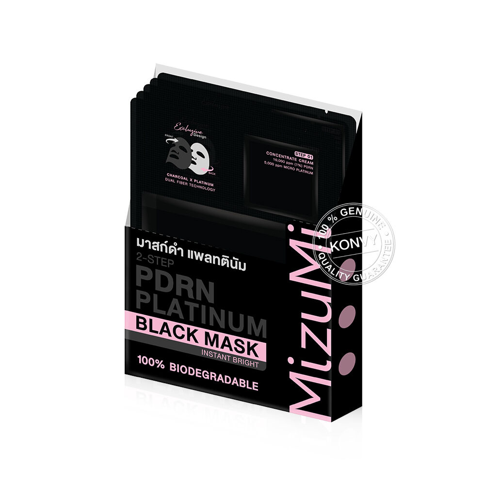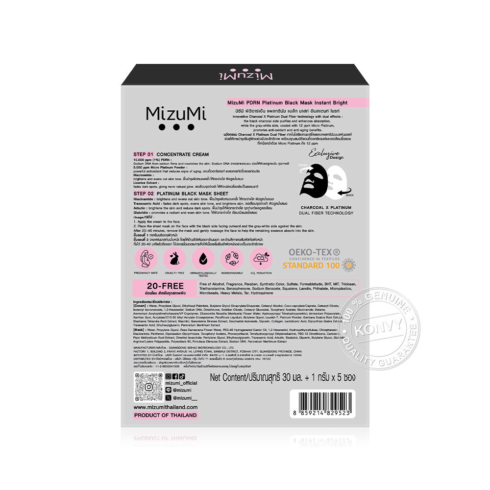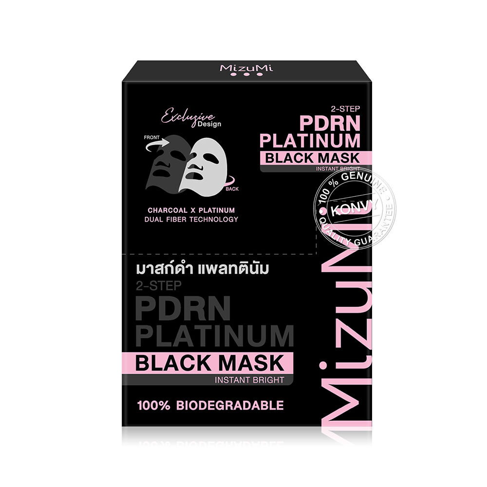 MizuMi PDRN Platinum Black Mask Instant Bright [30ml x 5pcs] แผ่นมาสก์บำรุงผิวหน้า ที่มีนวัตกรรม Charcoal X Platinum Dual Fiber เทคโนโลยีผสานชาร์โคล และแพลทตินัมบนแผ่นมาสก์ ช่วยให้การบำรุงซึมเข้าสู่ผิวอย่างมีประสิทธิภาพ ด้วยคุณสมบัติแอนตี้ออกซิแดนท์ที่เหนือกว่าจาก Micro Platinum ถึง 12 ppm ผสาน PDRN จากปลาแซลมอน, Niacinamide และ Licorice Extract ช่วยลดเลือนริ้วรอย และจุดด่างดำให้แลดูจางลง พร้อมมี Tranexamic Acid, Arbutin และ Glabridin ช่วยฟื้นบำรุงผิวหมองคล้ำ ให้สีผิวสม่ำเสมอ แลดูกระจ่างใส เผยผิวเนียนกระชับ ดูเปล่งปลั่ง สุขภาพดี