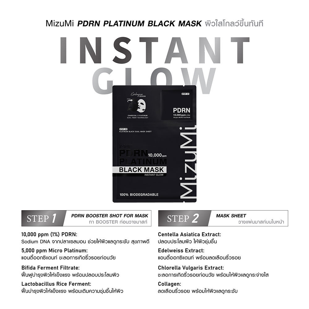 MizuMi PDRN Platinum Black Mask Instant Glow [30ml + 1g] แผ่นมาสก์บำรุงผิวหน้า ที่มีนวัตกรรม Charcoal X Platinum Dual Fiber เทคโนโลยีผสานชาร์โคล และแพลทตินัมบนแผ่นมาสก์ ช่วยให้การบำรุงซึมเข้าสู่ผิวอย่างมีประสิทธิภาพ ด้วยคุณสมบัติแอนตี้ออกซิแดนท์ที่เหนือกว่าจาก Micro Platinum ถึง 12 ppm ผสาน PDRN จากปลาแซลมอน, Bifida Ferment Filtrate และสารสกัดจากข้าวหมัก ช่วยลดเลือนริ้วรอยให้แลดูจางลง และฟื้นบำรุงผิวให้แข็งแรง พร้อมมีสารสกัดจากใบบัวบก, ดอกอีเดลไวส์ (Edelweiss), สาหร่ายสีเขียว (Chlorella Vulgaris) และ Collagen ช่วยปลอบประโลมผิว ปรับผิวให้แลดูกระชับ และกระจ่างใส เผยผิวเนียนกระชับ ดูแข็งแรง สุขภาพดี