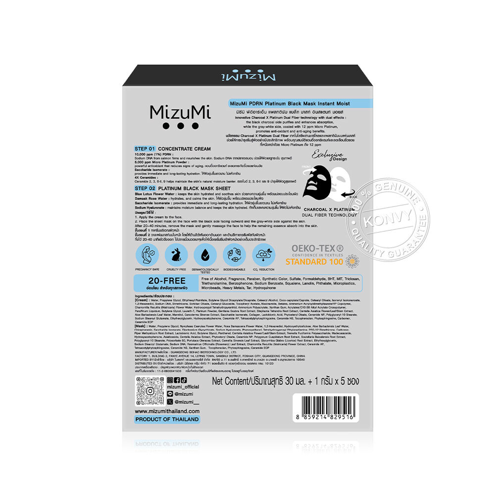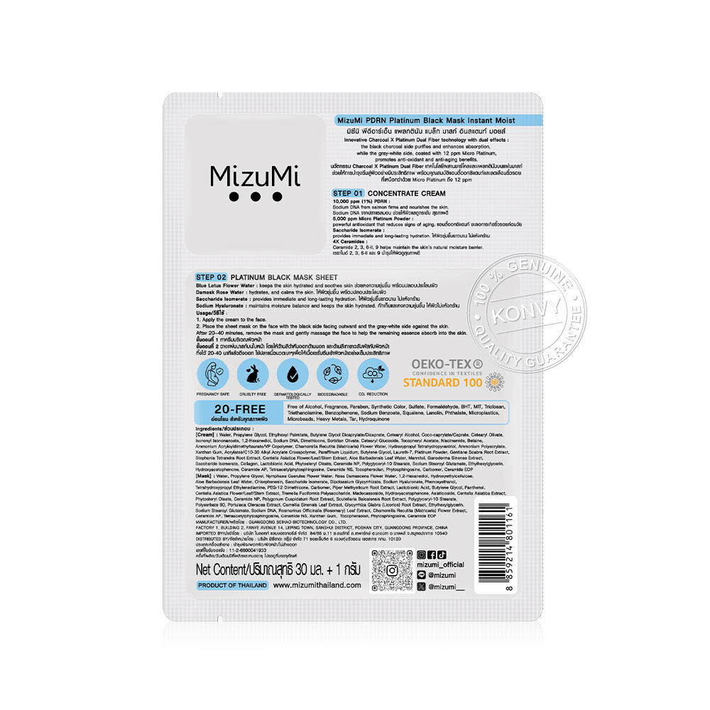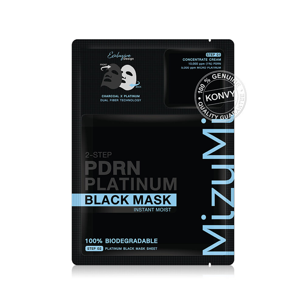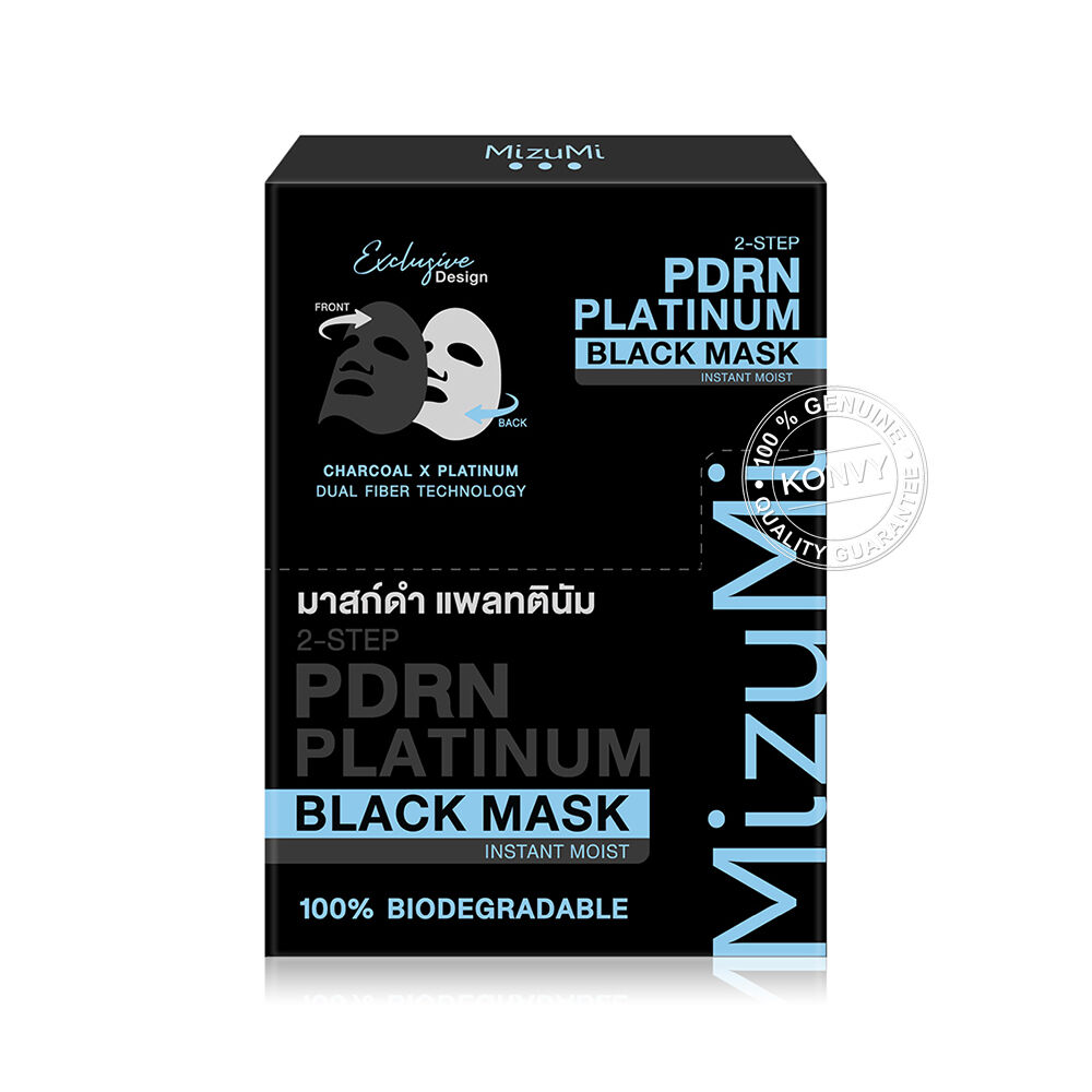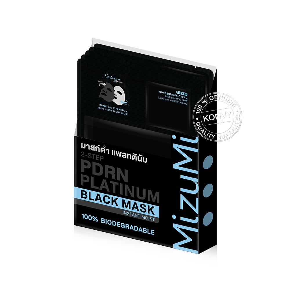 MizuMi PDRN Platinum Black Mask Instant Moist [30ml x 5pcs] แผ่นมาสก์บำรุงผิวหน้า ที่มีนวัตกรรม Charcoal X Platinum Dual Fiber เทคโนโลยีผสานชาร์โคล และแพลทตินัมบนแผ่นมาสก์ ช่วยให้การบำรุงซึมเข้าสู่ผิวอย่างมีประสิทธิภาพ ด้วยคุณสมบัติแอนตี้ออกซิแดนท์ที่เหนือกว่าจาก Micro Platinum ถึง 12 ppm ผสาน PDRN จากปลาแซลมอน, Saccharide Isomerate และ 4X Ceramides ช่วยลดเลือนริ้วรอยให้แลดูจางลง และบำรุงผิวให้ชุ่มชื้น พร้อมมี Blue Lotus Flower Water และ Damusk Rose Water ช่วยปลอบประโลมและเติมความชุ่มชื้นยาวนาน เผยผิวเนียนกระชับ ดูชุ่มชื้น ไม่แห้งกร้าน