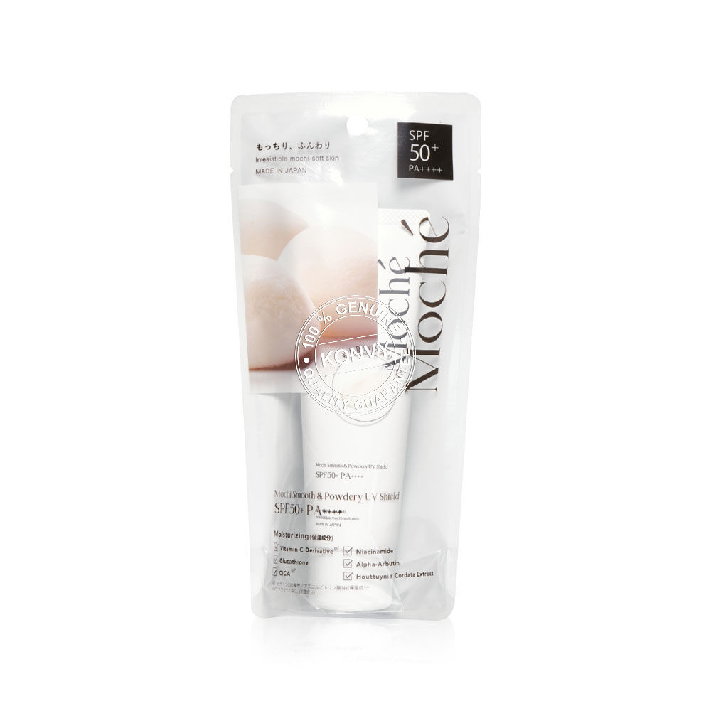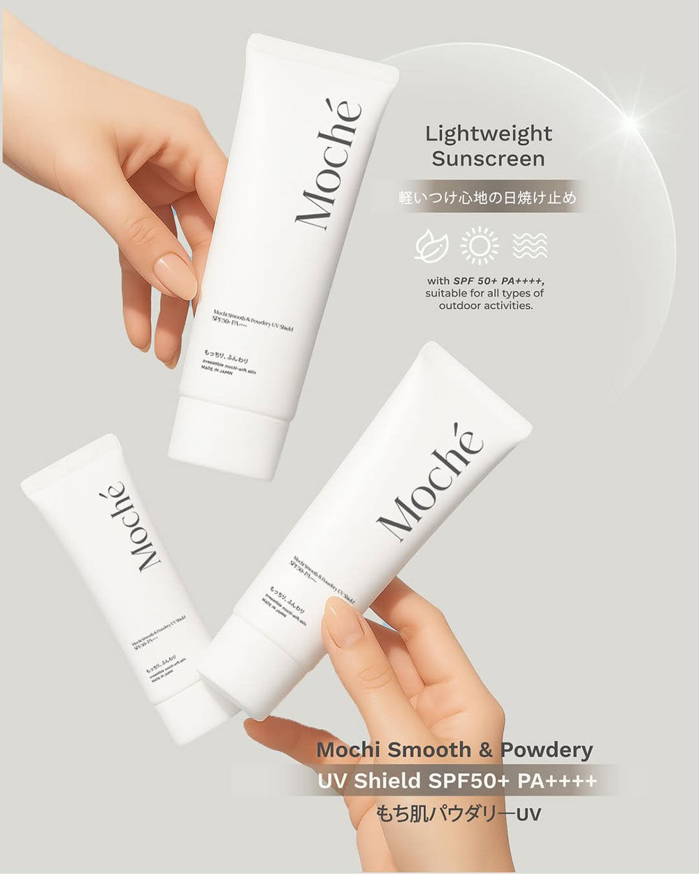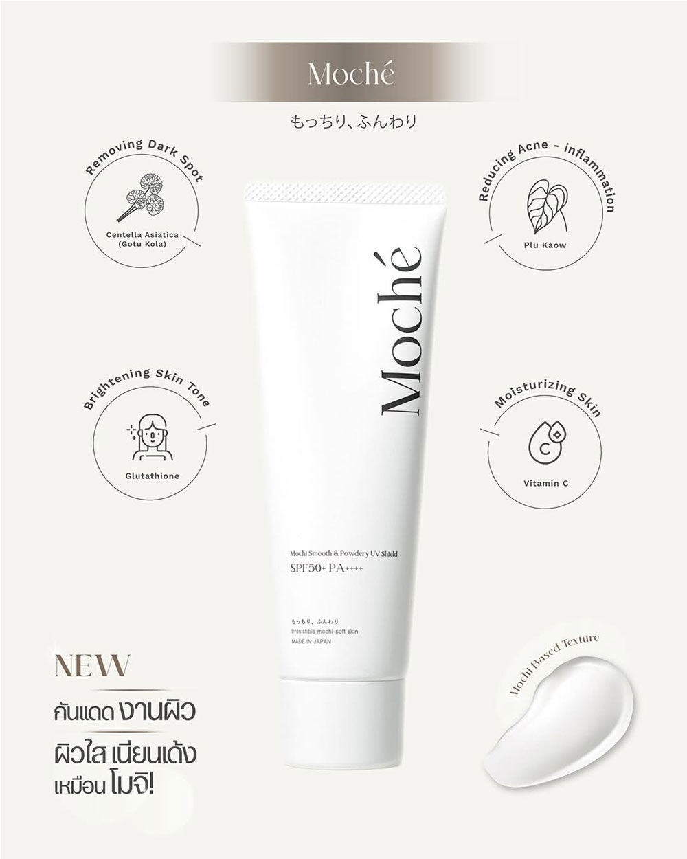 Moche Mochi Smooth & Powdery UV Shield SPF50+ PA++++ 80g ผิวเนียนนุ่มดุจโมจิ กันแดดแบบ Chemical ที่ให้ความรู้สึกผิวอิ่มน้ำ ช่วยเติมเต็มรูขุมขน ให้สัมผัสชุ่มชื้นและเนียนนุ่มเมื่อทา พร้อมสารสกัดจากใบบัวบก และพลูคาว สำหรับปัญหาสิว เนื้อผลิตภัณฑ์เนียนนุ่ม แก้ไขปัญหาผิวไม่สม่ำเสมอ สามารถใช้เป็นเบสก่อนแต่งหน้า ช่วยลดความไม่เรียบเนียนของรูขุมขน เนื้อสัมผัสแบบแป้งคล้ายแป้งฝุ่น เหมาะสำหรับผู้มีผิวมันหรือมีปัญหาผิวมันระหว่างวัน ช่วยให้ผิวเรียบเนียน ดูแมท ไม่ทิ้งคราบขาวหรือสีผิวไม่สม่ำเสมอ (ปกปิดผิวไม่เรียบเนียน) กันน้ำ กันเหงื่อ เหมาะสำหรับผู้ที่มีเหงื่อออกมาก เหมาะสำหรับผู้ชายและเด็กที่ไม่ชอบความเหนอะหนะบนผิว สามารถใช้ได้ทุกฤดูกาล และใช้เป็นเบสช่วยเพิ่มความชุ่มชื้น