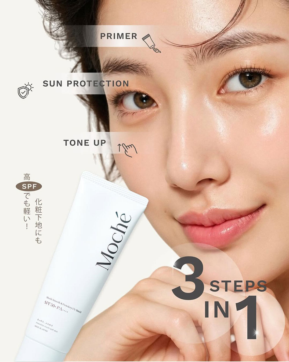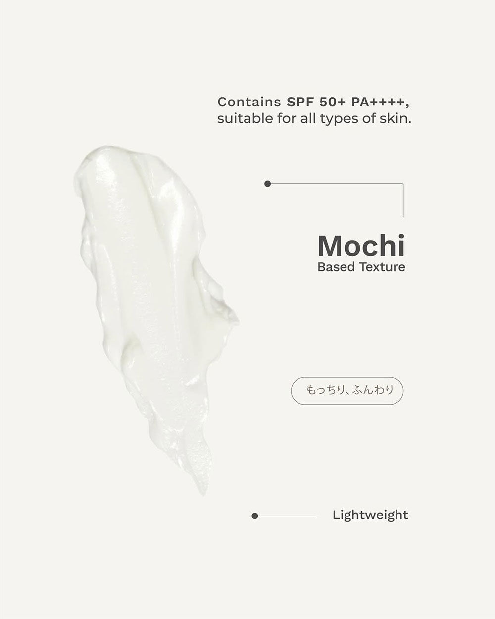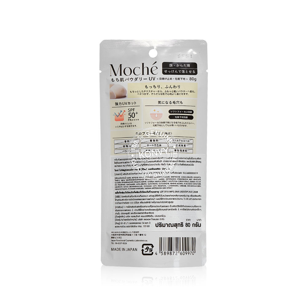 Moche Mochi Smooth & Powdery UV Shield SPF50+ PA++++ 80g ผิวเนียนนุ่มดุจโมจิ กันแดดแบบ Chemical ที่ให้ความรู้สึกผิวอิ่มน้ำ ช่วยเติมเต็มรูขุมขน ให้สัมผัสชุ่มชื้นและเนียนนุ่มเมื่อทา พร้อมสารสกัดจากใบบัวบก และพลูคาว สำหรับปัญหาสิว เนื้อผลิตภัณฑ์เนียนนุ่ม แก้ไขปัญหาผิวไม่สม่ำเสมอ สามารถใช้เป็นเบสก่อนแต่งหน้า ช่วยลดความไม่เรียบเนียนของรูขุมขน เนื้อสัมผัสแบบแป้งคล้ายแป้งฝุ่น เหมาะสำหรับผู้มีผิวมันหรือมีปัญหาผิวมันระหว่างวัน ช่วยให้ผิวเรียบเนียน ดูแมท ไม่ทิ้งคราบขาวหรือสีผิวไม่สม่ำเสมอ (ปกปิดผิวไม่เรียบเนียน) กันน้ำ กันเหงื่อ เหมาะสำหรับผู้ที่มีเหงื่อออกมาก เหมาะสำหรับผู้ชายและเด็กที่ไม่ชอบความเหนอะหนะบนผิว สามารถใช้ได้ทุกฤดูกาล และใช้เป็นเบสช่วยเพิ่มความชุ่มชื้น