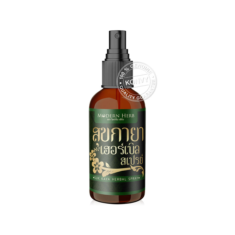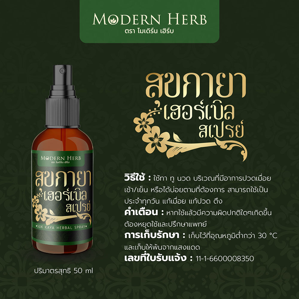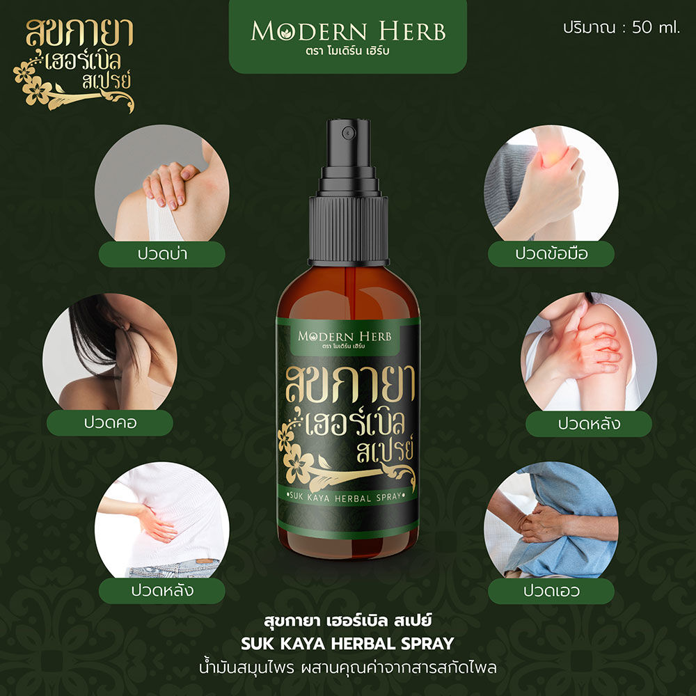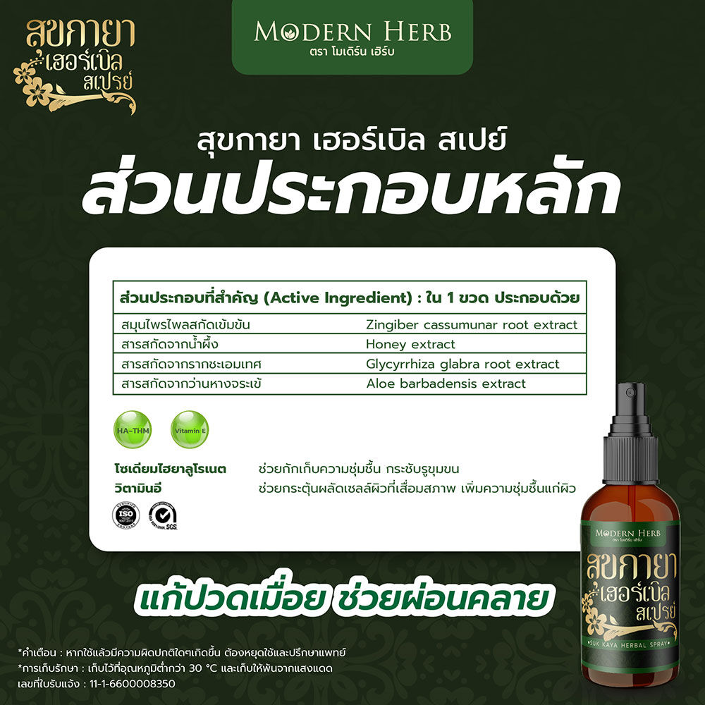 Modern Herb Suk Kaya Herbal Spray 50ml สุขกายา เฮอร์เบิล สเปรย์ อุดมด้วยคุณค่าจากสมุนไพรไพลสกัดเข้มข้น, สารสกัดจากน้ำผึ้ง และสารสกัดจากรากชะเอมเทศ ผสานกับโซเดียม ไฮยาลูโรเนต, วิตามินอี และสารสกัดจากใบบัวบก ใช้งานง่าย ซึมลงผิวอย่างรวดเร็ว ไม่เหนียวเหนอะหนะ ให้กลิ่นหอม ไม่ระคายเคือง