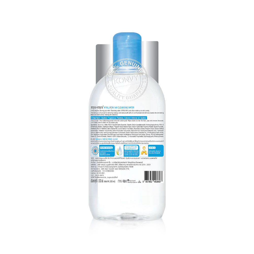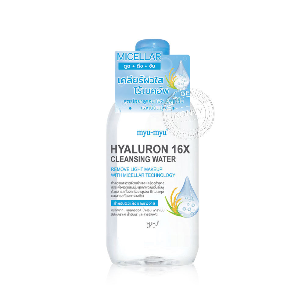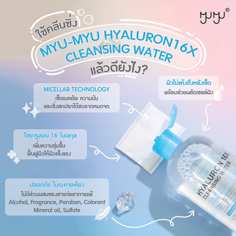 MYU-MYU Hyaluron 16X Cleansing Water 300ml คลีนซิ่งวอเตอร์ สูตรเพื่อผิวชุ่มชื้น ด้วยเทคโนโลยีไมเซล่า ช่วยทำความสะอาดคราบเมคอัพ และความมันได้อย่างมีประสิทธิภาพ อุดมด้วย Hyaluron 16 Molecules ช่วยเติมและกักเก็บความชุ่มชื้น ให้ผิวไม่แห้งกร้าน ผสานกับ Rice Extract และ Vitamin B5 ช่วยผลัดเซลล์ผิว เพิ่มความยืดหยุ่น และเติมความชุ่มชื้น มอบผิวสะอาด สดชื่น ดูเรียบเนียน ไม่แห้งกร้าน