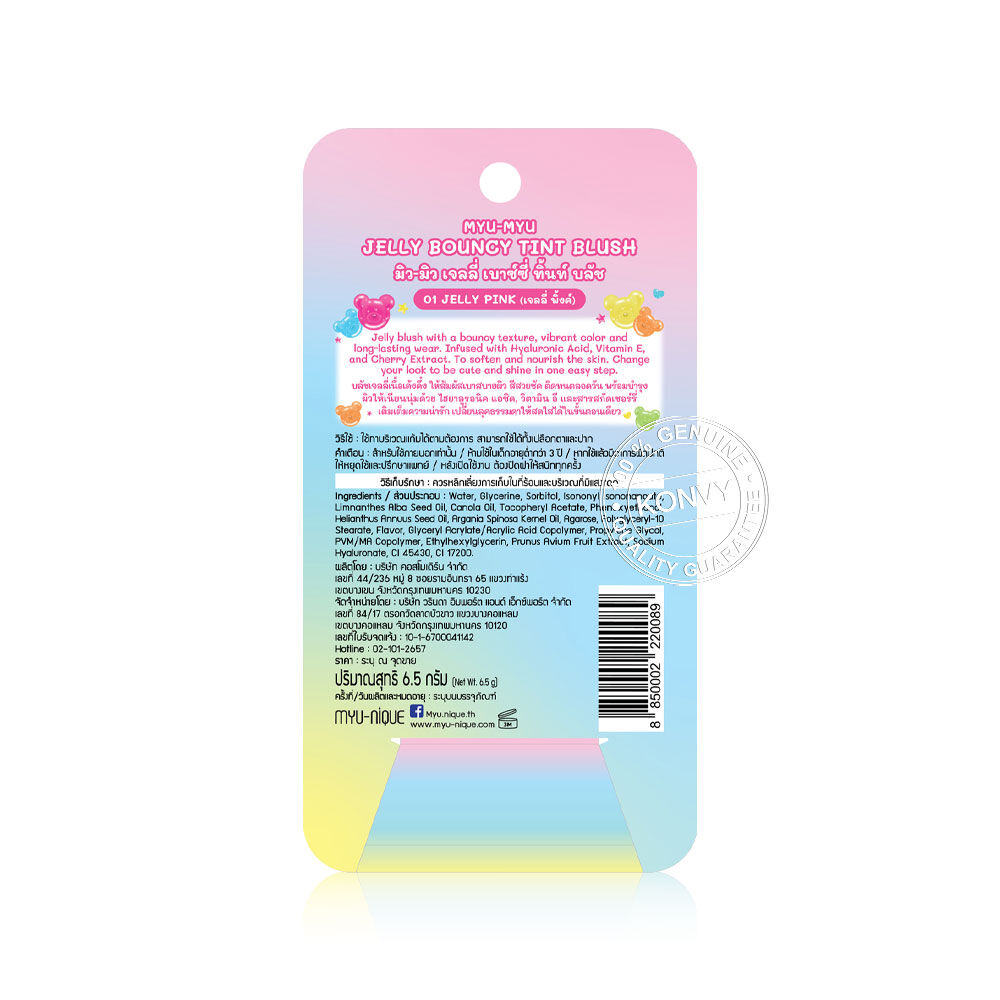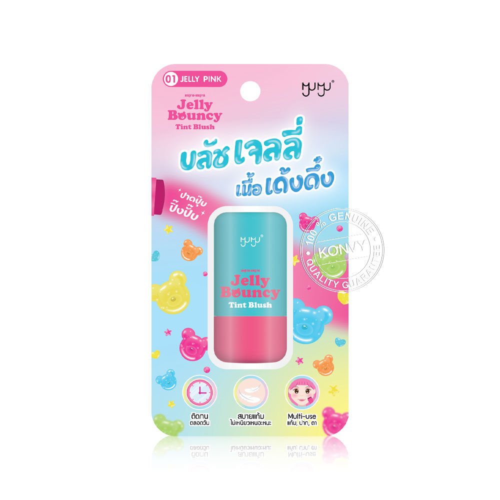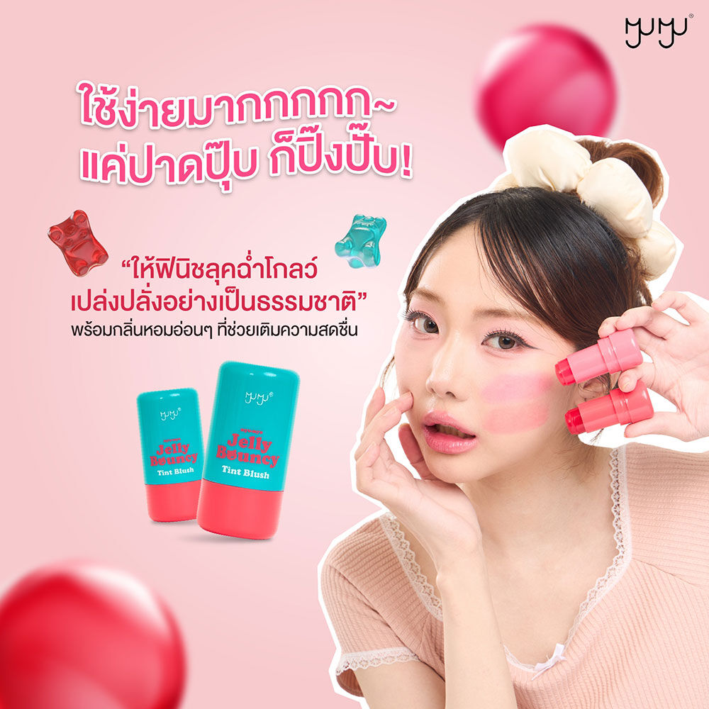 MYU-MYU Jelly Bouncy Tint Blush 6.5g #01 Jelly Pink บลัชออนเนื้อเจลลี่เด้งดึ๋ง ให้สัมผัสนุ่มลื่น เย็นสบาย บางเบา สีชัด ติดทนนาน ผสาน Hyaluronic Acid, Vitamin E และ Sweet Cherry Oil ช่วยบำรุงผิวและกักเก็บความชุ่มชื้นให้ผิว มอบฟินิชลุคน่ารัก ฉ่ำโกลว์ เปลี่ยนลุคธรรมดาให้สดใสขึ้น