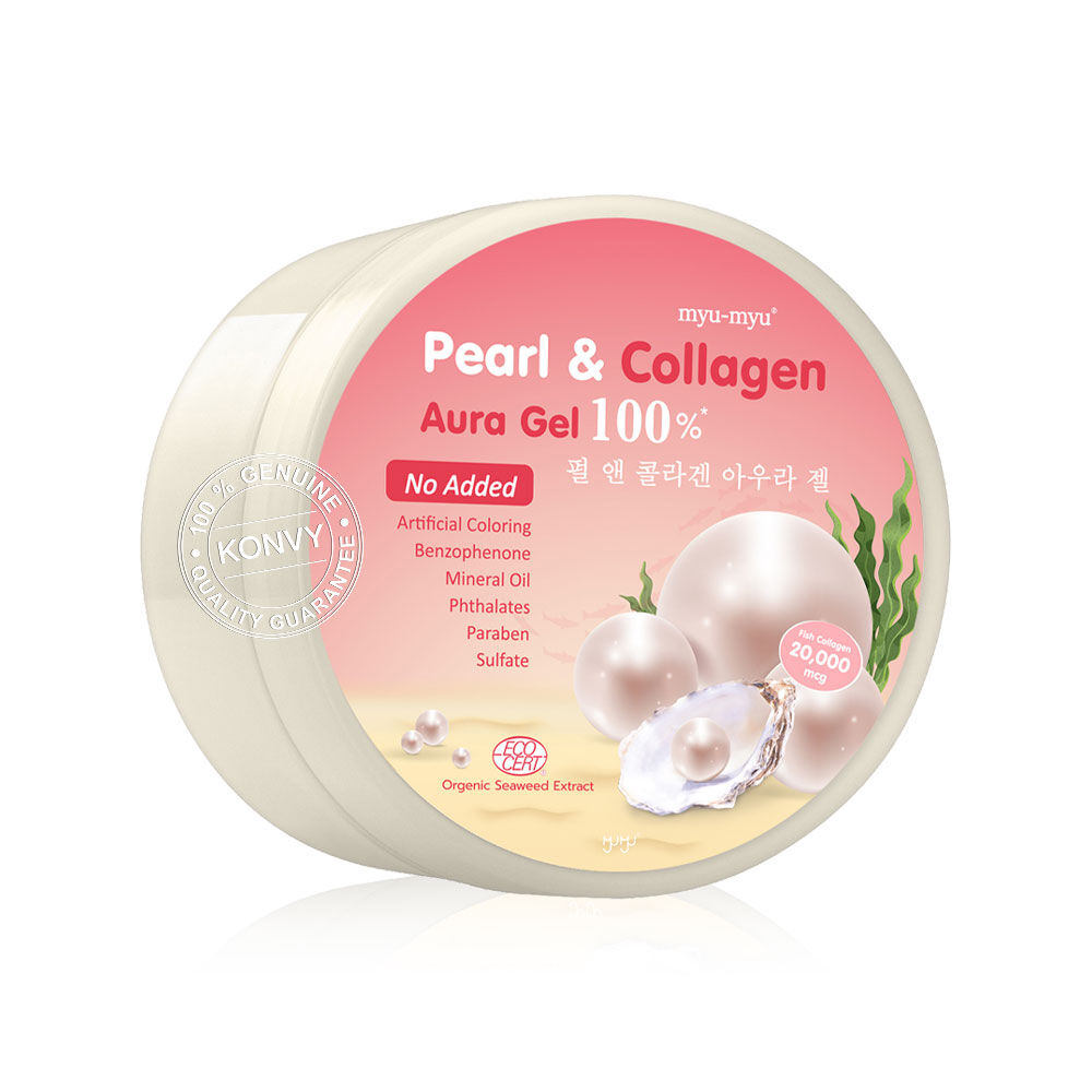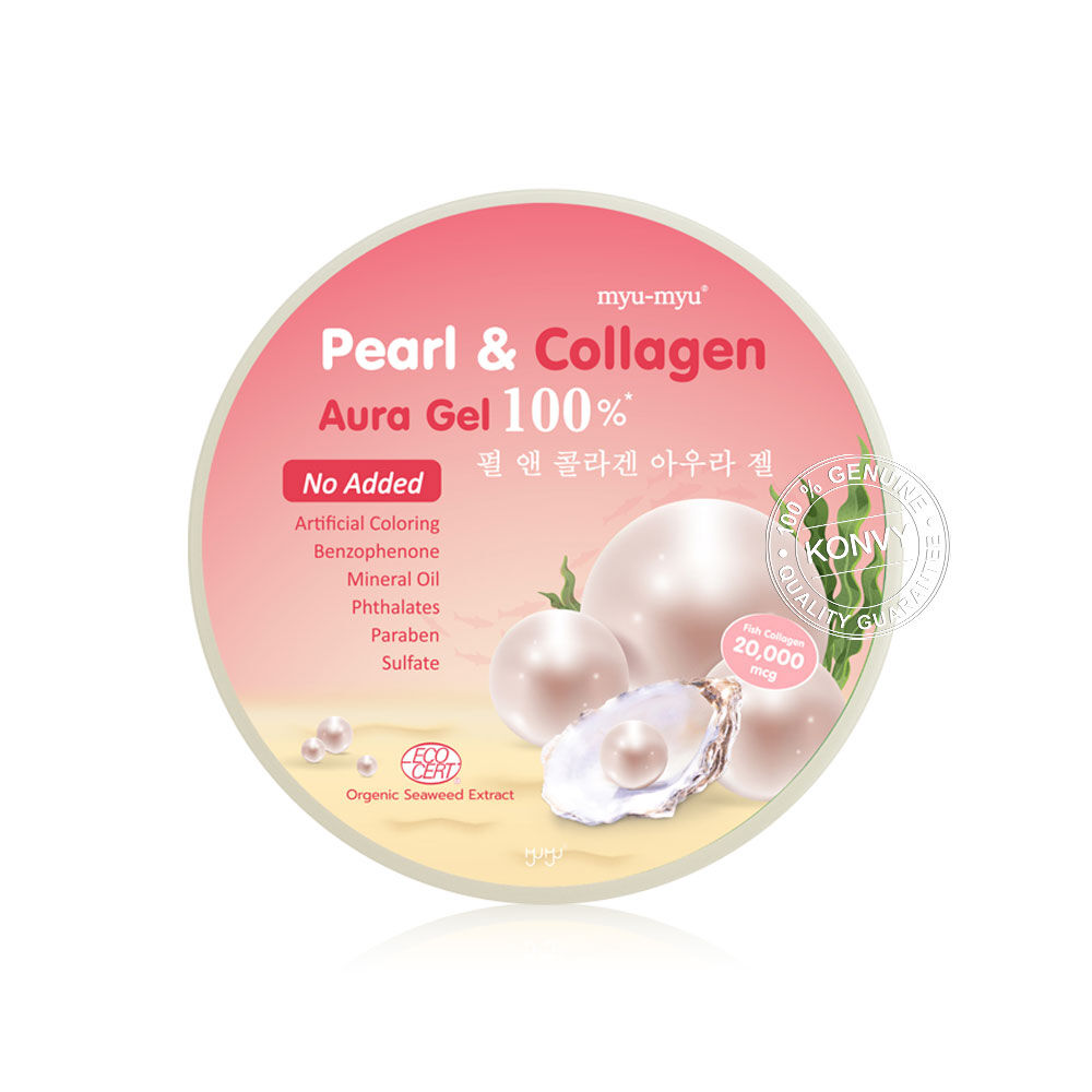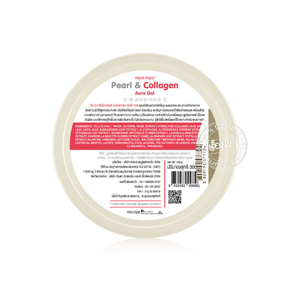 MYU-MYU Pearl And Collagen Aura Gel 300g เจลบำรุงผิว เนื้อสัมผัสบางเบา เย็นสบายผิว ซึมเร็ว ไม่เหนียวเหนอะหนะ ผสานสารสกัดจากไข่มุก, Collagen และสารสกัดจากสาหร่าย ช่วยปรับสีผิวให้ดูสม่ำเสมอ เรียบเนียน ลดปัญหาผิวหมองคล้ำ พร้อมด้วยสารสกัดจากว่านหางจระเข้ ช่วยปลอบประโลมผิวจากการระคายเคือง เผยผิวเนียนนุ่ม แลดูกระจ่างใส สุขภาพดี