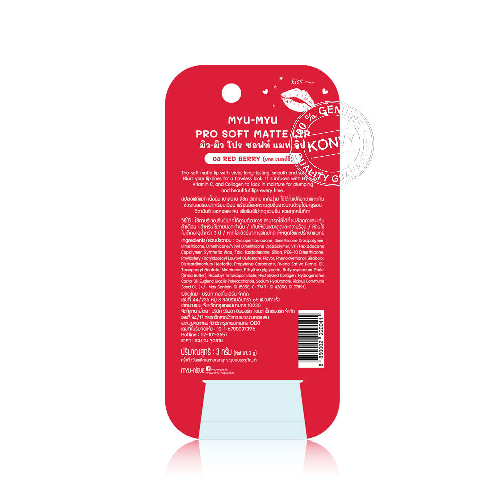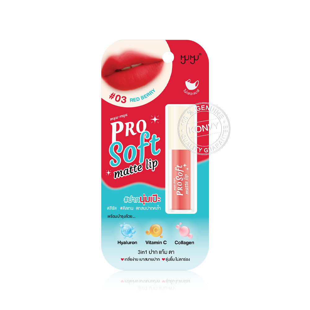 MYU-MYU Pro Soft Matte Lip 3g #03 Red Berry ลิปซอฟต์แมท เนื้อสัมผัสนุ่ม บางเบา เกลี่ยง่าย ไม่ตกร่อง สีชัด ติดทนนาน ช่วยเบลอร่องริมฝีปากให้เรียบเนียน พร้อมล็อคความชุ่มชื้นยาวนานด้วยส่วนผสมจาก Hyaluron, Vitamin C และ Collagen มอบริมฝีปากเนียนสวย ดูอวบอิ่ม สวยโดดเด่นในทุกมุมมอง