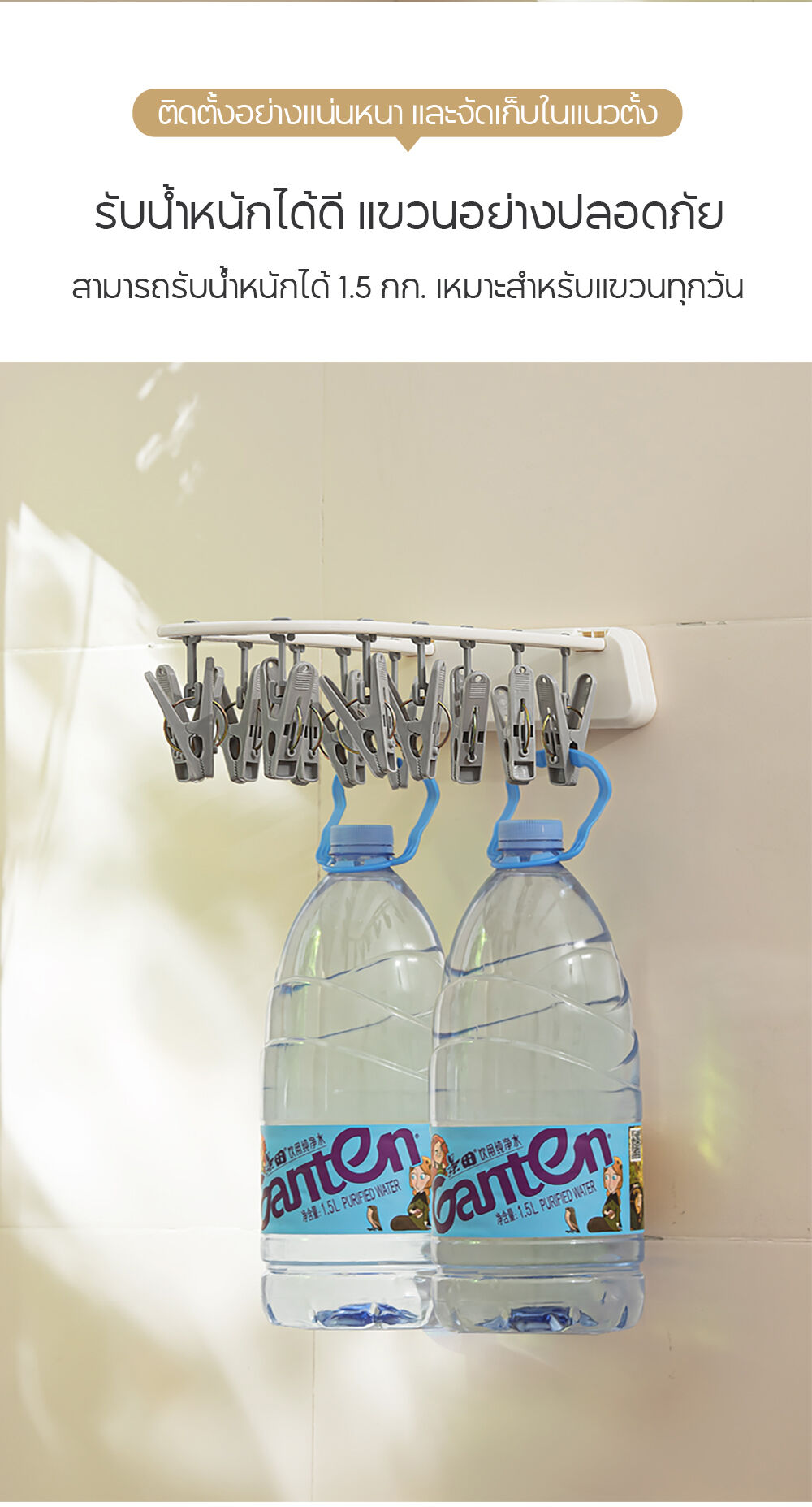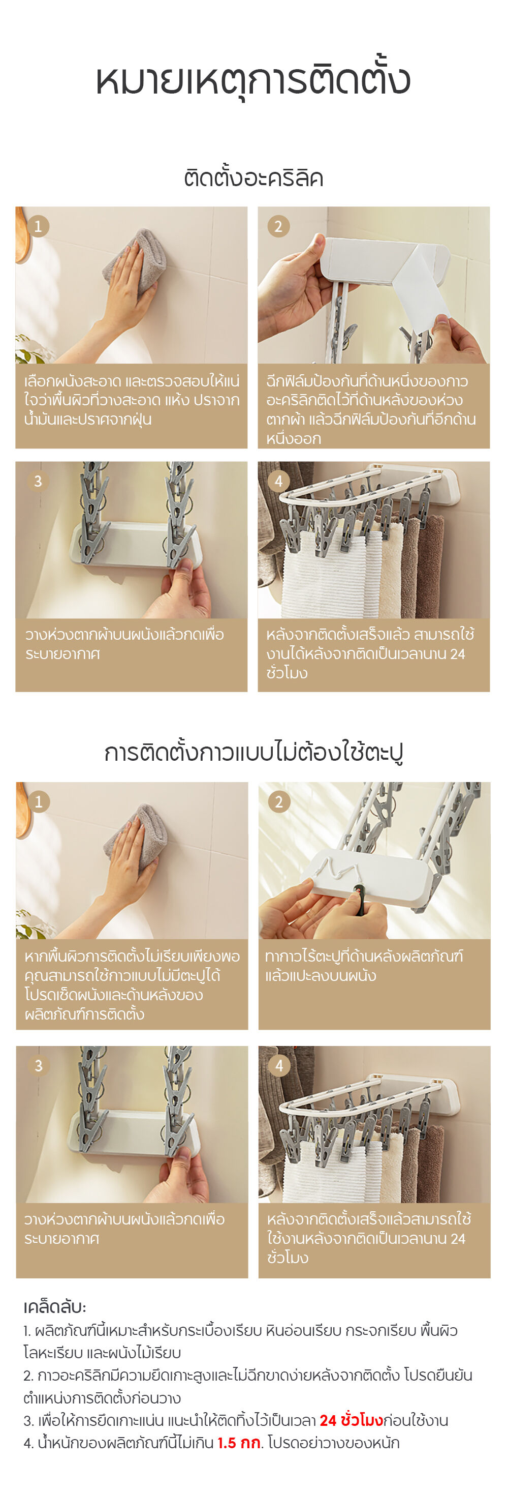 • ทิ้งไว้ 12-24 ชั่วโมง ก่อนเริ่มแขวนผ้าเพื่อให้กาวเซ็ตตัวได้เต็มที่