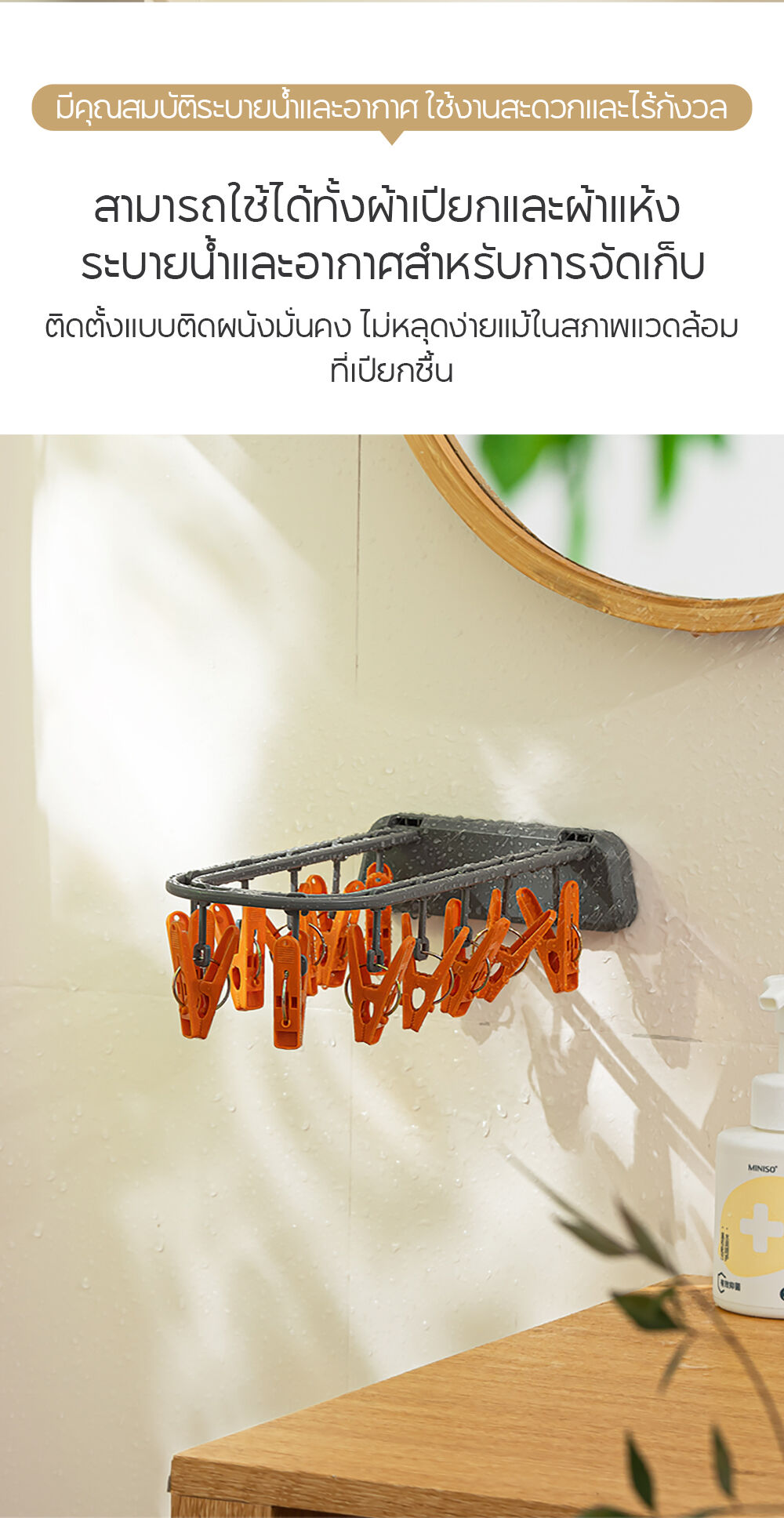 • ลอกแถบกาวด้านหลังออกแล้วติดลงบนผนัง กดให้แน่น