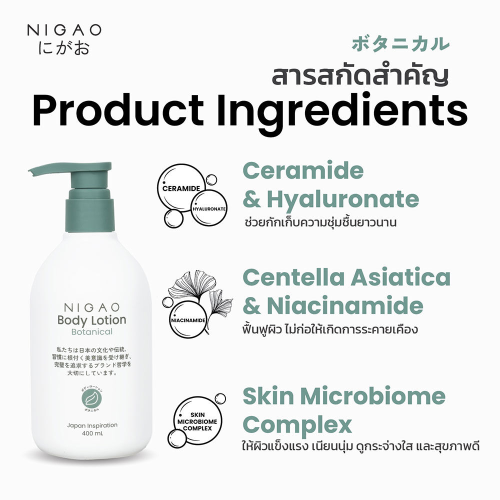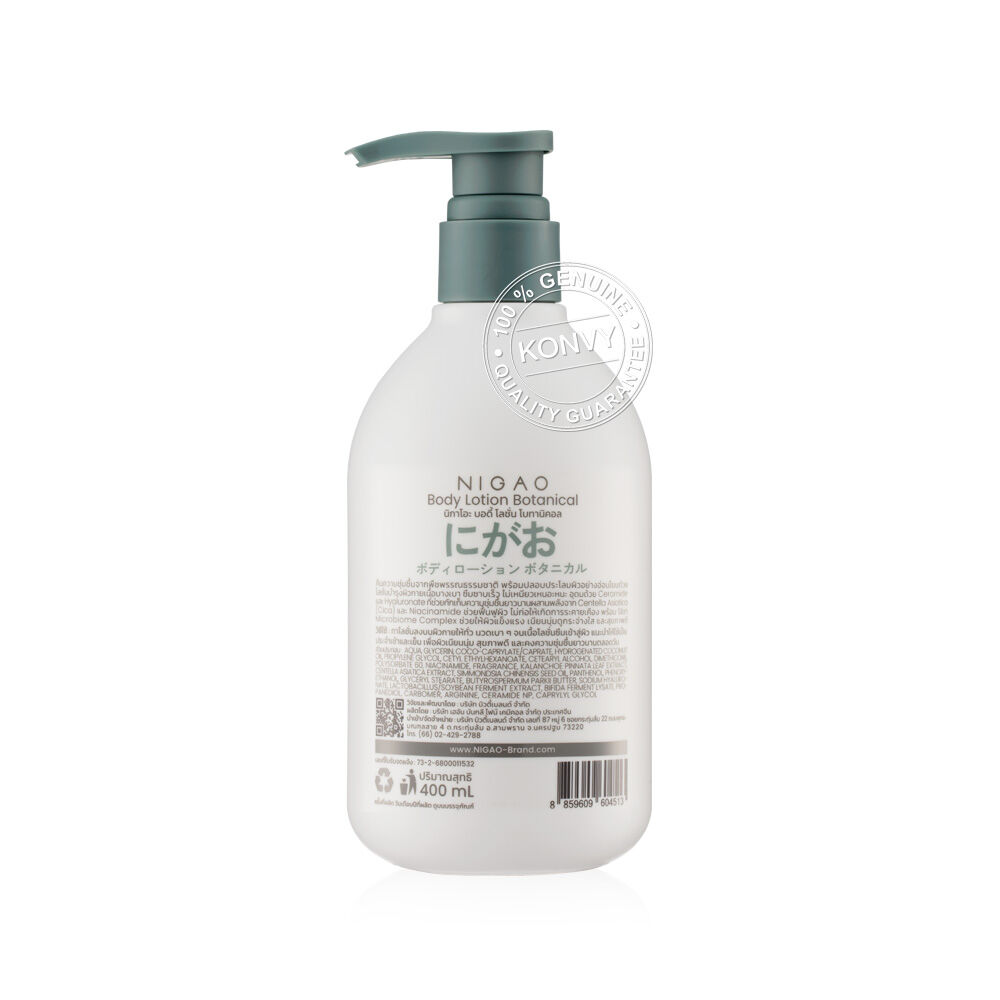 NIGAO Body Lotion Botanical 400ml คืนความชุ่มชื้นจากพืชพรรณธรรมชาติ ด้วยโลชั่นบำรุงผิวกายเนื้อบางเบา ซึมซาบเร็ว ไม่เหนียวเหนอะหนะ อุดมด้วย Ceramide และ Hyaluronate ช่วยกักเก็บความชุ่มชื้นยาวนาน ผสานพลังจาก Centella Asiatica (Cica) และ Niacinamide ช่วยปลอบประโลมและฟื้นฟูผิว พร้อมด้วย Skin Microbiome Complex ช่วยบำรุงผิวให้เนียนนุ่ม กระจ่างใส ดูแข็งแรง สุขภาพดี