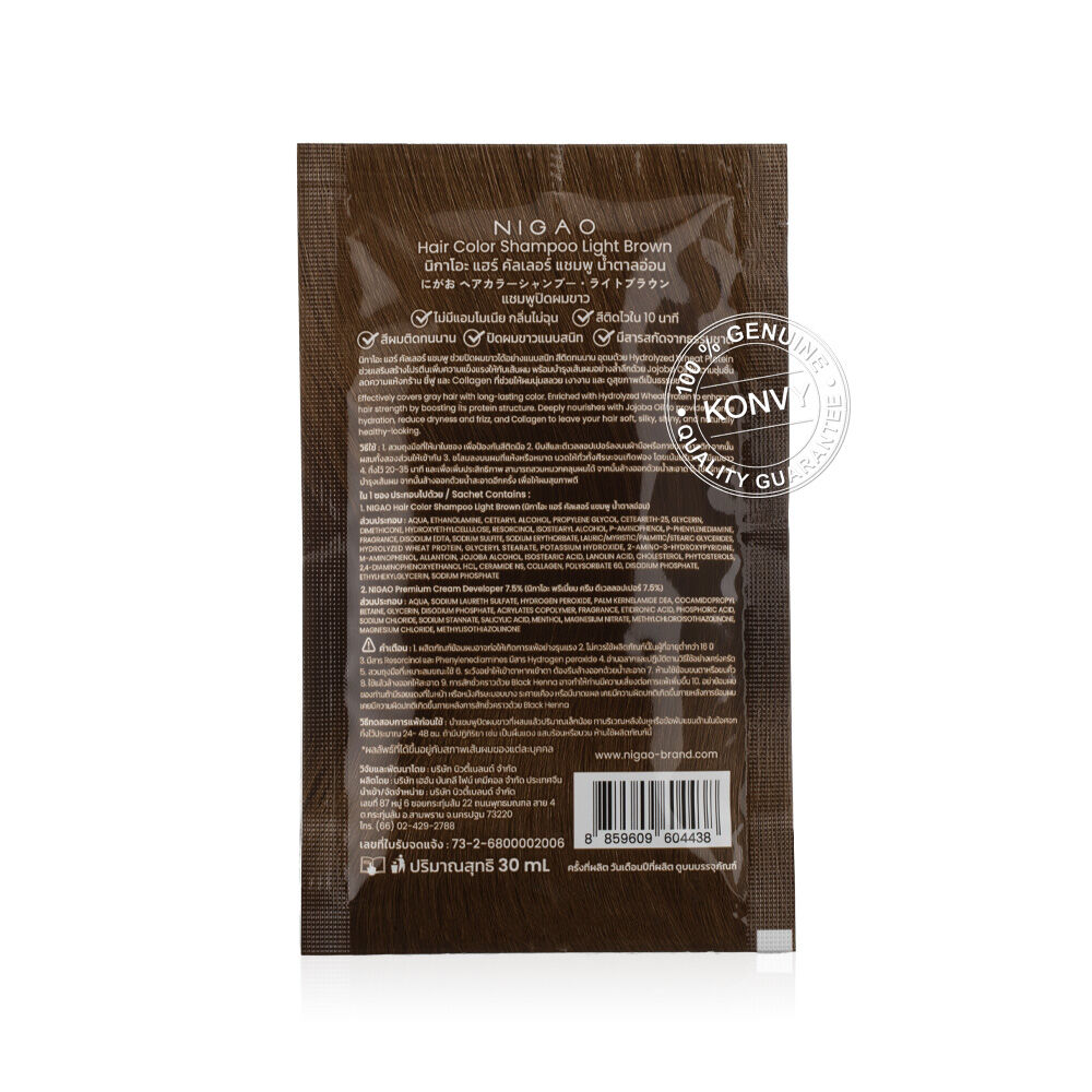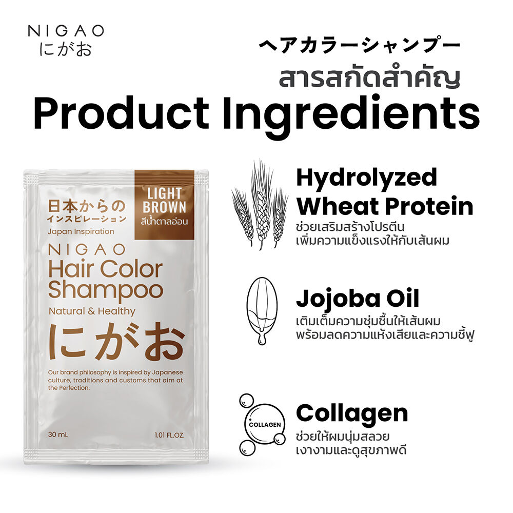Nigao Hair Color Shampoo 30ml #Light Brown แชมพูปิดผมขาว สีน้ำตาลอ่อน ช่วยปิดผมขาวได้อย่างแนบสนิท ให้สีติดทนนาน ไม่มีกลิ่นฉุน อุดมด้วย Hydrolyzed Wheat Protein ช่วยเสริมสร้างโปรตีน และเพิ่มความแข็งแรงให้กับเส้นผม พร้อมด้วย Jojoba Oil และ Collagen ช่วยบำรุงเส้นผมอย่างล้ำลึก ให้ความชุ่มชื้น ลดความแห้งกร้านชี้ฟู มอบผมนุ่มสลวย เงางาม ดูสุขภาพดีเป็นธรรมชาติ