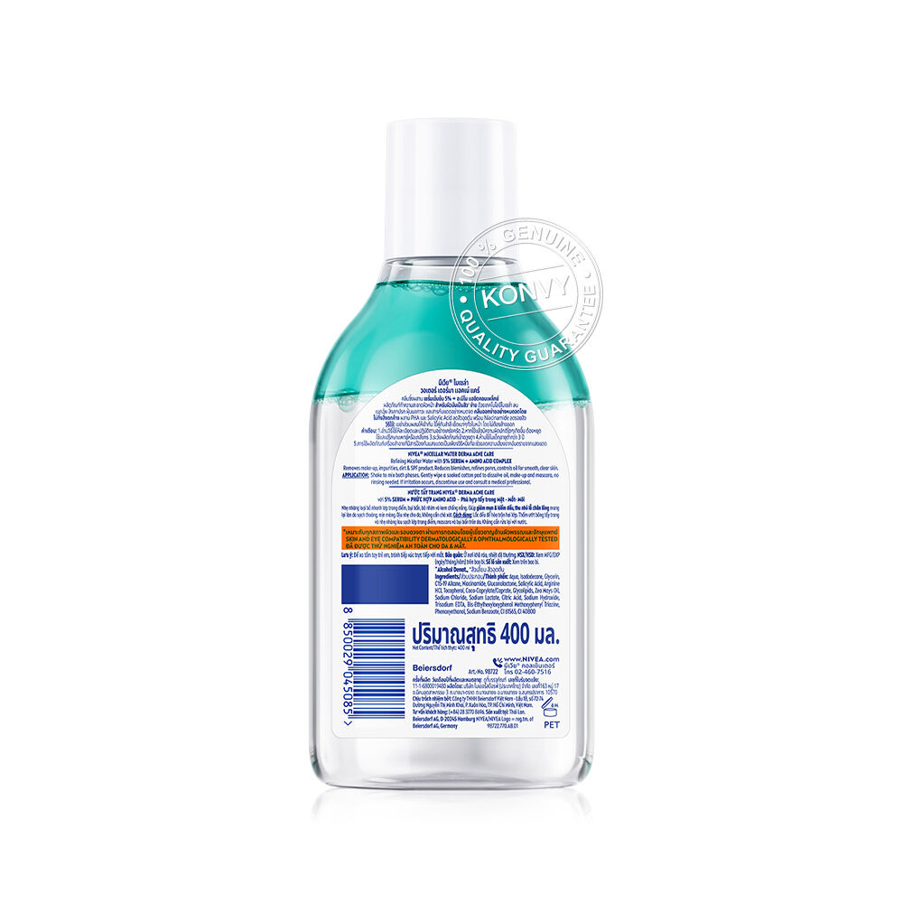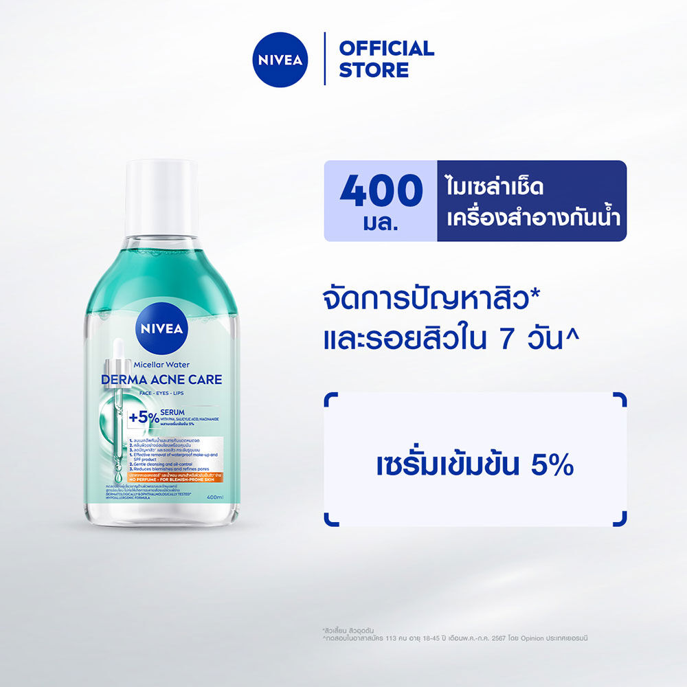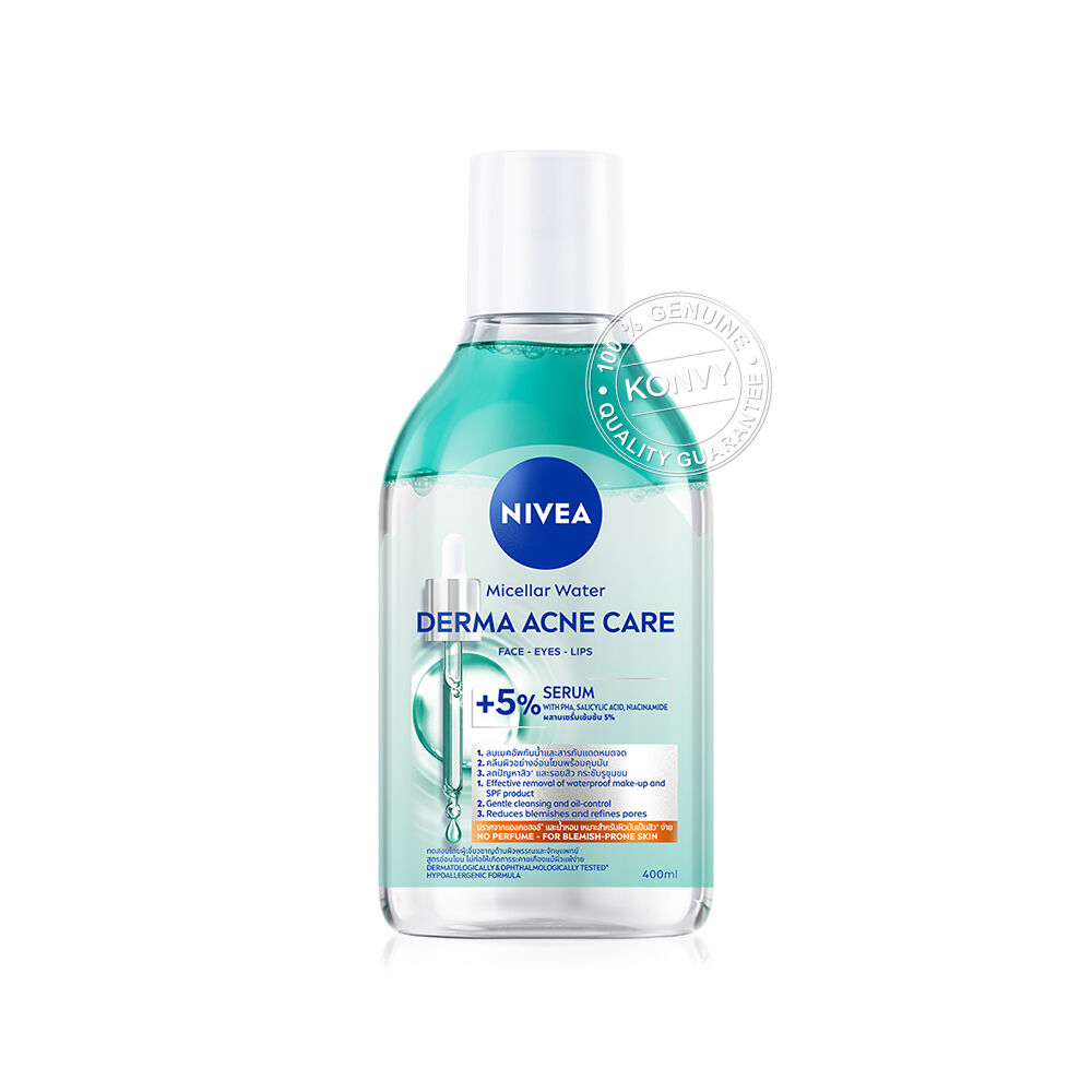 NIVEA Micellar Water Derma Acne Care 400ml คลีนซิ่งวอเตอร์สูตรผสานเซรั่มเข้มข้น 5% ด้วยเทคโนโลยีไมเซล่า และส่วนผสมจาก Amino Acid Complex ช่วยทำความสะอาดสิ่งสกปรก ฝุ่นมลภาวะ คราบเมคอัพกันน้ำ และกันแดดได้อย่างหมดจด โดยไม่ทิ้งสิ่งตกค้าง ผสาน PHA, Salicylic Acid และ Niacinamide ช่วยลดปัญหาสิว และรอยสิว พร้อมกระชับรูขุมขน มอบผิวสะอาด เรียบเนียน สุขภาพดี