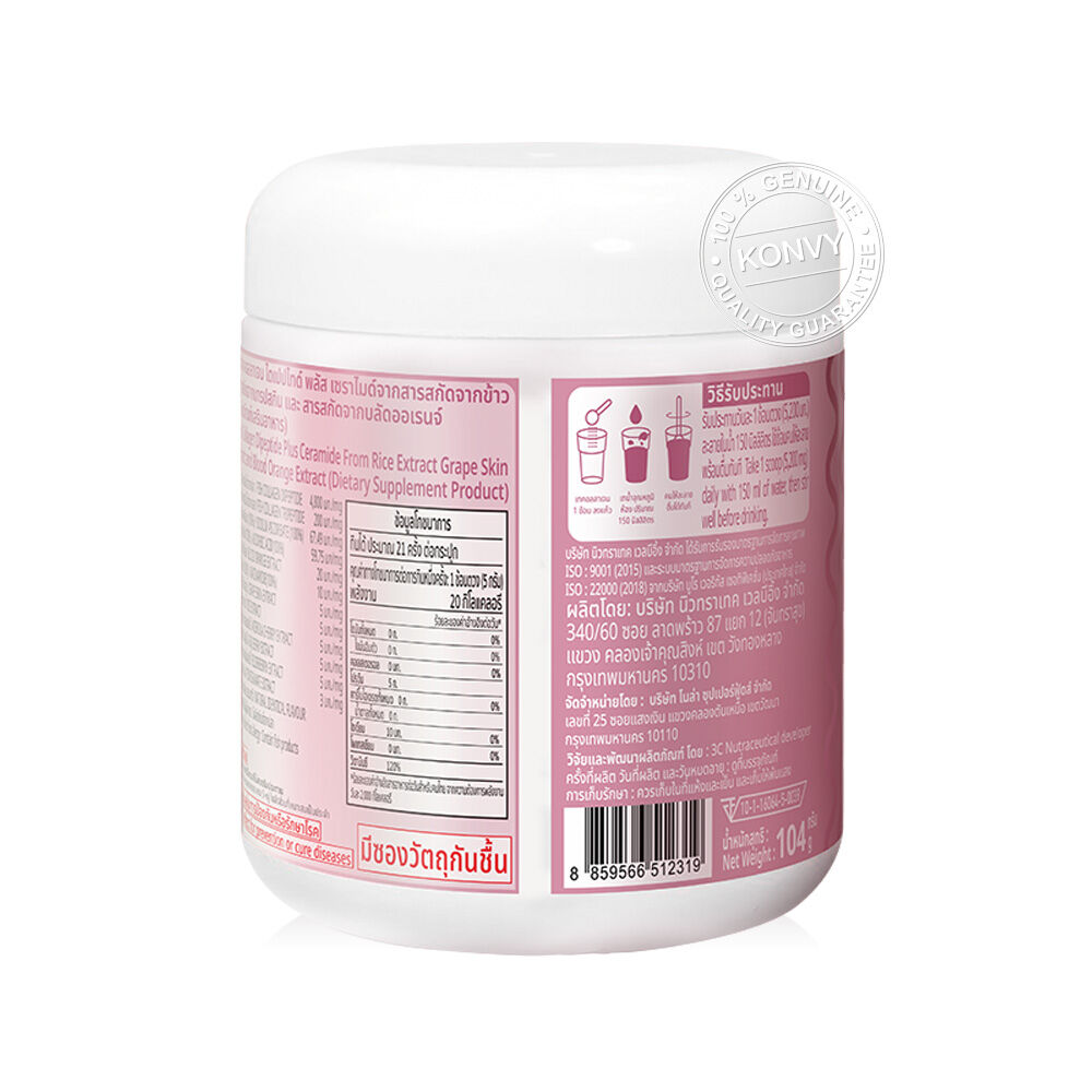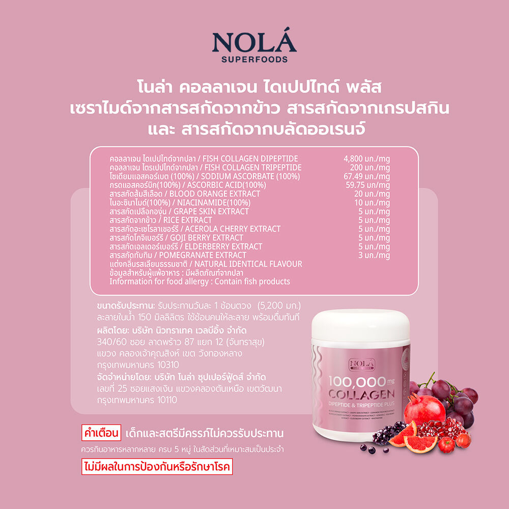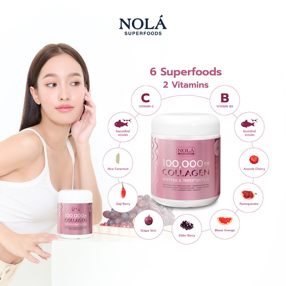 Nola 100,000 mg Collagen Dipeptide And Tripeptide Plus 104g ผลิตภัณฑ์เสริมอาหารคอลลาเจนชนิดชงดื่ม ประกอบด้วย Collagen Dipeptide ที่มีโมเลกุลขนาดเล็ก ดูดซึมง่าย และเสริมด้วย คอลลาเจน HACP จากประเทศญี่ปุ่น ที่มีคอลลาเจนสูงถึง 5,200 มก.