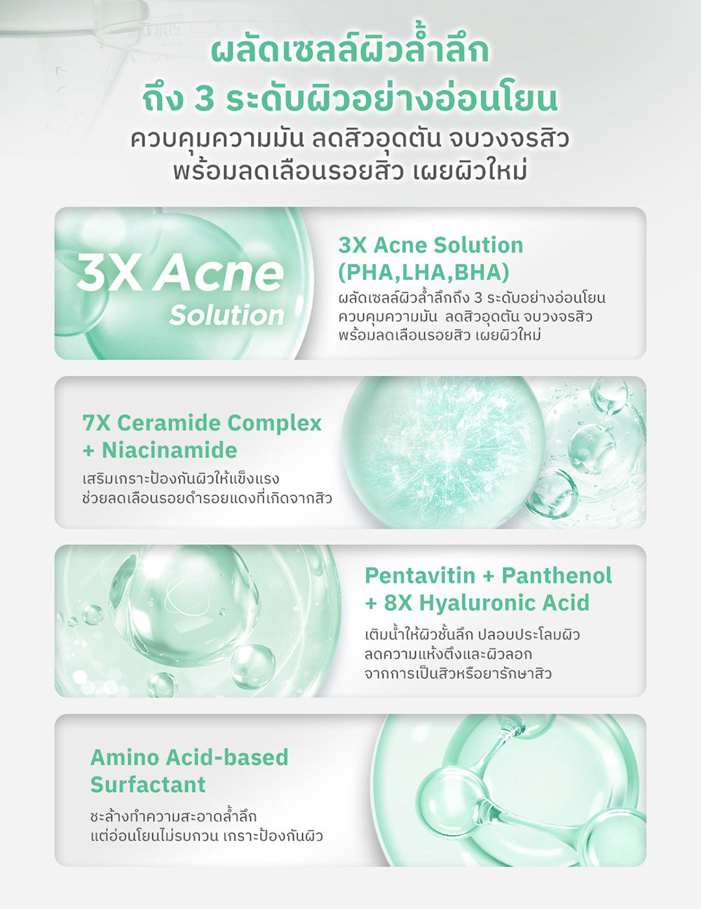 • 3X Acne Solution (PHA, LHA, BHA) ผลัดเซลล์ผิวล้ำลึกถึง 3 ระดับอย่างอ่อนโยน ควบคุมความมัน ลดสิวอุดตัน พร้อมลดเลือนรอยสิว เผยผิวใหม่