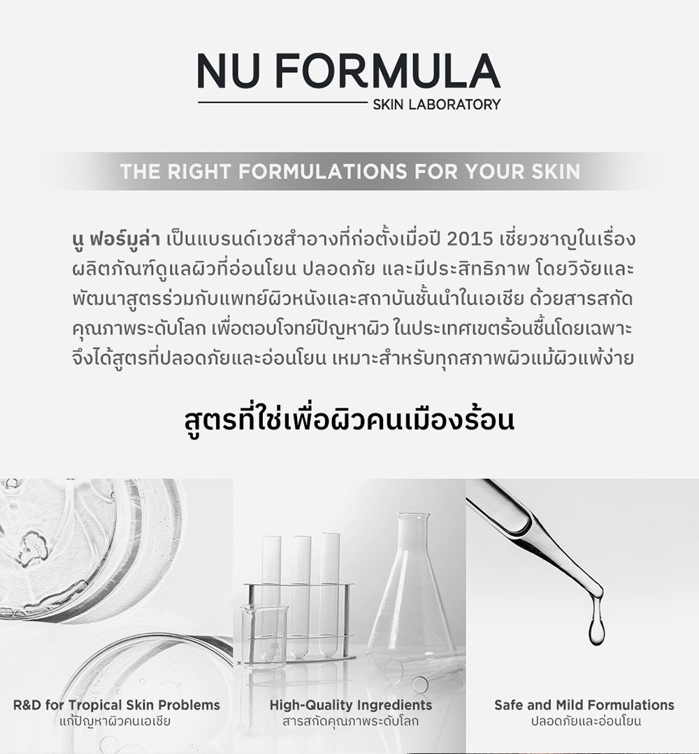 ผลิตภัณฑ์ของ Nu Formula ผ่านการตั้งใจคิดค้นและทดลองอย่างต่อเนื่องโดยใช้นวัตกรรมล่าสุด พิถีพิถันในทุกขั้นตอนการผลิตและบรรจุ ตามนโยบายของบริษัทฯ เพื่อให้ได้ผลิตภัณฑ์บำรุงผิวที่มีคุณภาพสูง ปลอดภัย ให้ทุกคนมีผิวพรรณกระจ่างใส