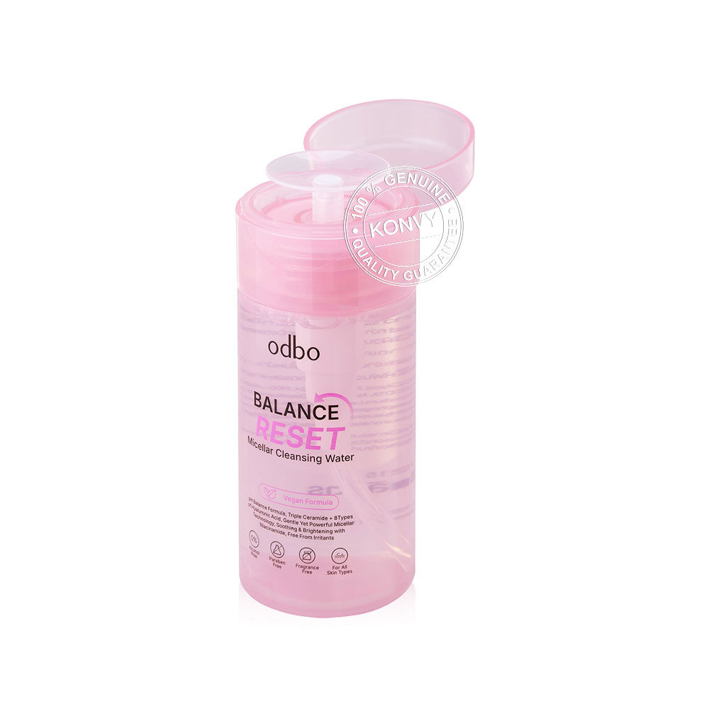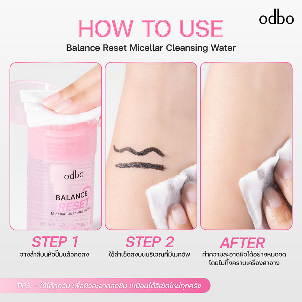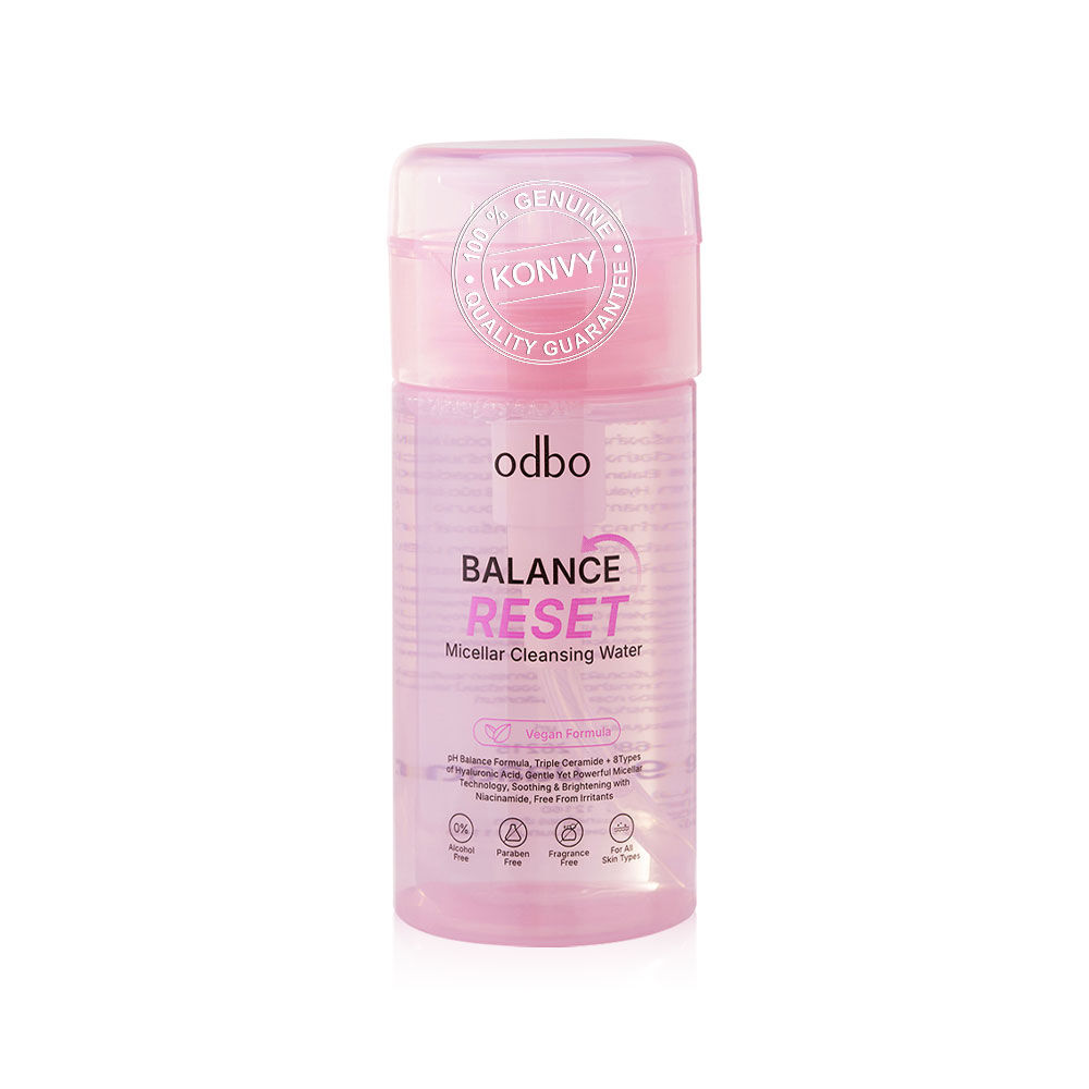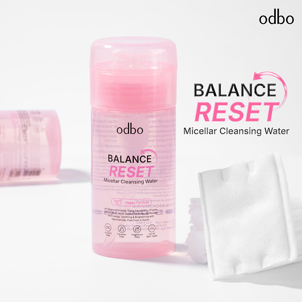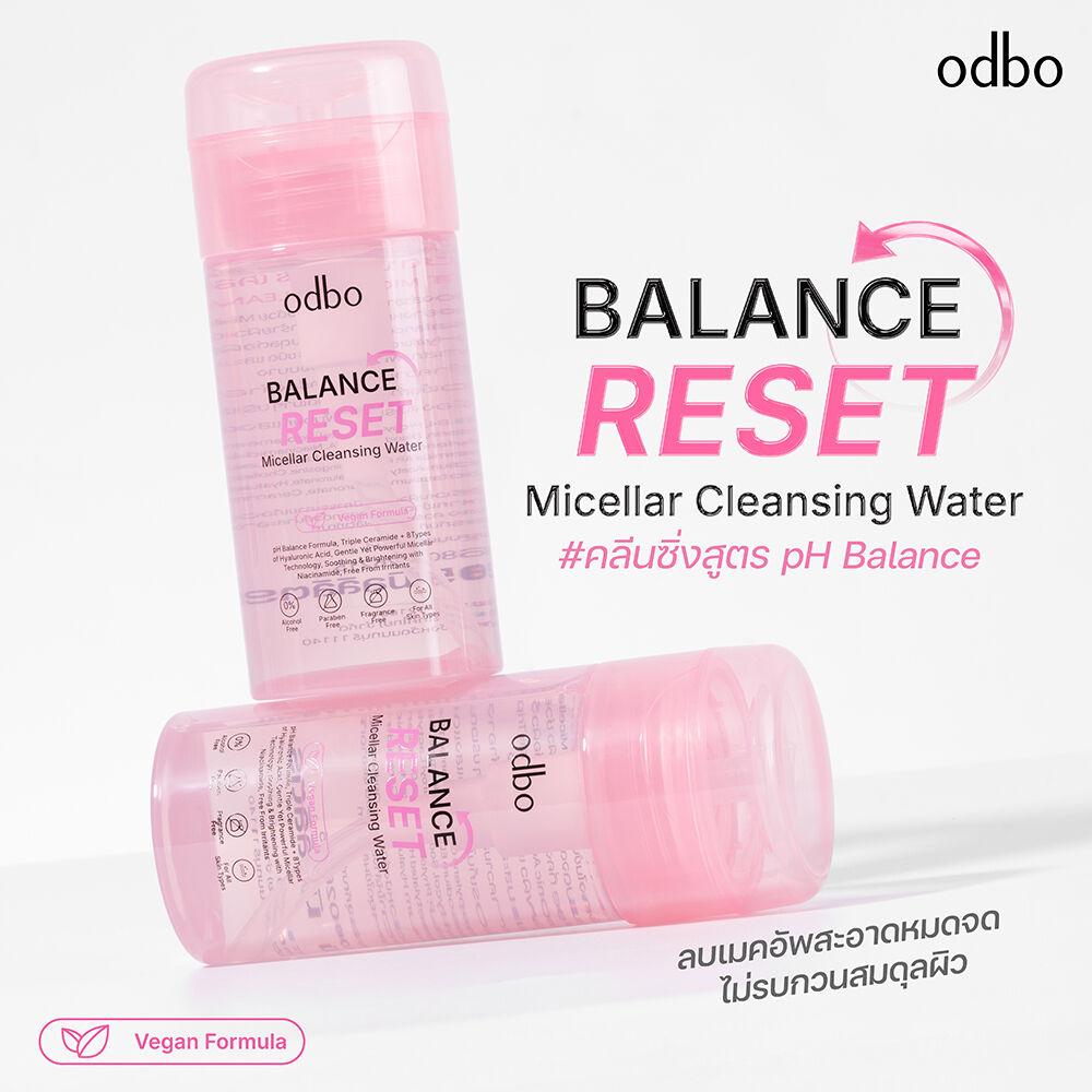 ODBO Balance Reset Micellar Cleansing Water 95ml ผลิตภัณฑ์ทำความสะอาดผิวหน้าและเครื่องสำอางในขั้นตอนเดียวด้วย Micellar Technology ที่ช่วยขจัดสิ่งสกปรก ความมันส่วนเกิน และเมคอัพกันน้ำได้อย่างหมดจดโดยไม่ทำร้ายผิว ช่วยลดการอุดตันที่อาจก่อให้เกิดสิว ด้วยสูตรอ่อนโยนมีค่า pH Balance ที่คงความสมดุลต่อผิวจึงไม่ทำให้ผิวแห้งตึงหรือสูญเสียความชุ่มชื้น พร้อมเพิ่มคุณค่าจาก Hyaluronic Acid กว่า 8 ชนิด และ Triple Ceramide ที่ให้ผิวคงความชุ่มชื้นอย่างเป็นธรรมชาติ เหมาะสำหรับทุกสภาพผิว แม้ผิวบอบบาง