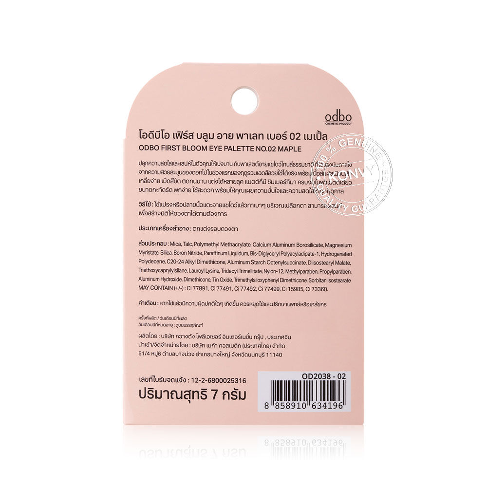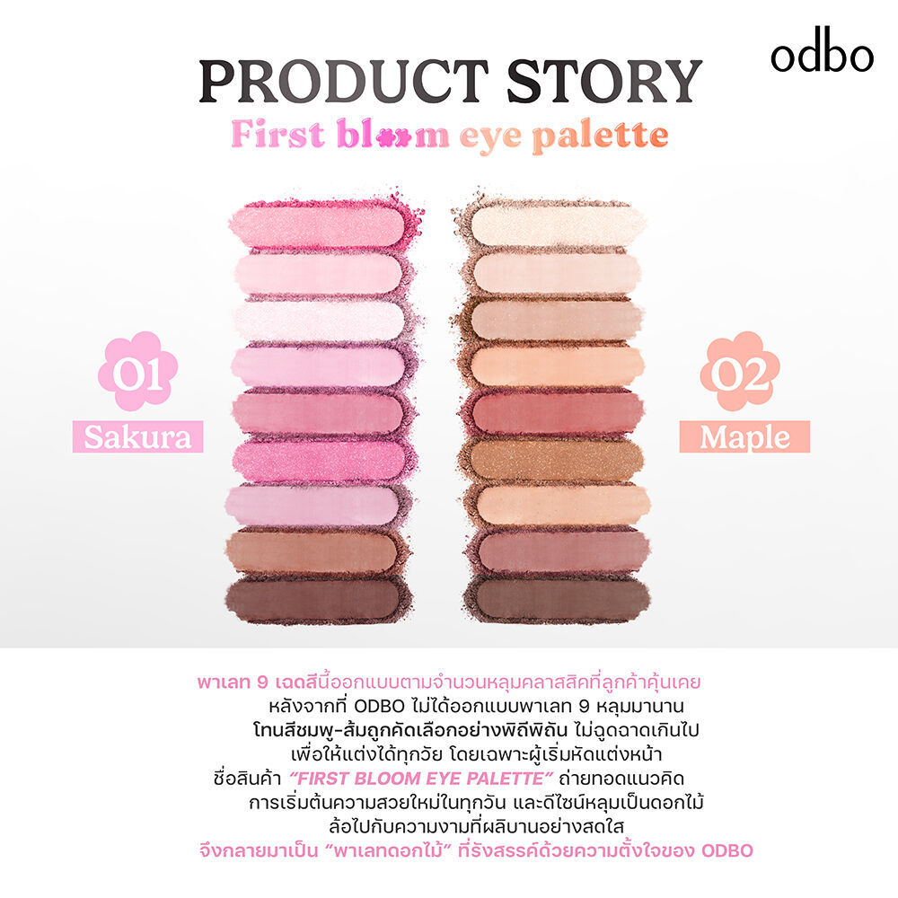 ODBO First Bloom Eye Palette 7g #02 Maple #พาเลทดอกไม้ ปลุกความสดใสและเสน่ห์ของคุณให้เบ่งบาน กับพาเลทอายแชโดว์โทนสีธรรมชาติ ที่ได้แรงบันดาลใจจากความสวยละมุนของดอกไม้ในช่วงแรกของฤดู รวมเฉดสีสวยใช้ได้จริง พร้อมเนื้อสัมผัสเนียนนุ่ม เกลี่ยง่าย เม็ดสีชัด ติดทานนาน แต่งได้หลายลุค แมทก็มี ชิมเมอร์ก็มา ครบจบในพาเลทเดียว ขนาดกะทัดรัด พกง่าย ใช้สะดวก พร้อมให้คุณเผยความมั่นใจและความสดใสได้ทุกฤดูกาล