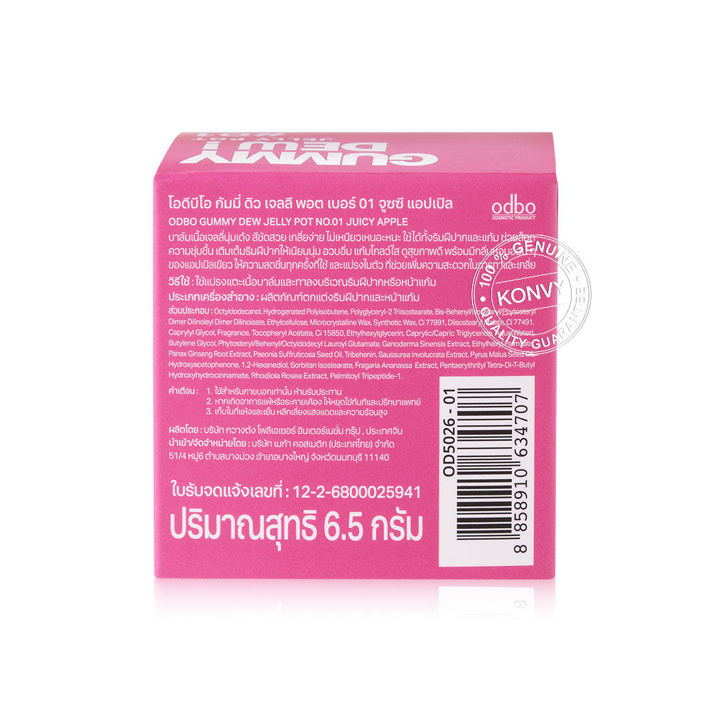 ODBO Gummy Dew Jelly Pot 6.5g #01 Juicy Apple #ลิปพอตกัมมี่เจลลี่ บาล์มเนื้อเจลลี่นุ่มเด้ง สีชัดสวย เกลี่ยง่าย ไม่เหนียวเหนอะหนะ ใช้ได้ทั้งริมฝีปากและแก้ม ช่วยล็อกความชุ่มชื้น เติมเต็มริมฝีปากให้เนียนนุ่ม อวบอิ่ม แก้มโกลว์ใส ดูสุขภาพดี พร้อมมีกลิ่นหอมอ่อนๆ ของแอปเปิ้ลเขียว ให้ความสดชื่นทุกครั้งที่ใช้ และแปรงในตัว ที่ช่วยเพิ่มความสะดวกในการทาและเกลี่ย