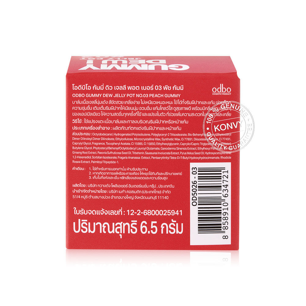ODBO Gummy Dew Jelly Pot 6.5g #03 Peach Gummy #ลิปพอตกัมมี่เจลลี่ บาล์มเนื้อเจลลี่นุ่มเด้ง สีชัดสวย เกลี่ยง่าย ไม่เหนียวเหนอะหนะ ใช้ได้ทั้งริมฝีปากและแก้ม ช่วยล็อกความชุ่มชื้น เติมเต็มริมฝีปากให้เนียนนุ่ม อวบอิ่ม แก้มโกลว์ใส ดูสุขภาพดี พร้อมมีกลิ่นหอมอ่อนๆ ของแอปเปิ้ลเขียว ให้ความสดชื่นทุกครั้งที่ใช้ และแปรงในตัว ที่ช่วยเพิ่มความสะดวกในการทาและเกลี่ย