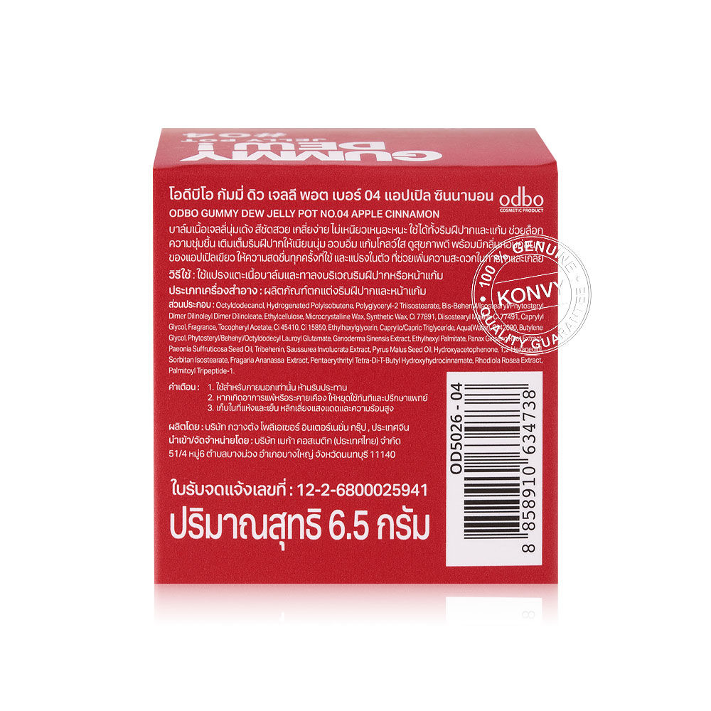 ODBO Gummy Dew Jelly Pot 6.5g #04 Apple Cinnamon #ลิปพอตกัมมี่เจลลี่ บาล์มเนื้อเจลลี่นุ่มเด้ง สีชัดสวย เกลี่ยง่าย ไม่เหนียวเหนอะหนะ ใช้ได้ทั้งริมฝีปากและแก้ม ช่วยล็อกความชุ่มชื้น เติมเต็มริมฝีปากให้เนียนนุ่ม อวบอิ่ม แก้มโกลว์ใส ดูสุขภาพดี พร้อมมีกลิ่นหอมอ่อนๆ ของแอปเปิ้ลเขียว ให้ความสดชื่นทุกครั้งที่ใช้ และแปรงในตัว ที่ช่วยเพิ่มความสะดวกในการทาและเกลี่ย