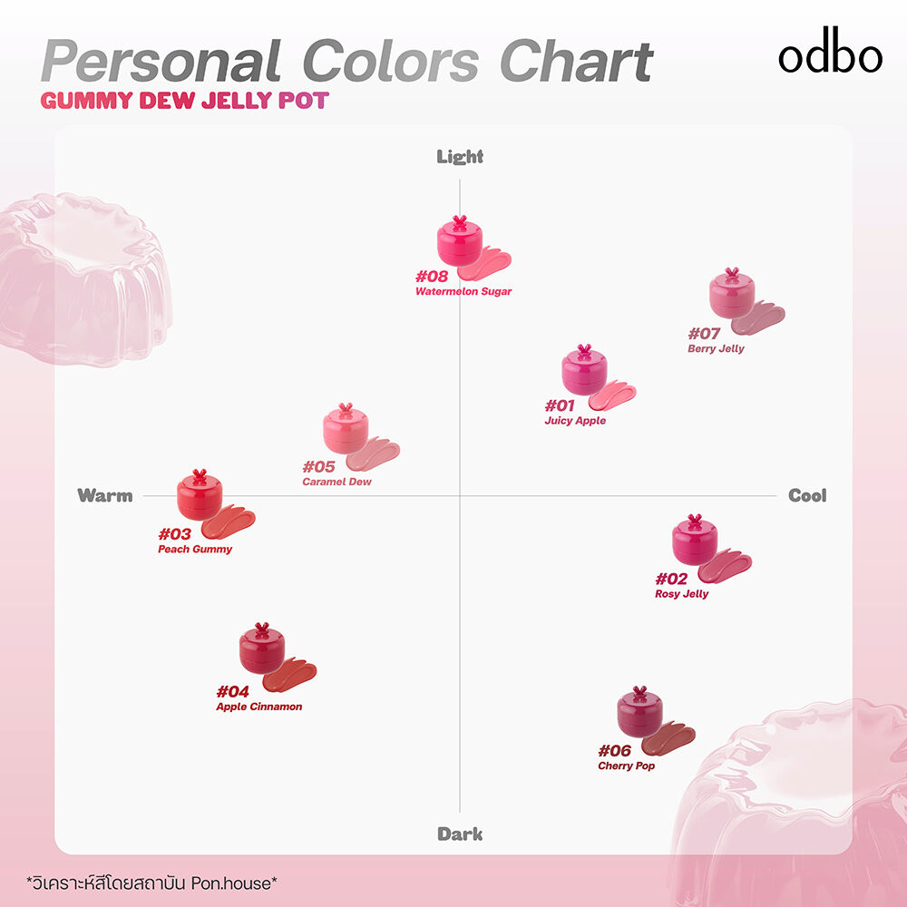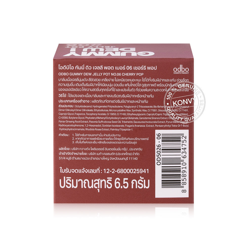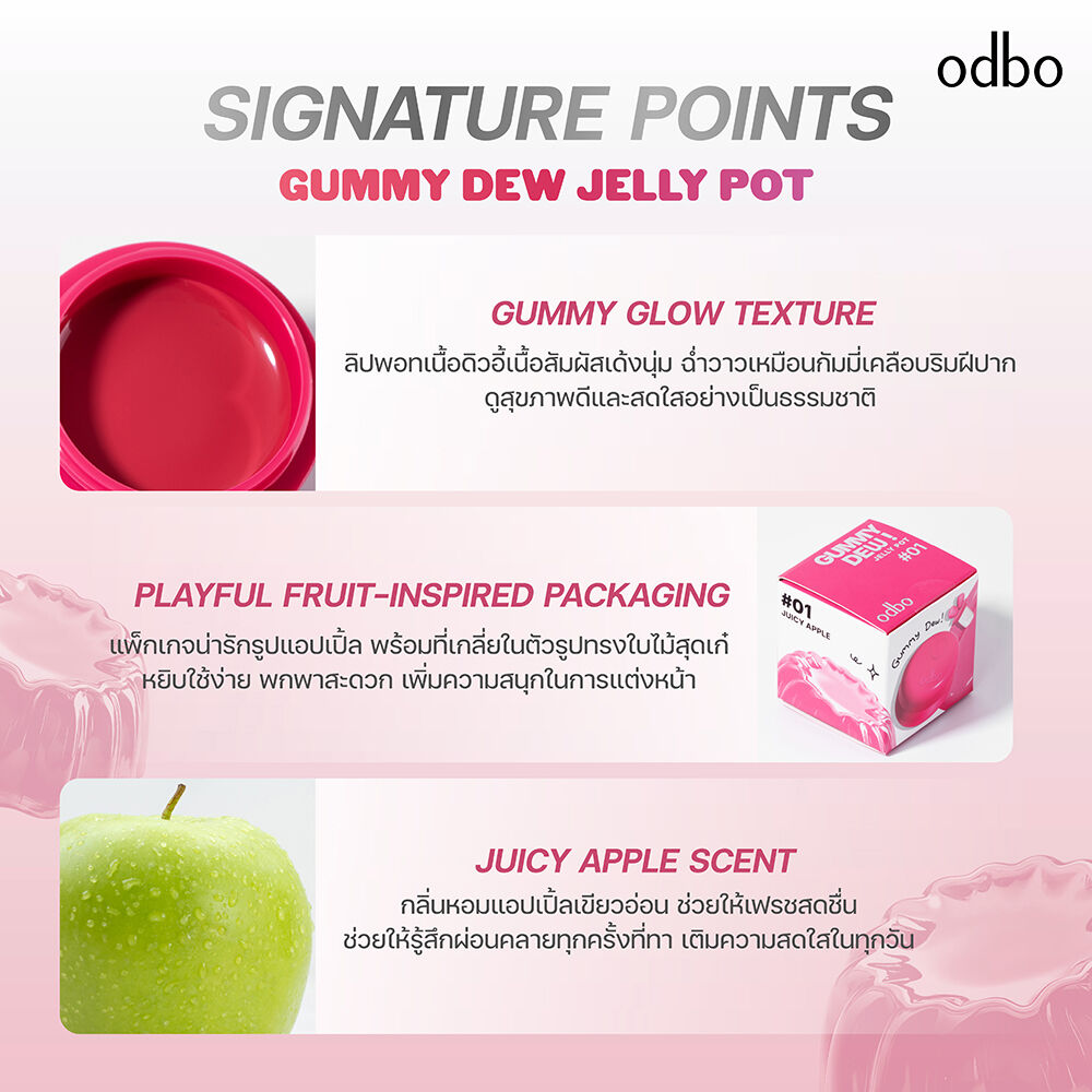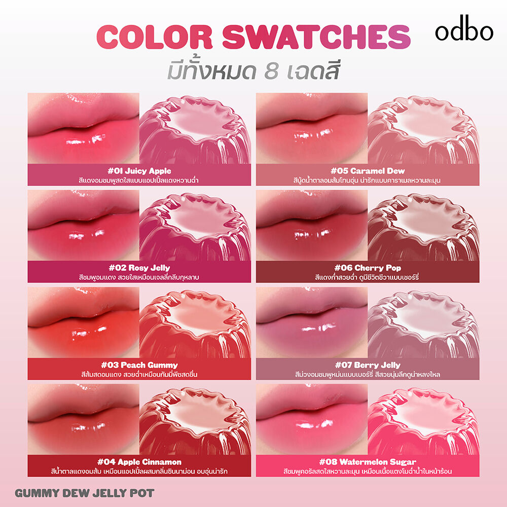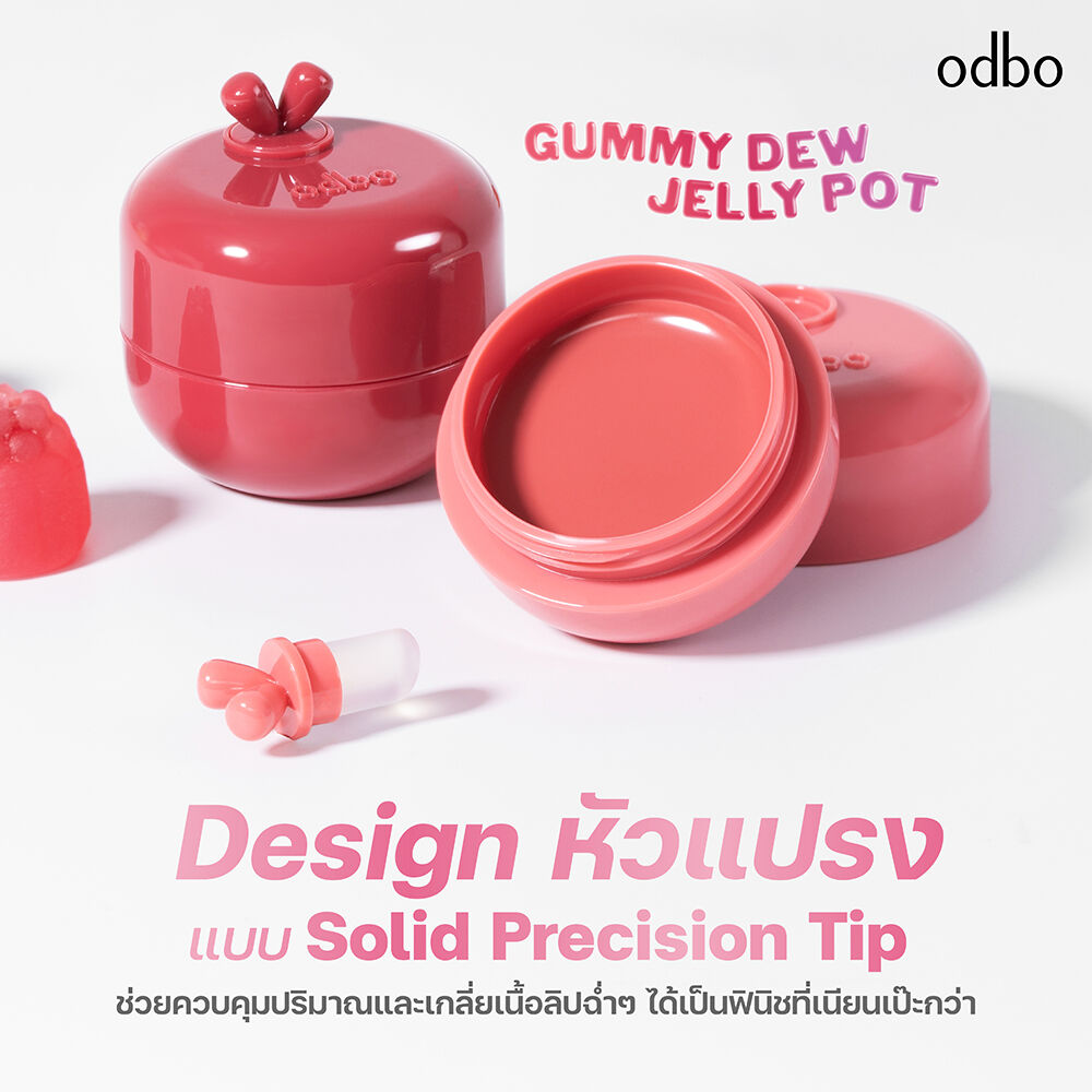 ODBO Gummy Dew Jelly Pot 6.5g #06 Cherry Pop #ลิปพอตกัมมี่เจลลี่ บาล์มเนื้อเจลลี่นุ่มเด้ง สีชัดสวย เกลี่ยง่าย ไม่เหนียวเหนอะหนะ ใช้ได้ทั้งริมฝีปากและแก้ม ช่วยล็อกความชุ่มชื้น เติมเต็มริมฝีปากให้เนียนนุ่ม อวบอิ่ม แก้มโกลว์ใส ดูสุขภาพดี พร้อมมีกลิ่นหอมอ่อนๆ ของแอปเปิ้ลเขียว ให้ความสดชื่นทุกครั้งที่ใช้ และแปรงในตัว ที่ช่วยเพิ่มความสะดวกในการทาและเกลี่ย