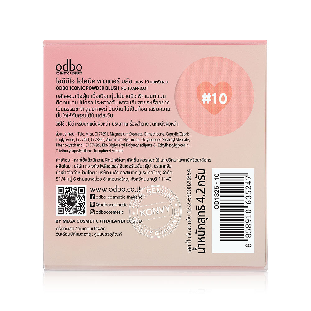 ODBO Iconic Powder Blush 4.2g #OD1325-10 บลัชออนเนื้อฝุ่น สัมผัสเนียนนุ่ม เม็ดสีชัดแน่น เกลี่ยง่าย ติดทนนาน สีไม่ดรอประหว่างวัน ไม่จับตัวเป็นก้อน มอบพวงแก้มสีสวยระเรื่อ ดูสุขภาพดี มั่นใจได้ตลอดวัน