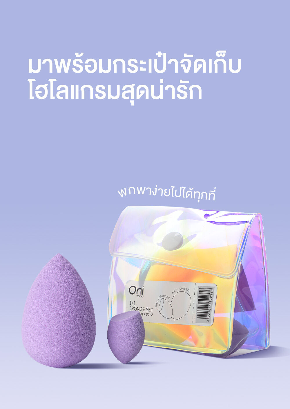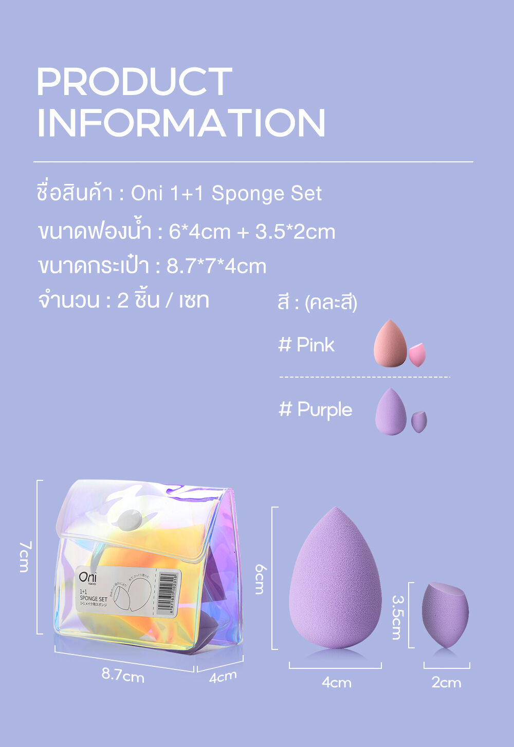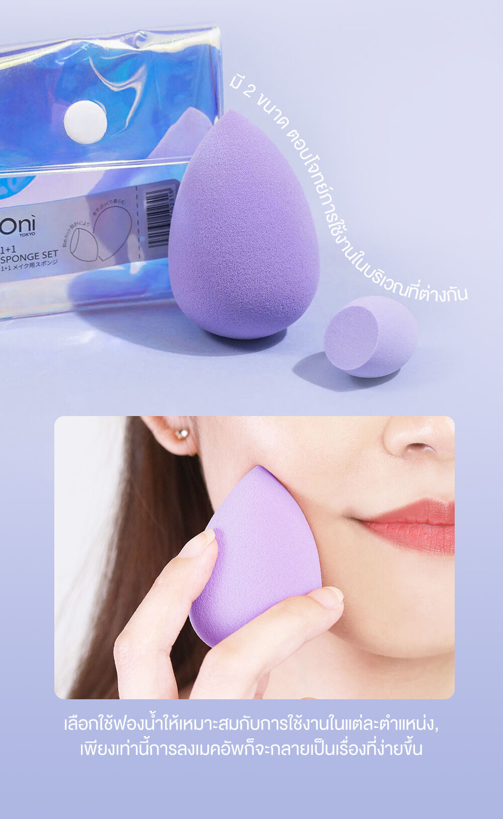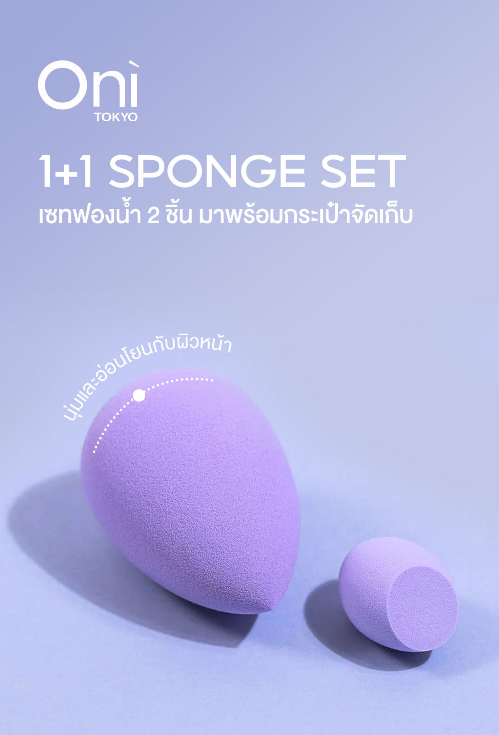 Oni 1+1 Sponge Set [Random 1 Colors] เซทฟองน้ำแต่งหน้า 2 ชิ้น ในเซทประกอบด้วย ฟองน้ำทรงหยดน้ำ และฟองน้ำตัดเฉียง เพื่อตอบโจทย์ทุกส่วนของใบหน้า ให้การแต่งหน้าครบจบทุกขั้นตอน ผลิตด้วยวัสดุฟองน้ำนุ่มพิเศษ ยืดหยุ่น อ่อนโยนต่อผิวหน้า ช่วยให้การลงเมคอัพประเภทลิควิดและครีมได้อย่างเรียบเนียน สม่ำเสมอ ดูเป็นธรรมชาติ มาพร้อมกระเป๋าจัดเก็บสุดน่ารัก