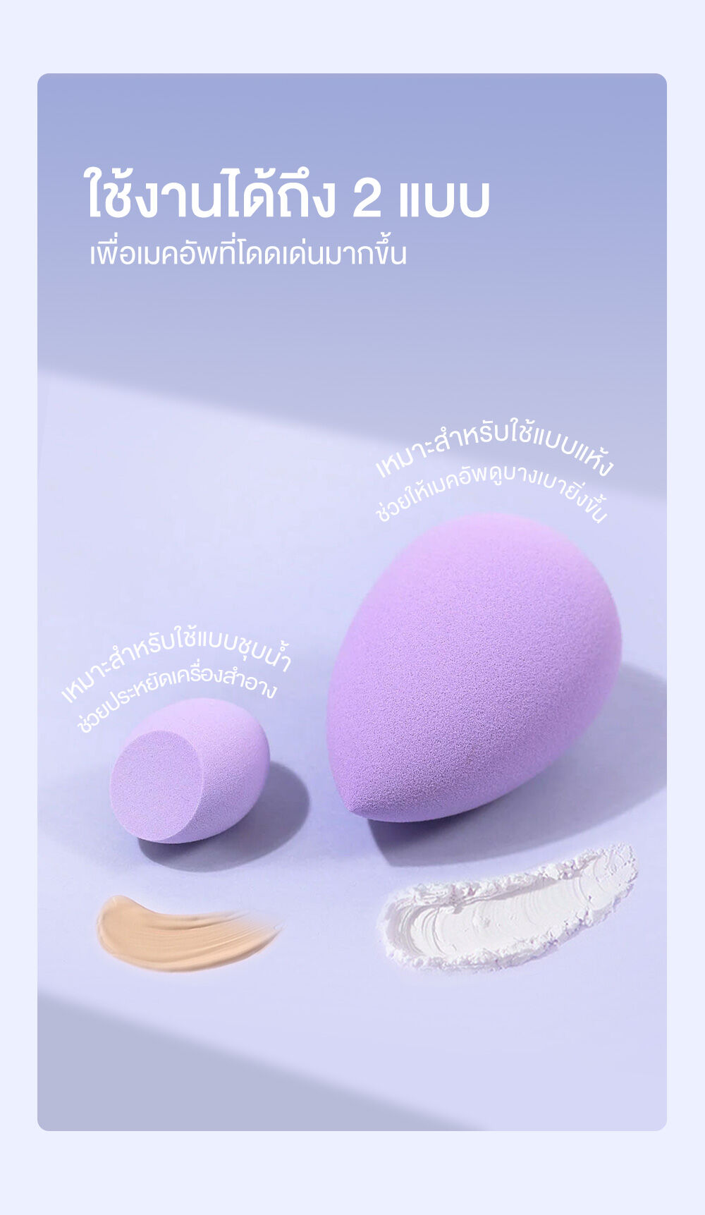 • สามารถใช้ได้ทั้งแบบเปียก และแบบแห้ง (Wet & Dry Use) เพื่อการเกลี่ยเมคอัพได้เรียบเนียน และบางเบา