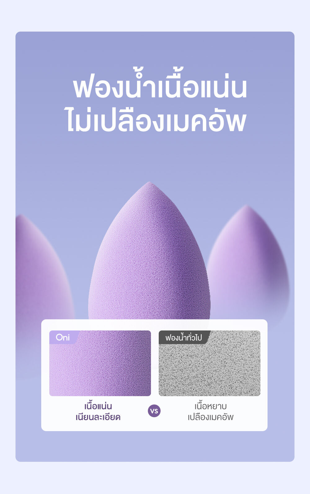 • ฟองน้ำทรงหยดน้ำ: ใช้สำหรับเกลี่ยเมคอัพในบริเวณกว้าง เช่น แก้ม, หน้าผาก และคาง