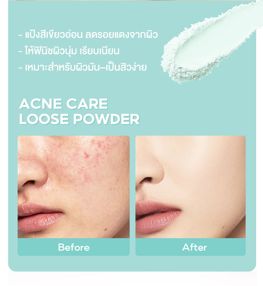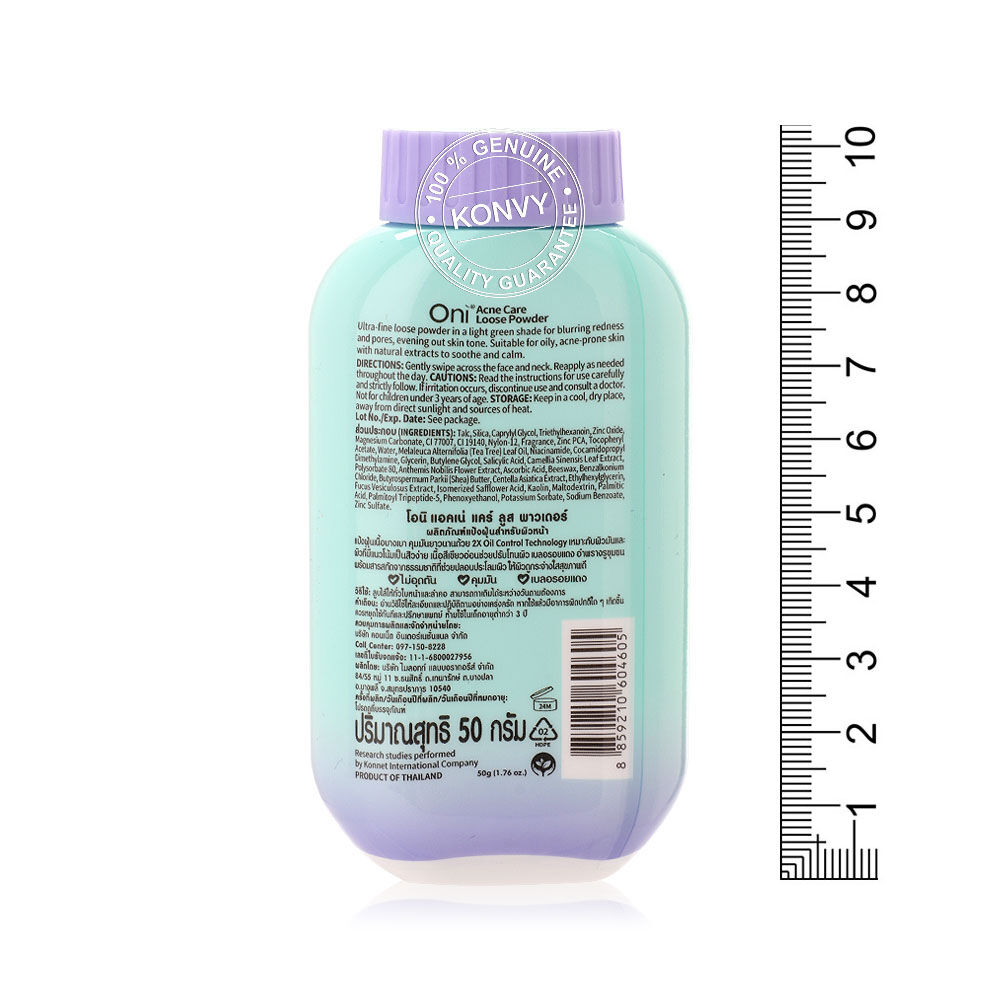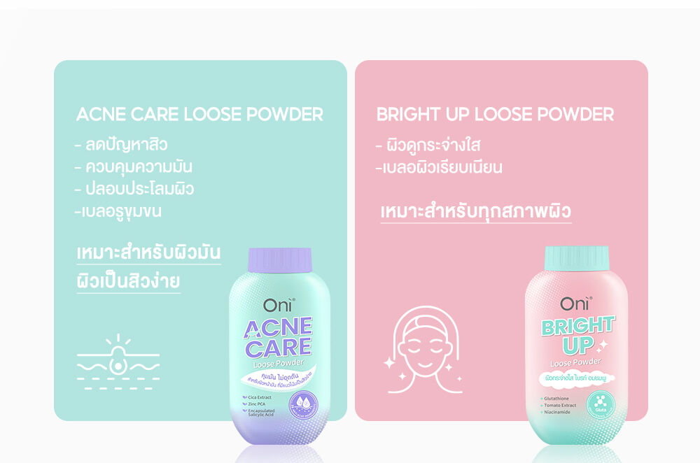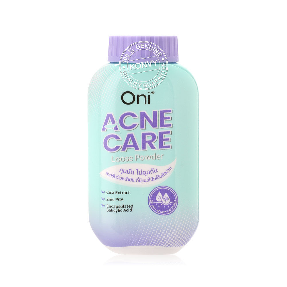 Oni Acne Care Loose Powder 50g แป้งฝุ่นโปร่งแสง (Ultra-Fine Loose Powder) ที่ออกแบบมาสำหรับผิวหน้ามัน มีแนวโน้มเป็นสิวง่ายโดยเฉพาะ เนื้อแป้งสีเขียวอ่อน ช่วยปรับโทนผิว ให้สัมผัสเนียนละเอียด บางเบา ช่วยเบลอรูขุมขนและรอยแดง พร้อมผสานเทคโนโลยีและส่วนผสมสำคัญ (Anti-Acne Ingredients) เพื่อช่วยควบคุมความมันส่วนเกิน และดูแลปัญหาสิวไปพร้อมกัน