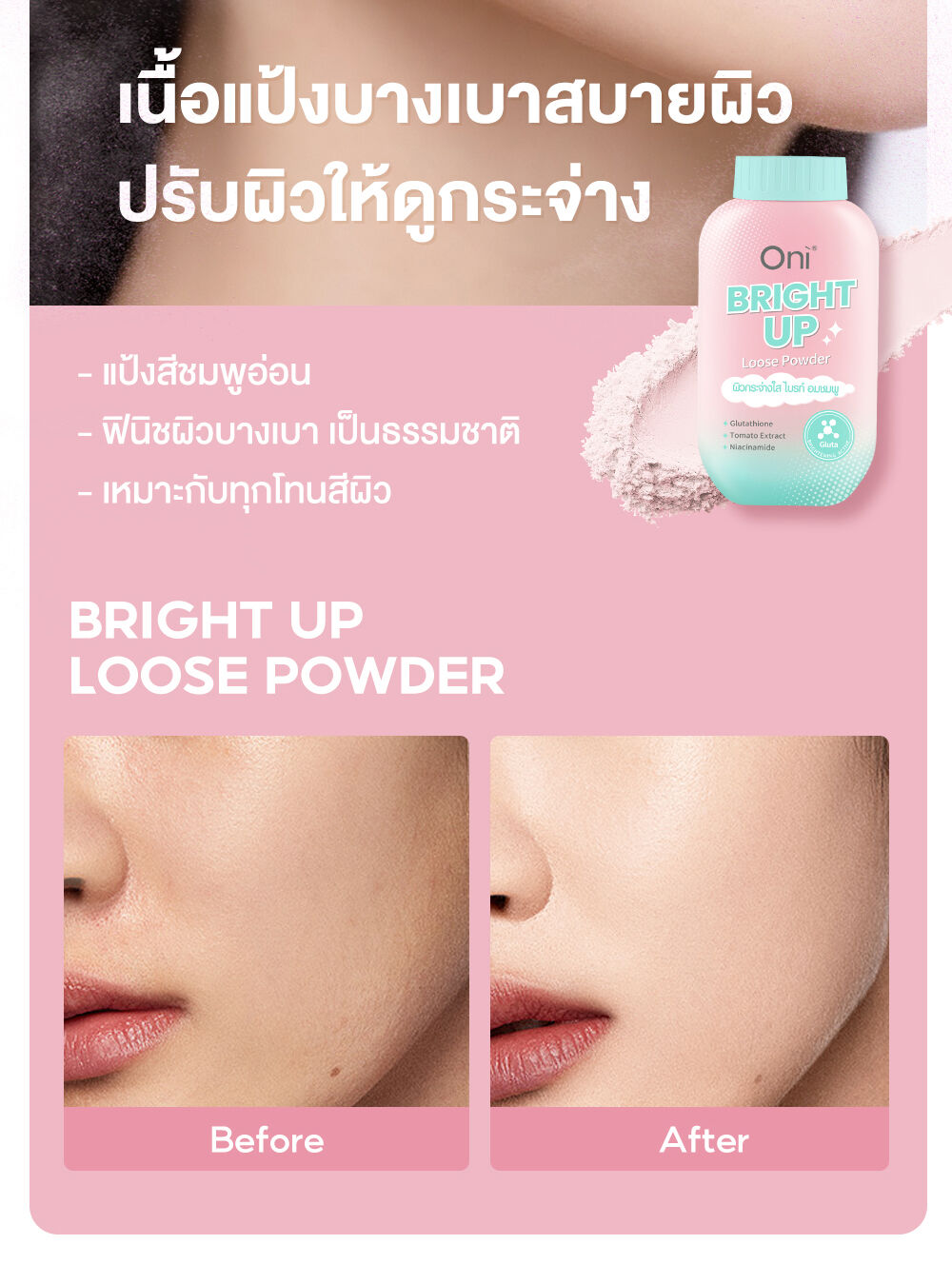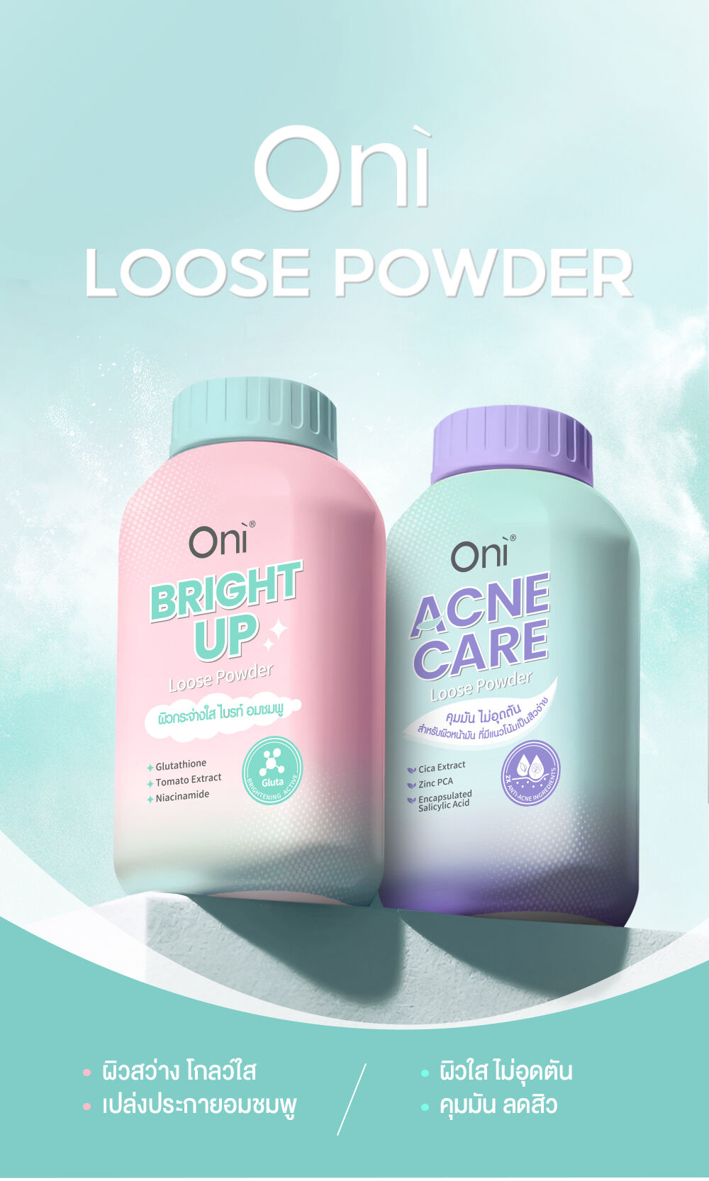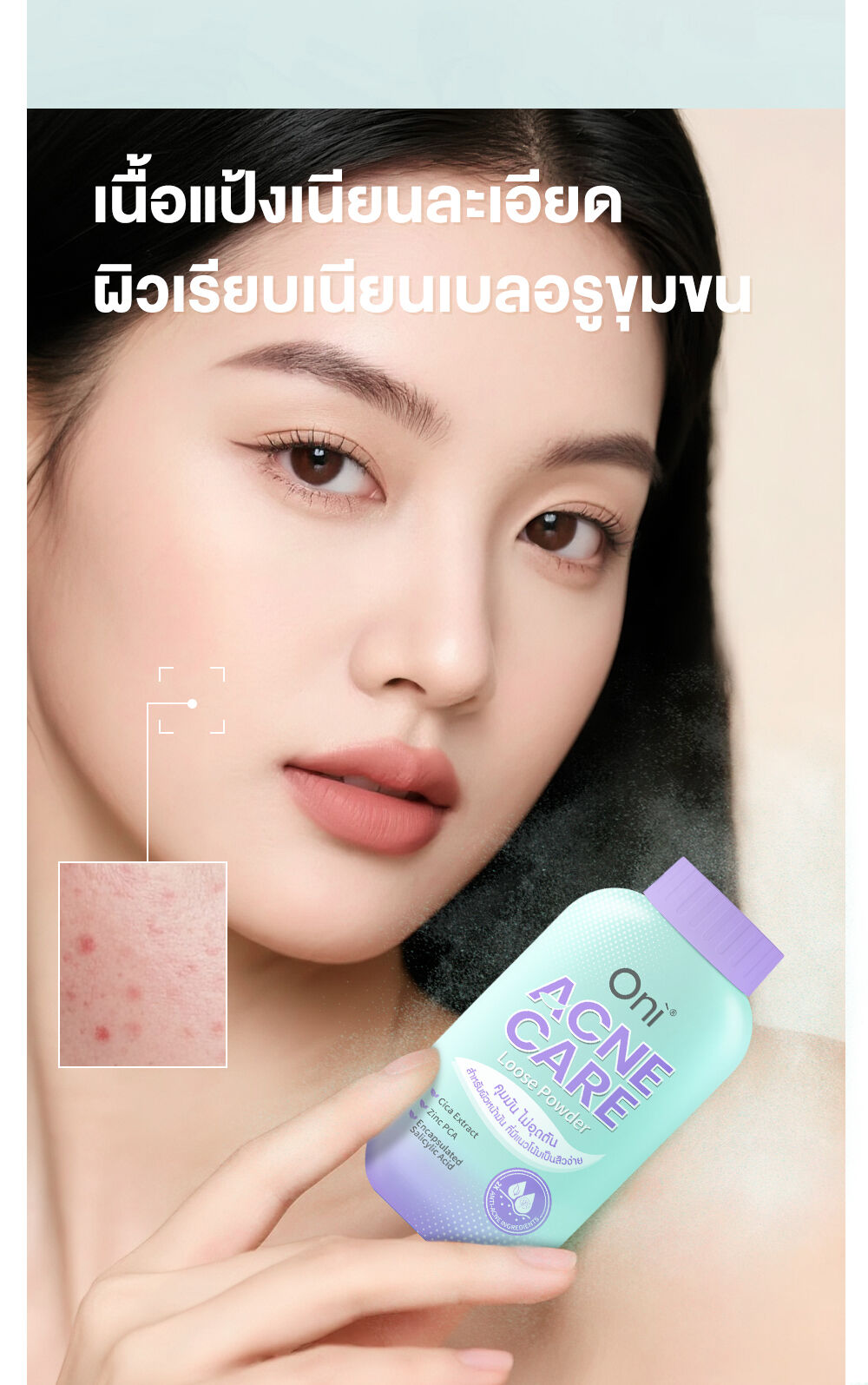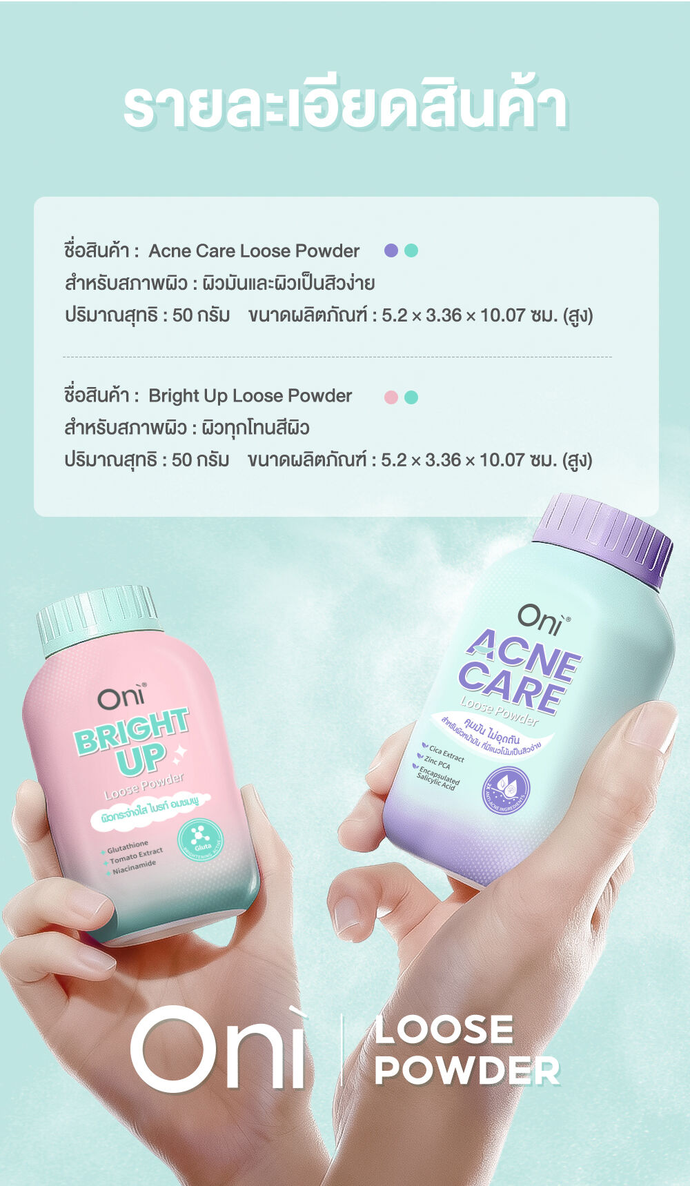 Oni Acne Care Loose Powder 50g แป้งฝุ่นโปร่งแสง (Ultra-Fine Loose Powder) ที่ออกแบบมาสำหรับผิวหน้ามัน มีแนวโน้มเป็นสิวง่ายโดยเฉพาะ เนื้อแป้งสีเขียวอ่อน ช่วยปรับโทนผิว ให้สัมผัสเนียนละเอียด บางเบา ช่วยเบลอรูขุมขนและรอยแดง พร้อมผสานเทคโนโลยีและส่วนผสมสำคัญ (Anti-Acne Ingredients) เพื่อช่วยควบคุมความมันส่วนเกิน และดูแลปัญหาสิวไปพร้อมกัน