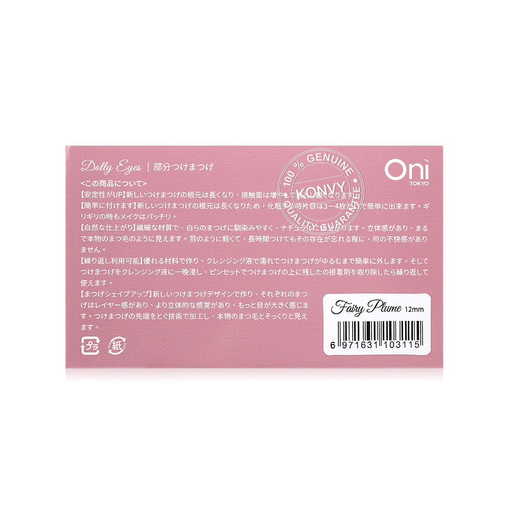Oni Dolly Eyes Cluster Eyelashes 12mm #Fairy Plume ชุดขนตาปลอมแบบช่อ ความยาวระดับ 12มม. ผลิตจากวัสดุชั้นเยี่ยมละเอียดอ่อน เข้ากับขนตาของคุณได้อย่างง่ายดายและให้ลุคที่ดูเป็นธรรมชาติ ดีไซน์ 3มิติเนียนราวกับขนตาจริง เบาดุจขนนก พร้อมตอบโจทย์เมคอัพทุกสไตล์ของสาวๆ