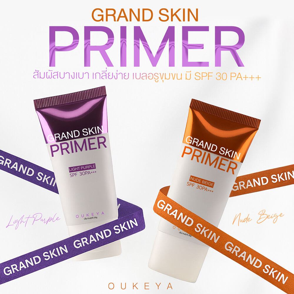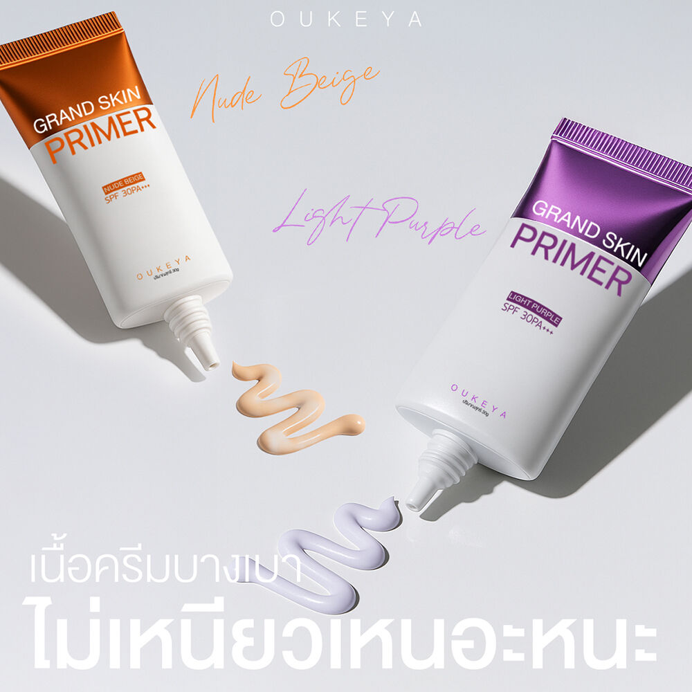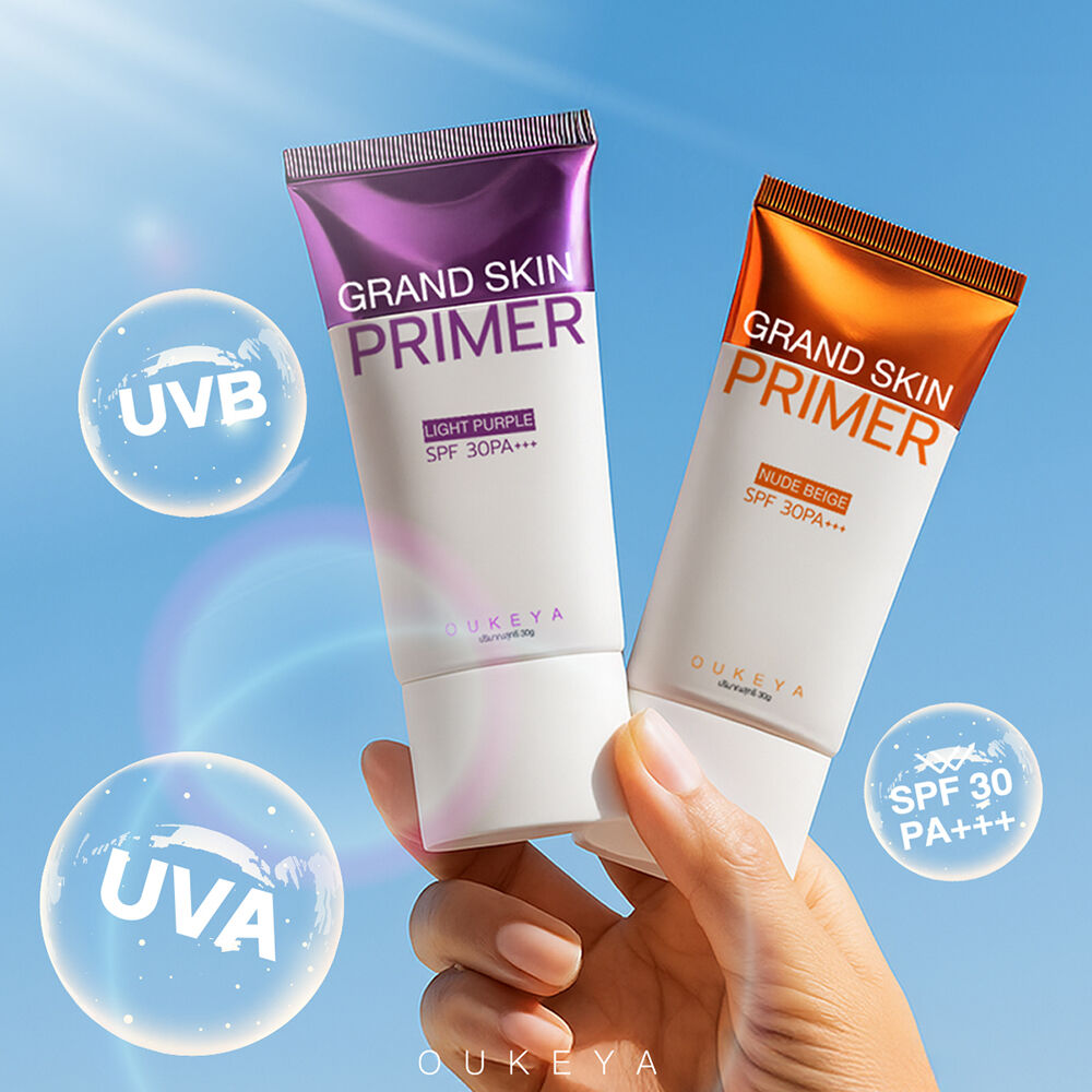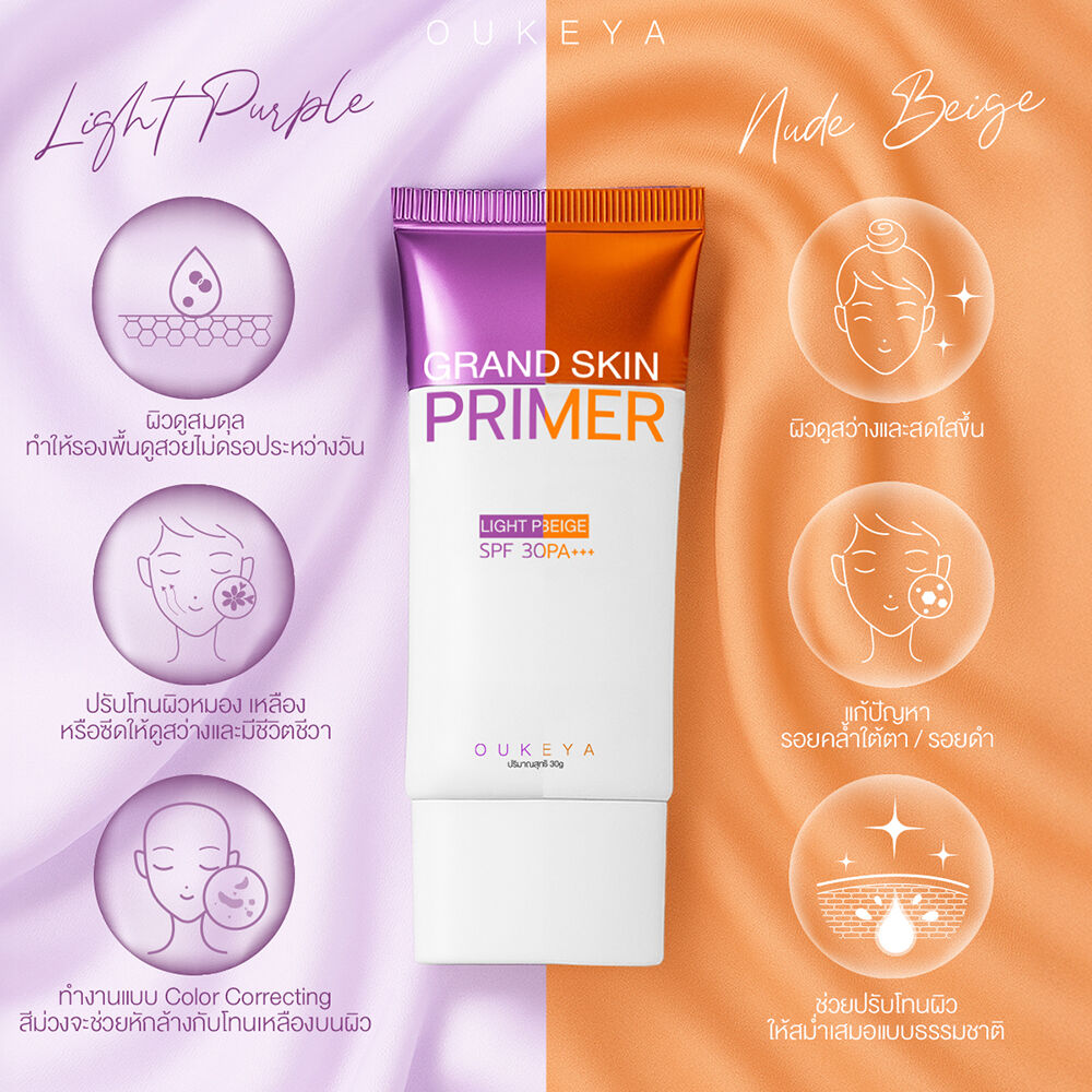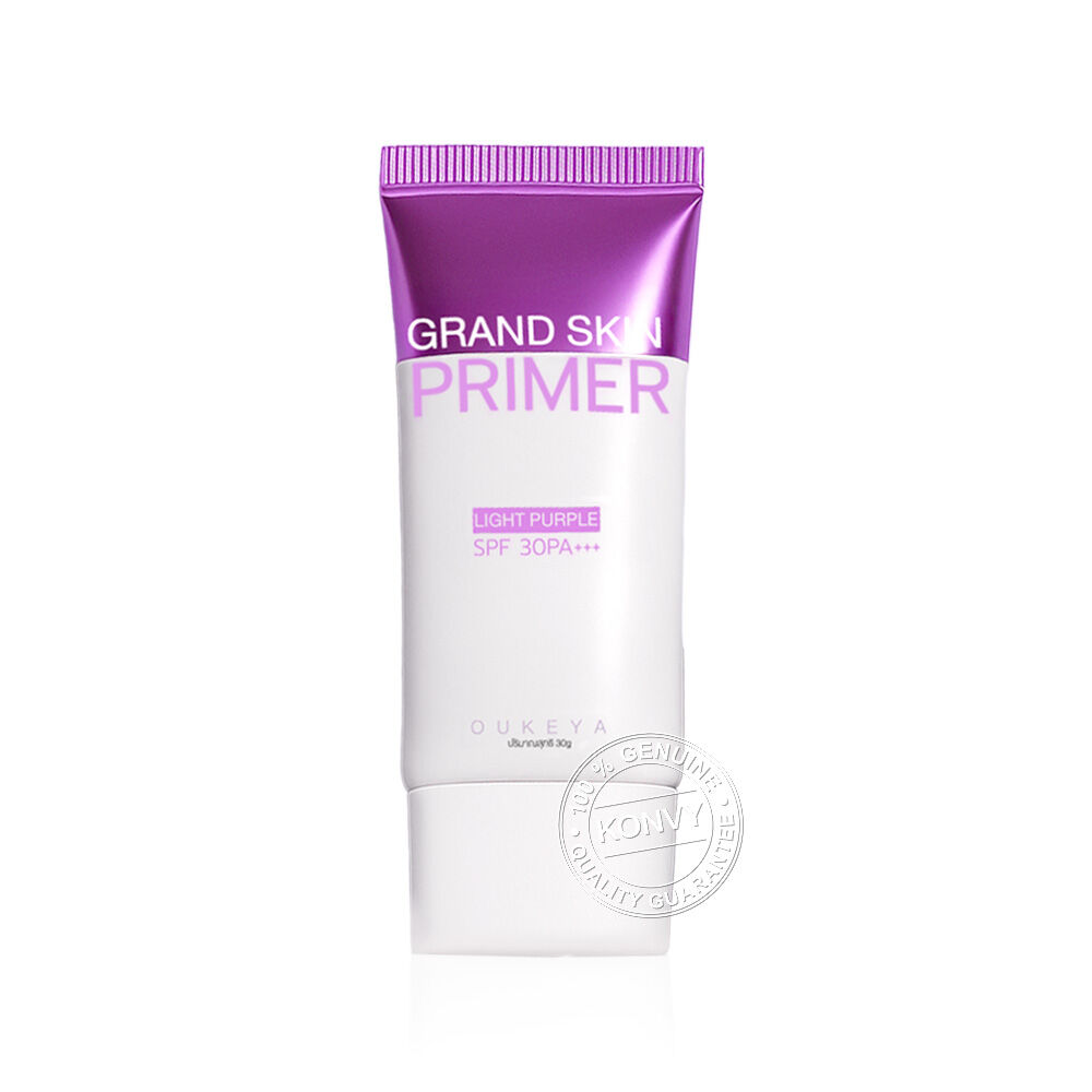 OUKEYA Grand Skin Primer Light Purple 30g ไพรเมอร์ที่ช่วยเตรียมผิวให้พร้อมก่อนการแต่งหน้า ด้วยเนื้อสัมผัสบางเบา เกลี่ยง่าย ช่วยปรับสภาพผิวให้เรียบเนียนและสว่างขึ้นประมาณ 1 ระดับโดยไม่ทำให้หน้าลอยหรือสีผิวดูเทา พร้อมเบลอรูขุมขน เติมเต็มร่องผิวและริ้วรอยเล็กๆ ให้ผิวดูเนียนละเอียดอย่างเป็นธรรมชาติ ช่วยให้เมคอัพติดทนนานยิ่งขึ้นและปรับโทนสีผิวให้สม่ำเสมอ ผิวดูไบรท์ กระจ่างใสก่อนลงรองพื้น อีกทั้งยังมี SPF30 PA+++ ช่วยปกป้องผิวจากแสงแดด ป้องกันผิวหมองคล้ำและความเสียหายจากรังสี UVA/UVB