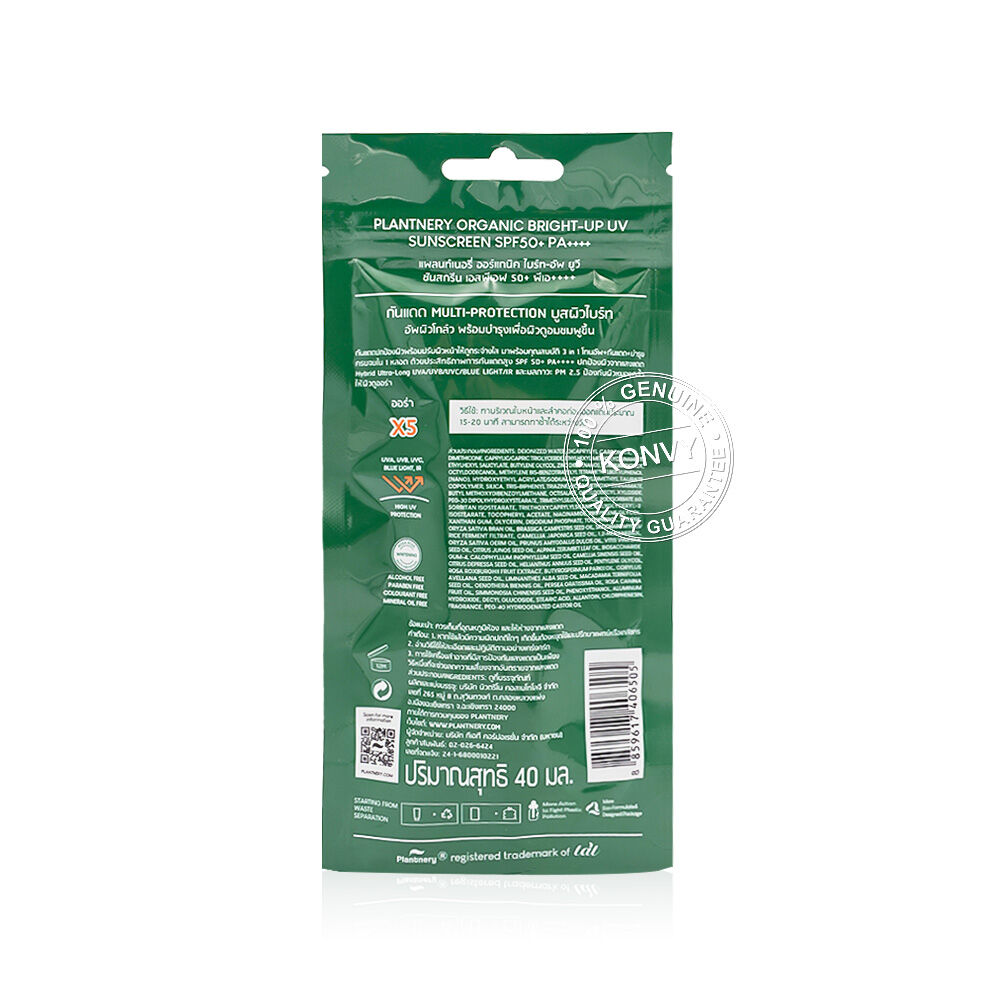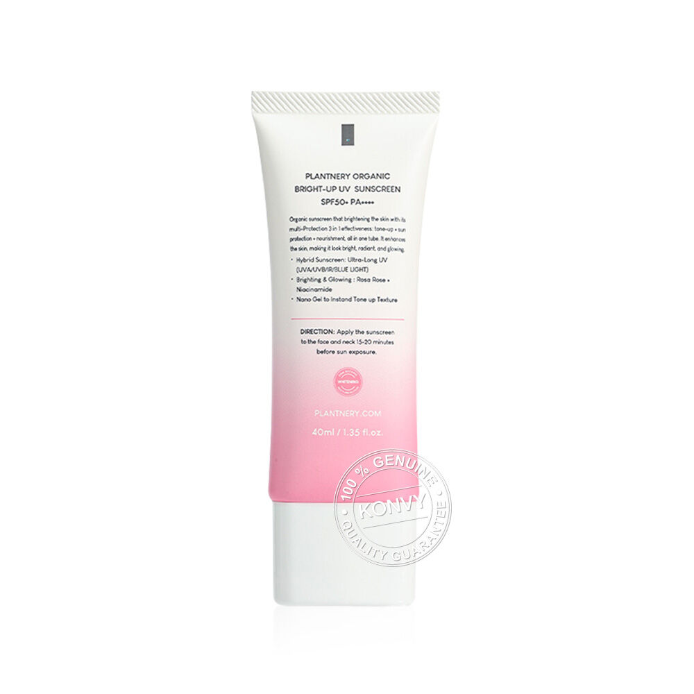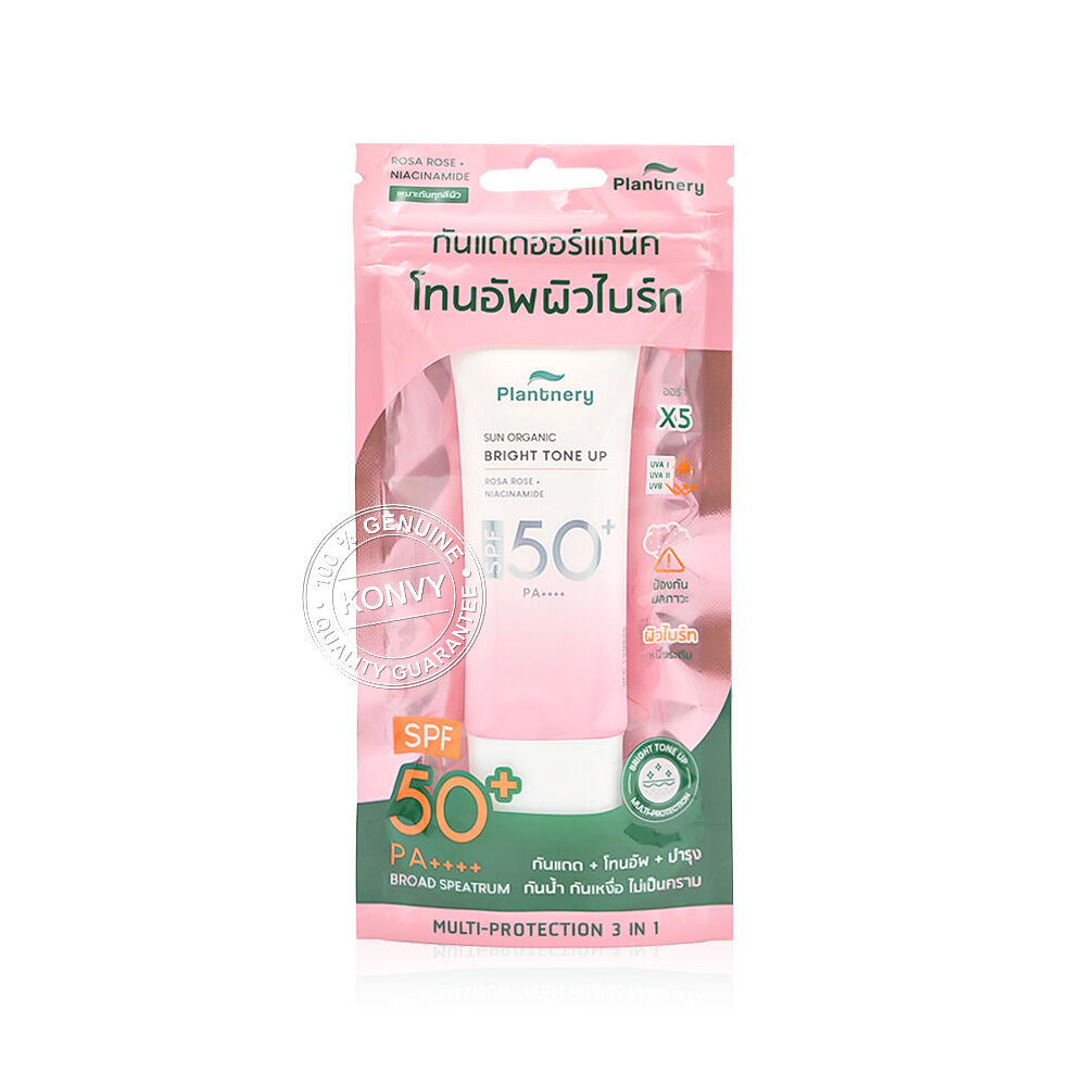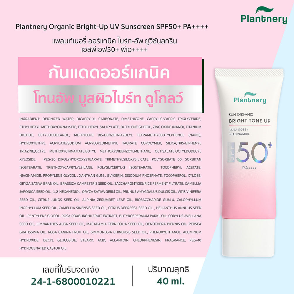 Plantnery Organic Bright-Up UV Sunscreen SPF50+ PA++++ 40ml กันแดดโทนอัพ ปกป้องผิวพร้อมปรับผิวหน้าให้ดูกระจ่างใส มาพร้อมคุณสมบัติ 3in1 โทนอัพ+กันแดด+บำรุง multi-Protection ครบใน 1 หลอด พร้อมบำรุงเพื่อผิวดูอมชมพูขึ้น ปกป้องผิวหมองคล้ำให้ผิวดูออร่า ด้วยประสิทธิภาพการกันแดดสูง SPF50+ PA++++ ปกป้องผิวจากแสงแดดแบบ Hybrid Ultra-Long UVA/UVB/UVC/Blue Light/IR และมลภาวะ ด้วยการเป็นฟิล์มบางเคลือบผิวช่วยยึดเกาะแนบสนิท พร้อมผสานด้วยคุณค่าสารสกัดจากธรรมชาติ Rosa Rose จากกุหลาบป่า บำรุงผิวให้ดูอ่อนเยาว์ปกป้องผิวจากการเกิดริ้วรอยและการเกิดผิวแก่ก่อนวัย พร้อมฟื้นบำรุงผิวจากการโดนรังสี UV ทำร้าย ออกแดดนานไม่ทำให้แสบผิว