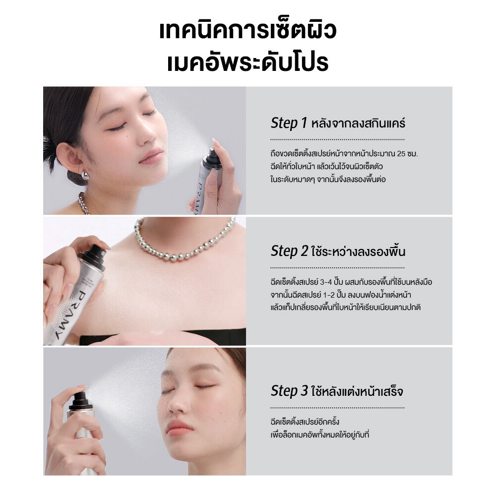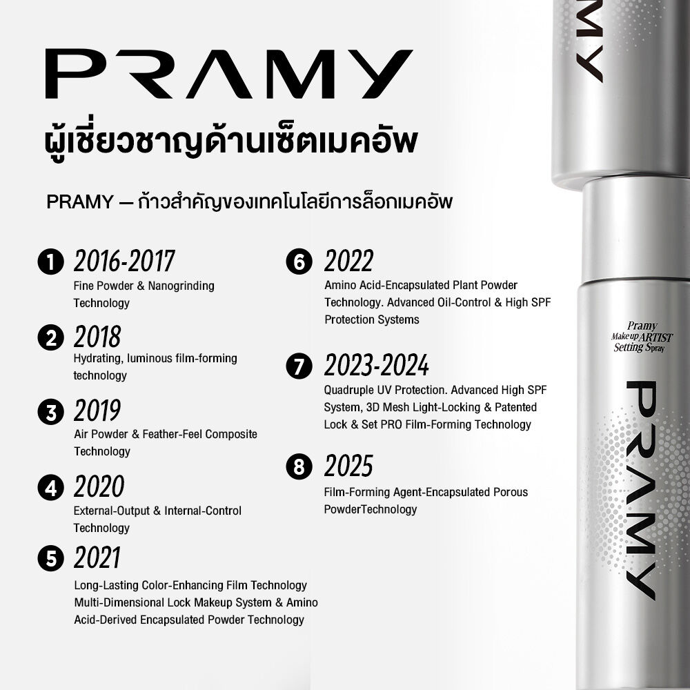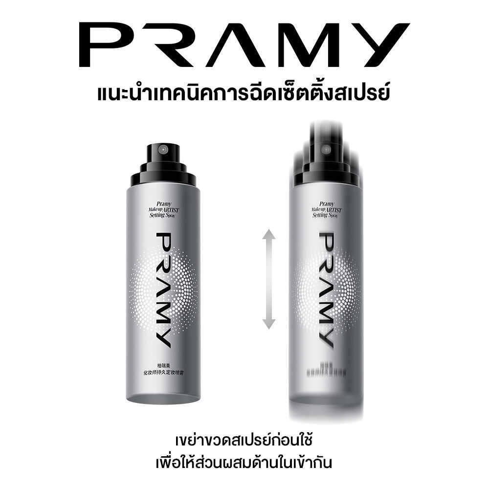 Pramy Makeup Artist Setting Spray 100ml สเปรย์ล็อกเมคอัพระดับโปร ให้เครื่องสำอางติดทนยาวนาน ฟินิชผิวธรรมชาติ สำหรับผิวมันและผิวผสม นวัตกรรมใหม่จาก Pramy Lab สิทธิบัตรเฉพาะ Lock-Makeup PRO Set Technology ละอองเปลี่ยนเป็นชั้นฟิล์มเคลือบผิวภายใน 5 วินาที พร้อมปกป้องเมคอัพให้ติดทนนานกว่าเดิม ไม่หลุดเลอะ กันน้ำ กันเหงื่อ ตอบโจทย์สำหรับผู้ทำกิจกรรมกลางแจ้ง เผชิญแสงไฟในสตูดิโอนาน หรือวันที่ต้องการให้เมคอัพติดทนยาวนาน