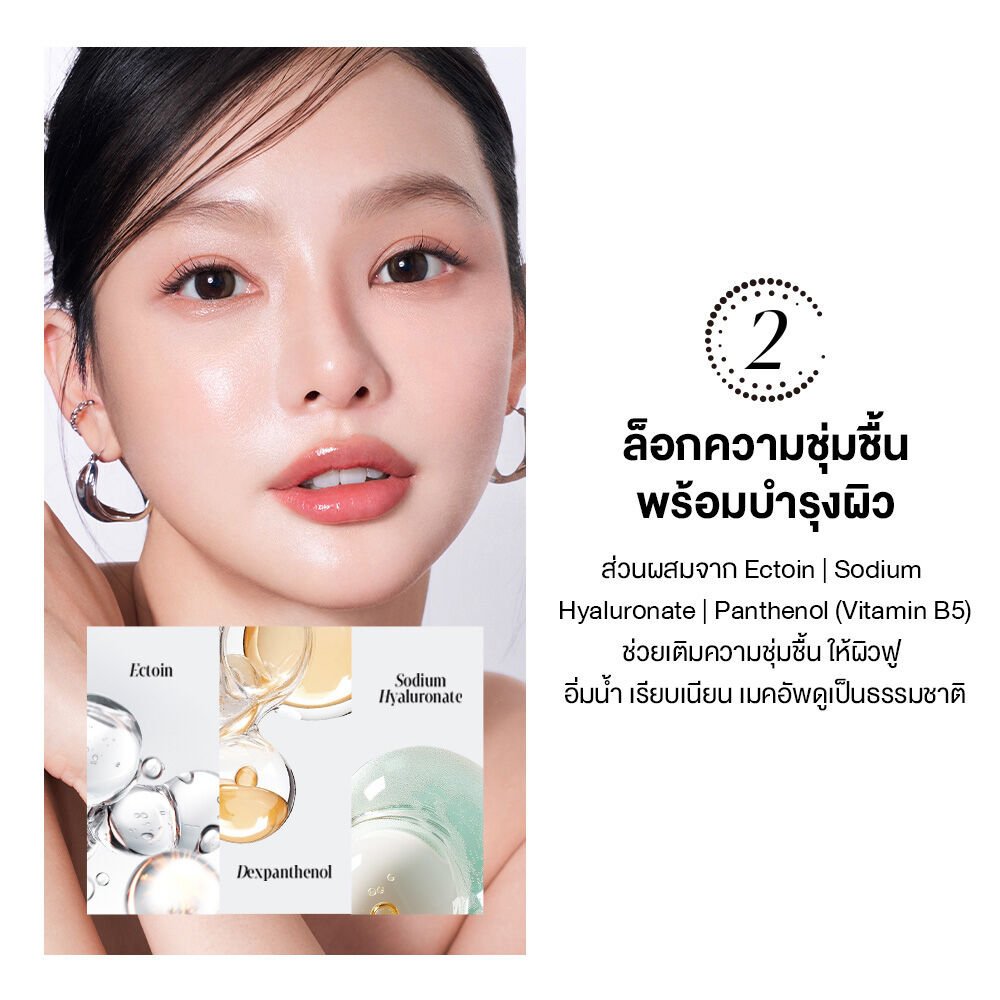 • ล็อกความชุ่มชื้นยาวนาน ด้วย Ectoin, Sodium Hyaluronate และ Panthenol (Pro-Vitamin B5) ช่วยให้ผิวหน้าชุ่มชื้น อิ่มน้ำ เรียบเนียน สดชื่น เมคอัพดูเป็นธรรมชาติ