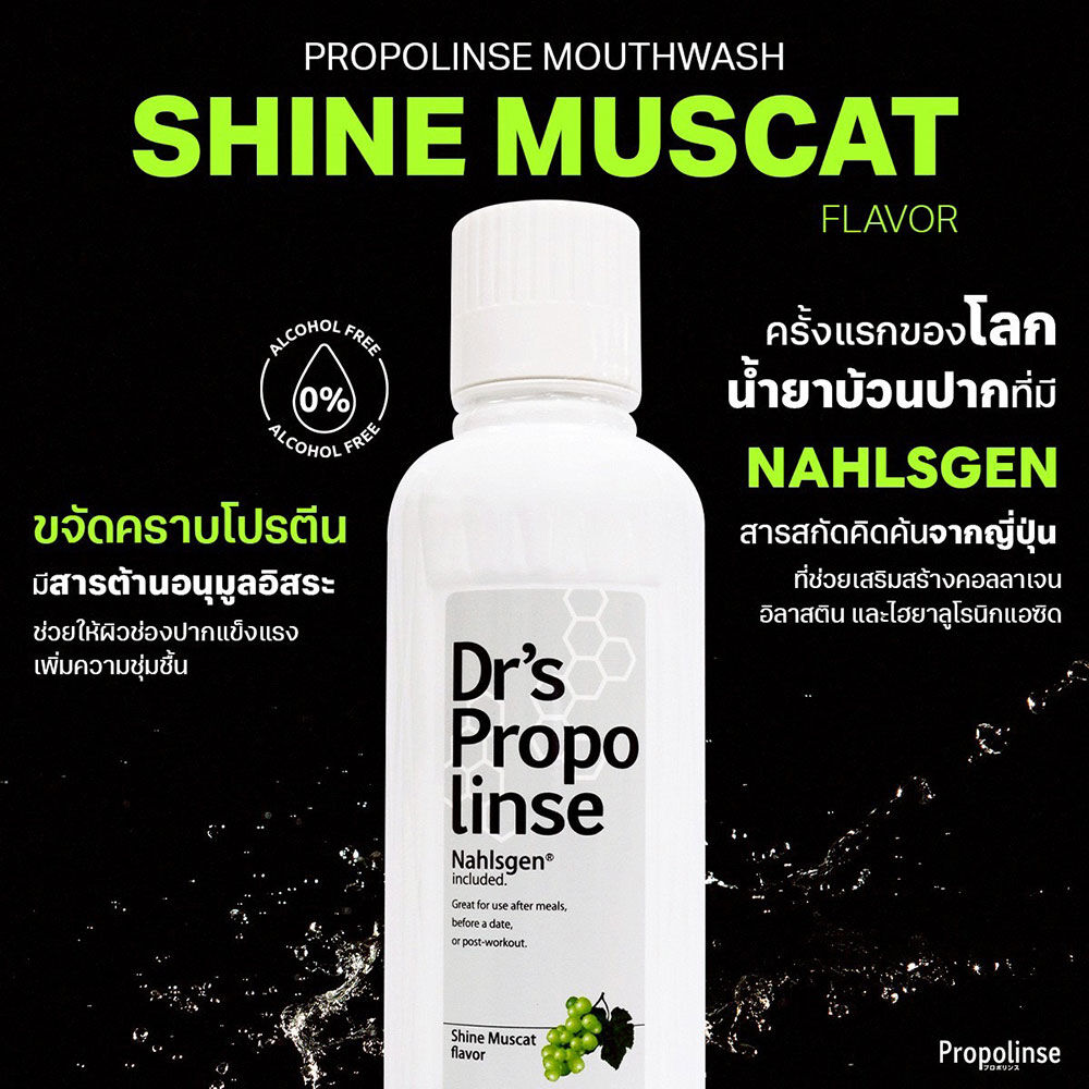PROPOLINSE Shine Muscat Mouthwash 150ml น้ำยาบ้วนปาก สูตรองุ่นไซมัสแคท กลิ่นหอมละมุน สดชื่นสไตล์ญี่ปุ่น ทำความสะอาดล้ำลึก ผสาน Nahlsgen สารสกัดคิดค้นโดยประเทศญี่ปุ่น ช่วยเสริมสร้าง Collagen, Elastin และ Hyaluronic Acid พร้อมช่วยให้ช่องปากแข็งแรง เพิ่มความชุ่มชื้น ขจัดคราบโปรตีนต้นตอของกลิ่นปากได้อย่างหมดจด