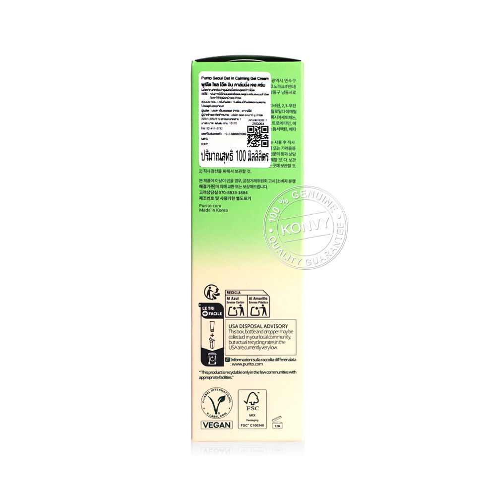 Purito Seoul Oat In Calming Gel Cream 100ml มอยเจอร์ไรเซอร์เนื้อเจลบางเบา ซึมซาบเร็ว ที่อุดมด้วยคุณค่าจากน้ำเมล็ดข้าวโอ๊ต (77% Gunsan Oat Seed Water) และ Panthenol ช่วยปลอบประโลมผิว ฟื้นฟูและกักเก็บความชุ่มชื้น พร้อมด้วย Squalane ช่วยคงสมดุลความชุ่มชื้นให้ผิว มอบผิวเนียนนุ่มชุ่มชื้น สุขภาพดี