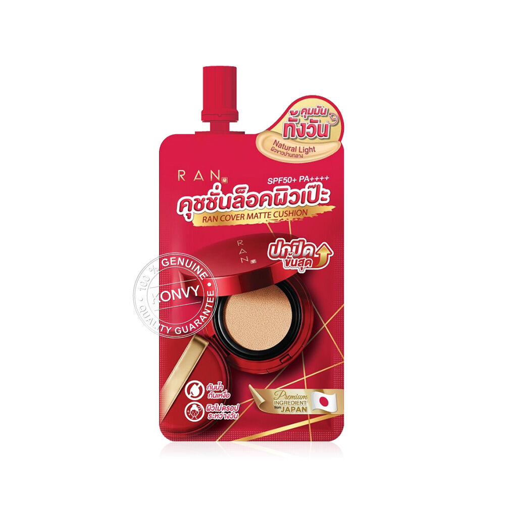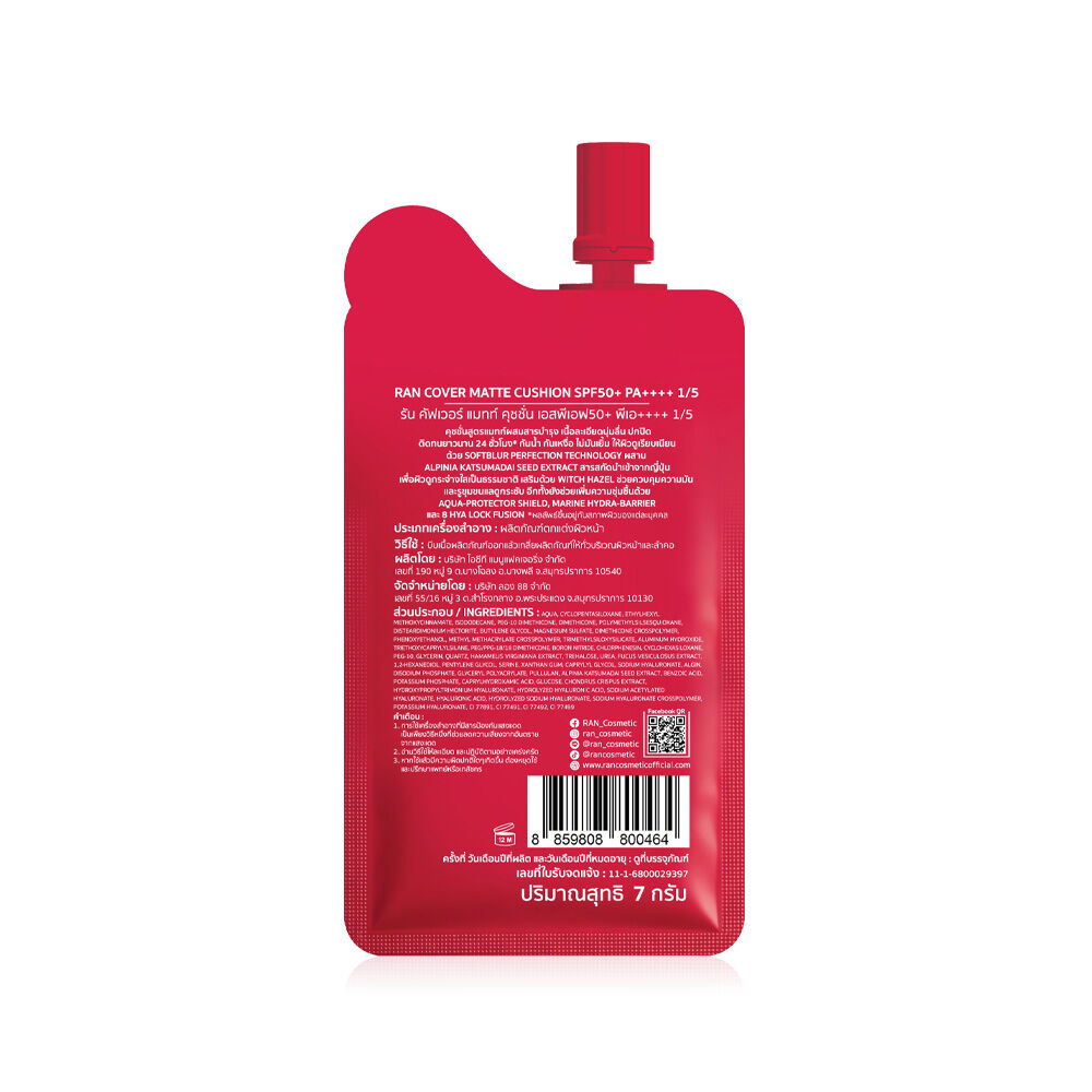 RAN Cover Matte Cushion SPF50+ PA++++ 7g #1.5 Natural Light คุชชั่นสูตรแมทผสมสารบำรุงแบบซอง เนื้อละเอียดนุ่มลื่น ปกปิดติดทน กันน้ำ กันเหงื่อ ไม่มันเยิ้ม ให้ผิวดูเรียบเนียนด้วย Softblur Perfection Technology ผสาน Alpinia Katsumadai Seed Extract สารสกัดนำเข้าจากญี่ปุ่น เพื่อผิวดูกระจ่างใสเป็นธรรมชาติ เสริมด้วย Witch Hazel ช่วยควบคุมความมันและรูขุมขนแลดูกระชับ อีกทั้งยังช่วยเพิ่มความชุ่มชื้นด้วย Aqua-Protector Shield, Marine Hydra-Barrier และ 8 Hya Lock Fusion