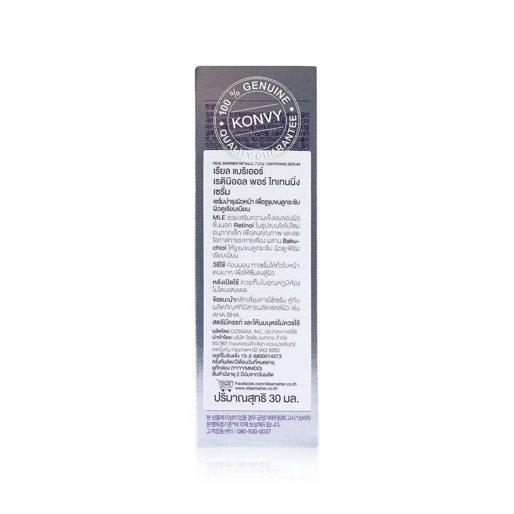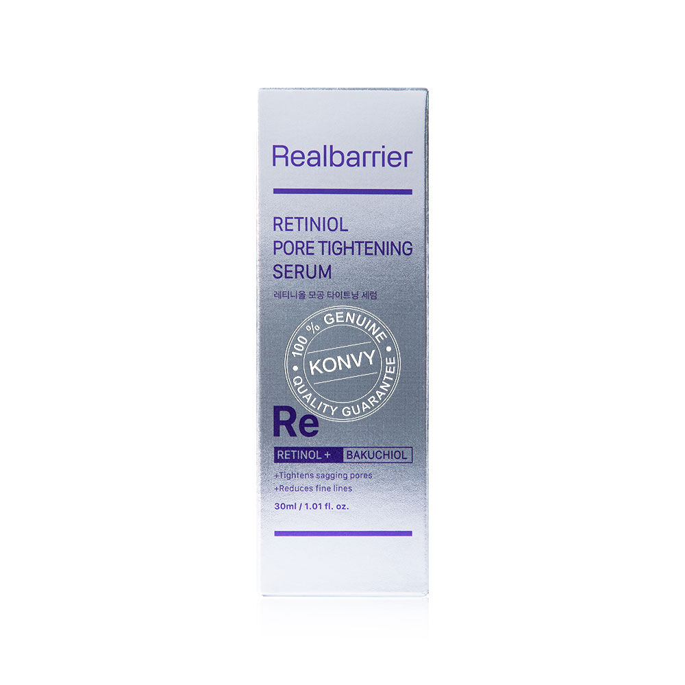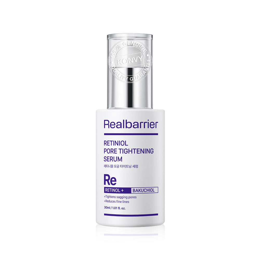 Real Barrier Retiniol Pore Tightening Serum 30ml เซรั่มบำรุงผิวหน้า เพื่อรูขุมขนดูกระชับ ผิวดูเรียบเนียน MLE ช่วยเสริมความแข็งแรงของผิวชั้นนอก Retinol ในรูปแบบไลโปโซมอนุภาคเล็ก เพื่อคงคุณภาพ และลดโอกาสการระคายเคือง ผสาน Bakuchiol ให้รูขุมขนดูกระชับ ผิวดูเฟิร์ม เรียบเนียน