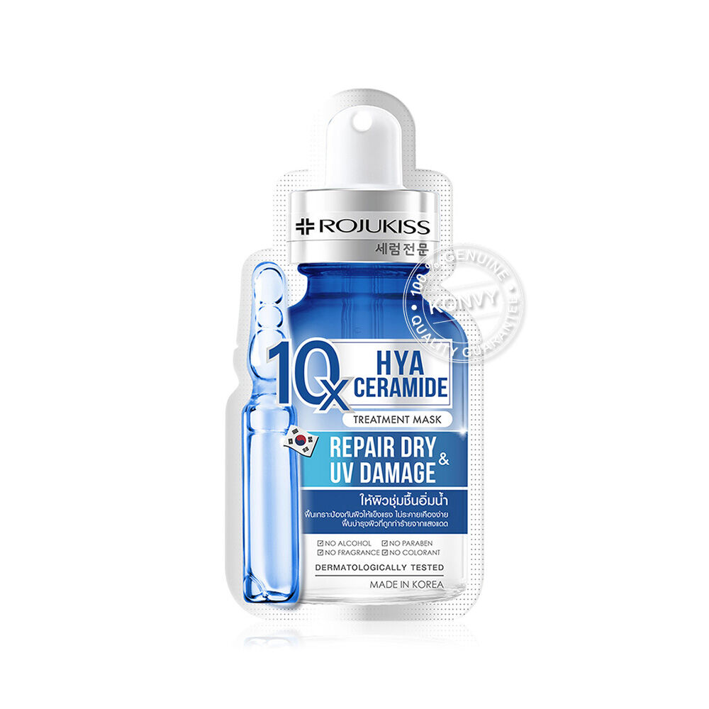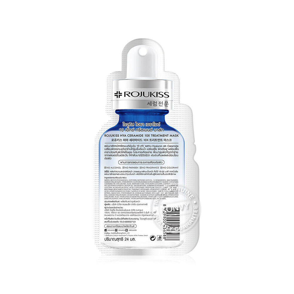 Rojukiss Hya Ceramide 10X Treatment Mask 24ml แผ่นมาสก์หน้าทรีตเมนต์เข้มข้น ผสาน Hyaluron และ Ceramide เปลี่ยนผิวหยาบแห้งกร้านให้ชุ่มชื้นอิ่มน้ำ เปล่งปลั่ง ผิวเด้งฟู พร้อมฟื้นเกราะป้องกันผิวให้แข็งแรง ไม่ระคายเคืองง่าย ฟื้นบำรุงผิวที่ถูกทำร้ายจากแสงแดดในแต่ละวัน ให้กลับมามีชีวิตชีวา