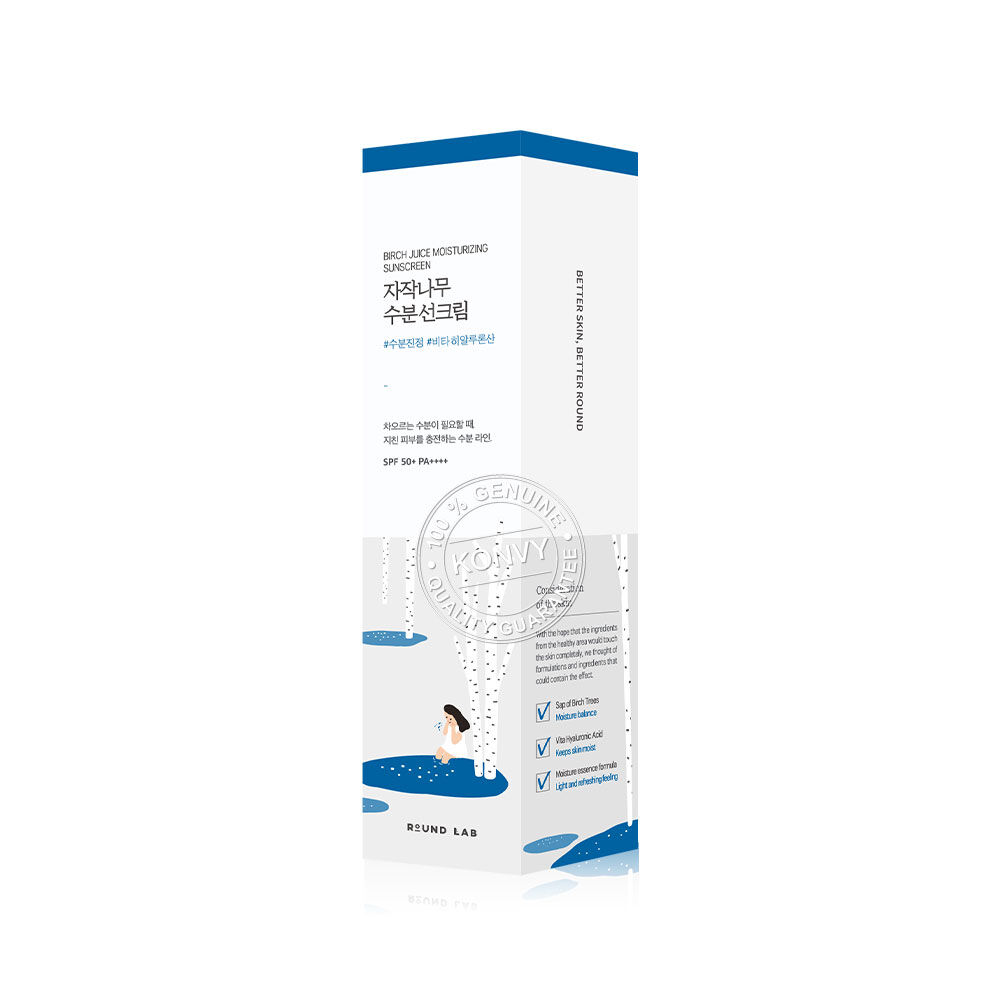 Round Lab Birch Juice Moisturizing Sunscreen SPF50+ PA++++ 50ml กันแดดเนื้อเอสเซนส์ สัมผัสบางเบา ซึมง่าย ไม่เหนอะหนะ ช่วยปกป้องผิวจากแสงแดดและรังสียูวีด้วย SPF50+ PA++++ มีสารสกัดจาก Birch Juice และ Hyaluronic Acid ช่วยปลอบประโลมผิว และเติมความชุ่มชื้นให้กับผิว