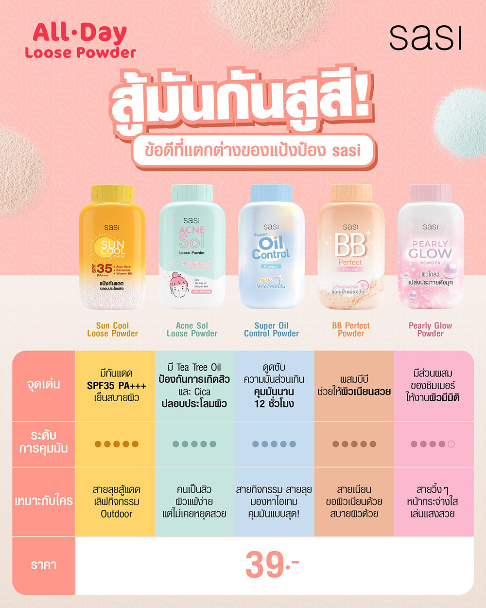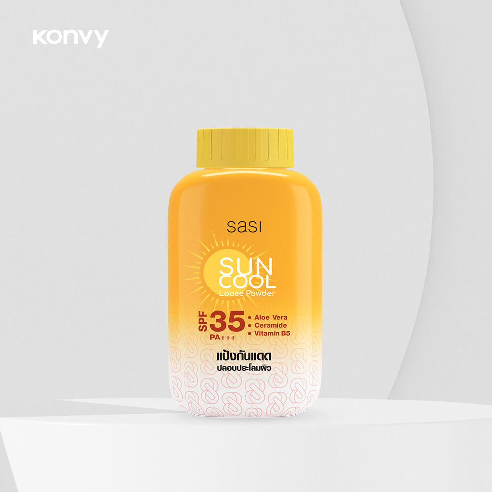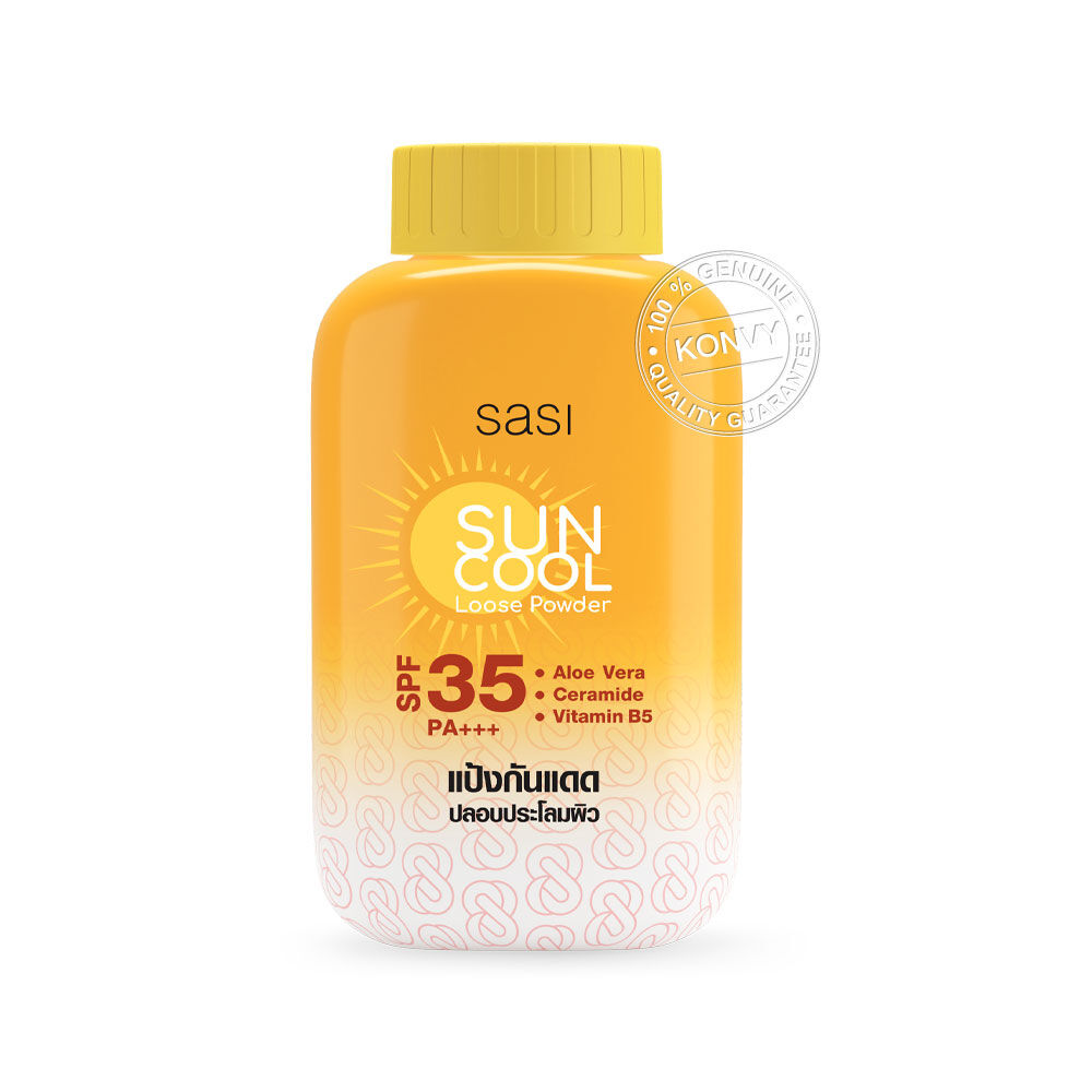 SASI Sun Cool Powder [50g x 3pcs] แป้งฝุ่นเนื้อละเอียดผสานสารกันแดด ปกป้องผิวจากรังสี UV และช่วยปลอบประโลมผิวเมื่อต้องออกแดด สร้างปราการผิวด้วย Ceramide ปกป้องให้ผิวแข็งแรงจากการทำร้ายของรังสี UV และมลภาวะ ปลอบประโลมผิวจากการระคายเคืองจากความร้อนด้วย Aloe Vera และมอบความชุ่มชื้นให้กับผิวด้วย Vitamin B5 รู้สึกเย็นสบายผิว ช่วยควบคุมความมันยาวนาน