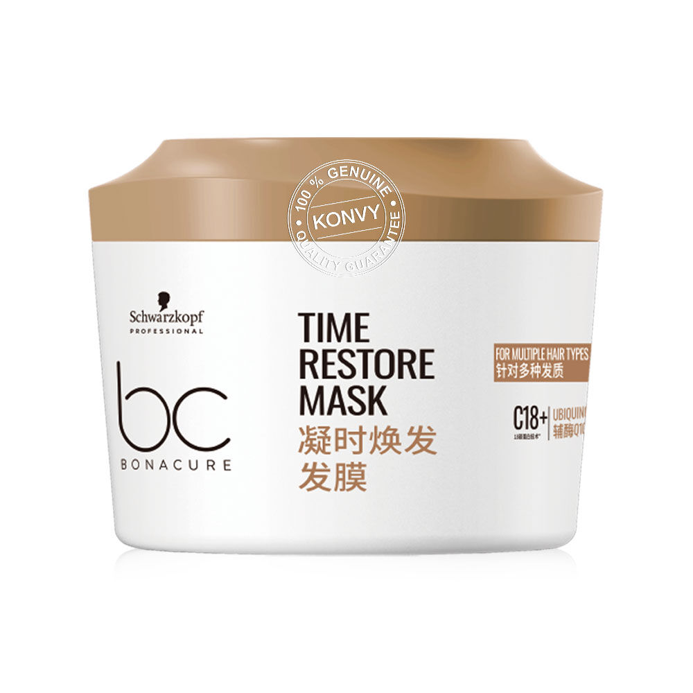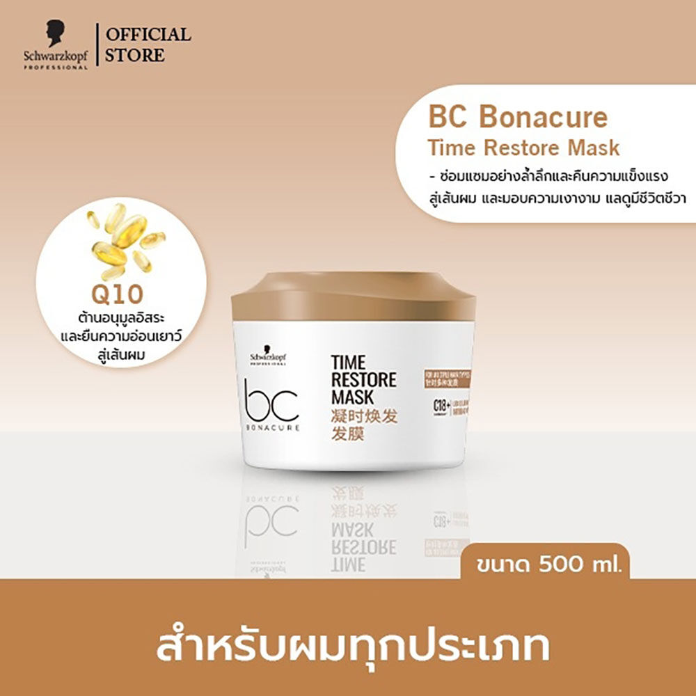 Schwarzkopf Professional Bonacure Time Restore Mask 500ml มาสก์บำรุงล้ำลึกเพื่อคืนความแข็งแรงและความเงางามให้ผมที่อ่อนแอหรือร่วงโรยตามวัย ช่วยให้ผมเรียบลื่น และสางง่ายขึ้น ด้วยเทคโนโลยี C18+ Targeted Repair ที่ซ่อมแซมลึกถึงโครงสร้างผม พร้อม Q10 ที่ช่วยให้ผมดูสุขภาพดี และมีชีวิตชีวา